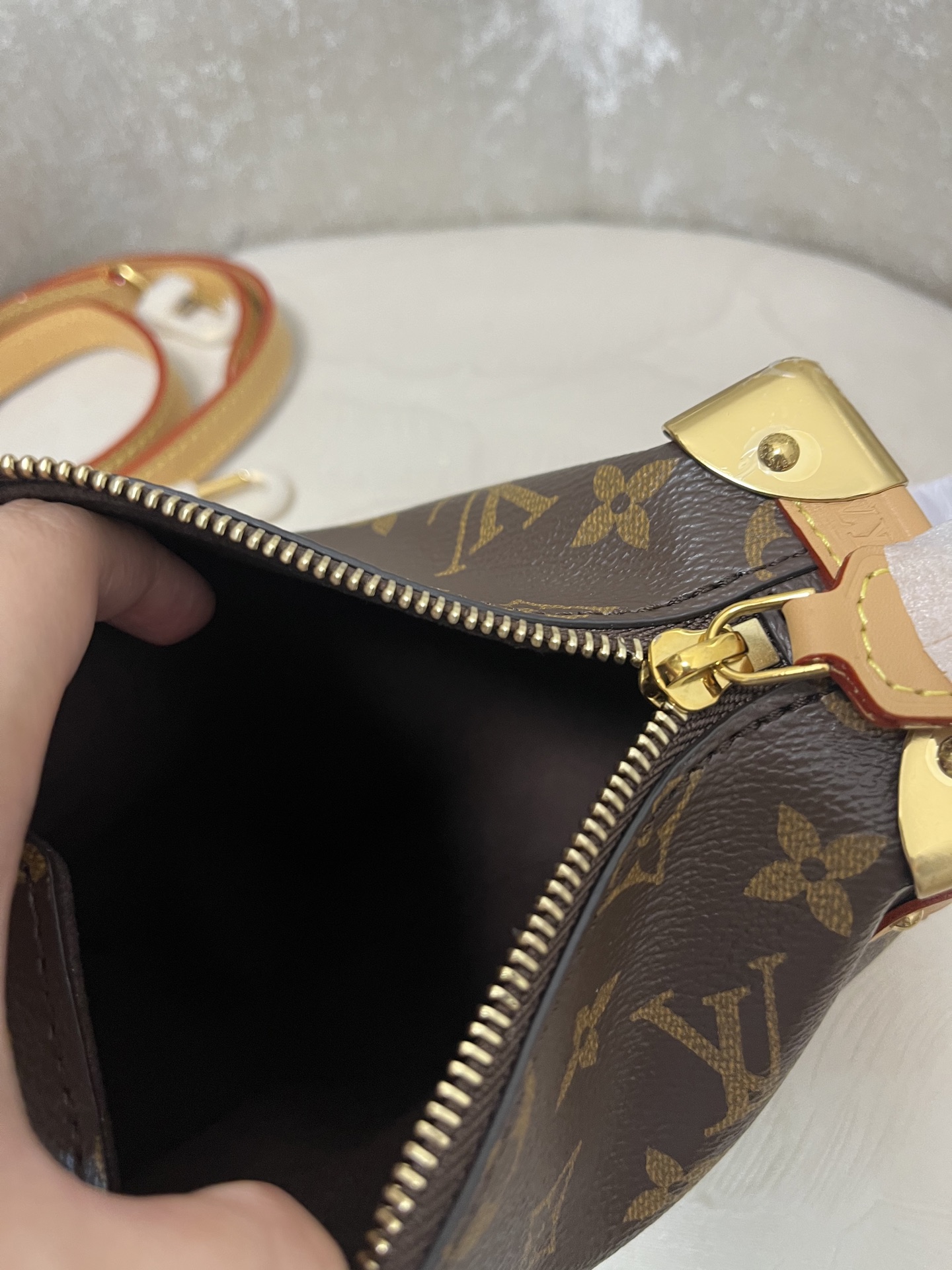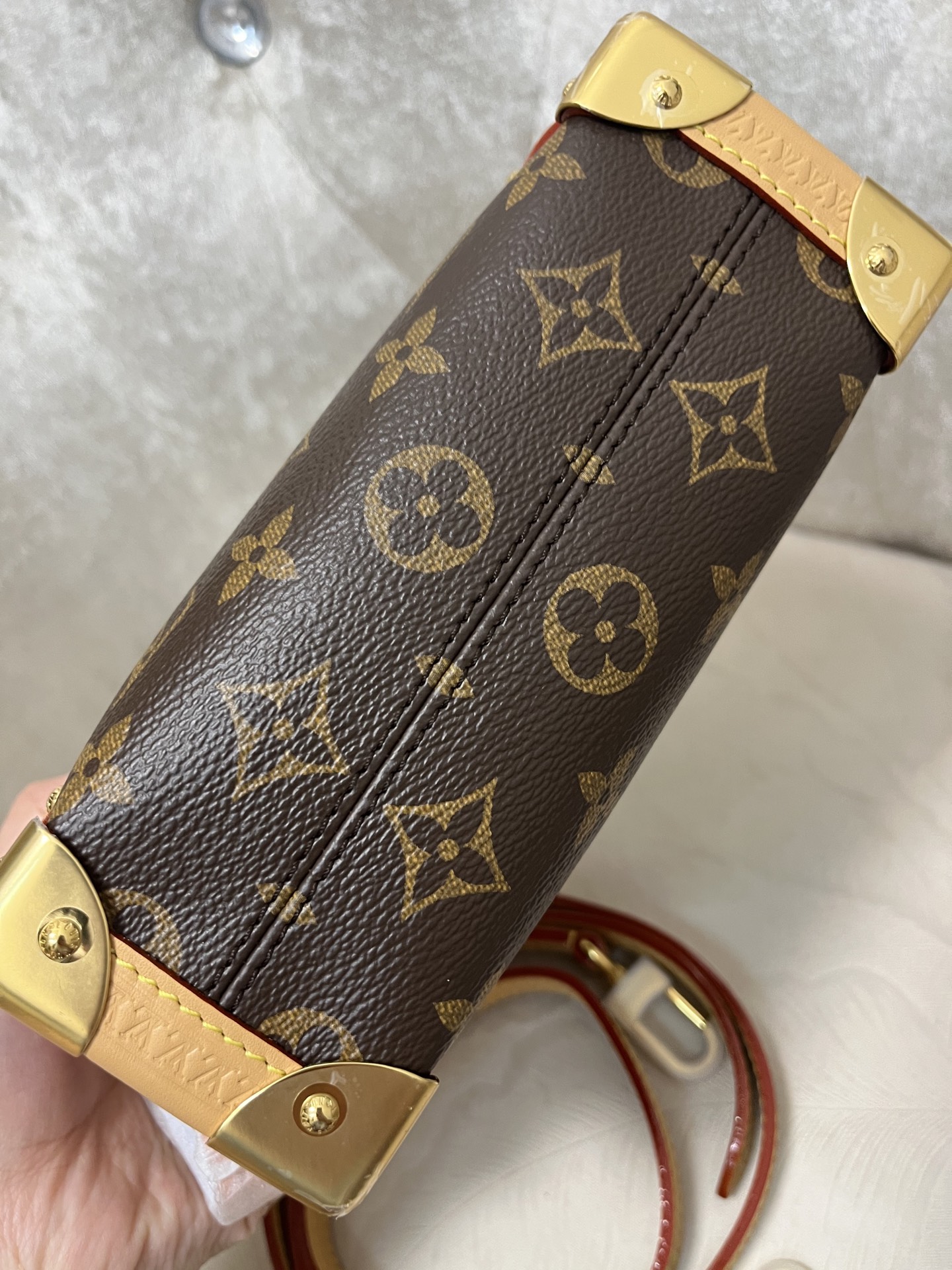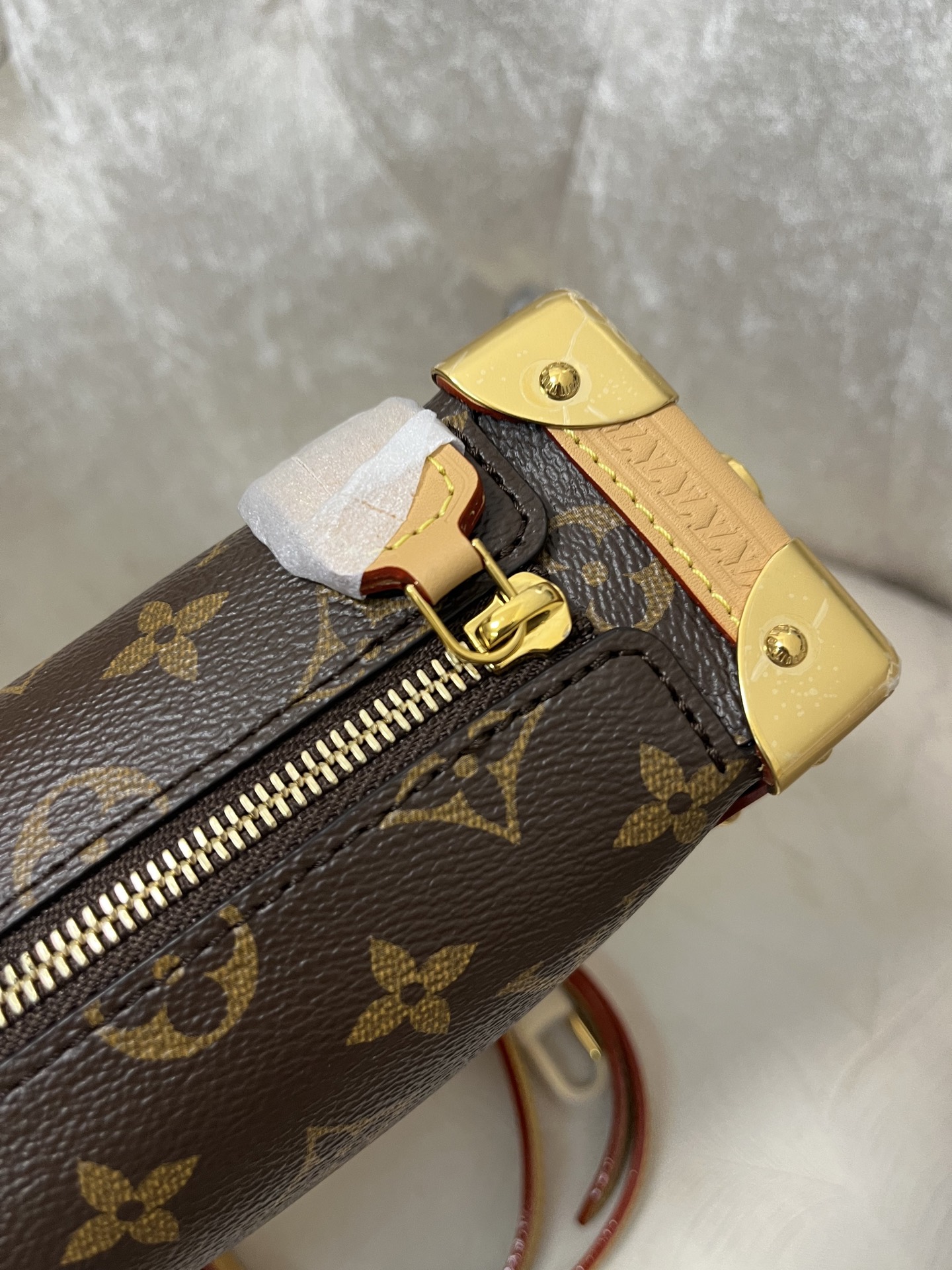 Returning to the House’s trunkmaking beginnings, Nicolas Ghesquière creates the Side Trunk MM handbag in Monogram canvas with leather trim. What strikes the eye is the singularity of the leather zip tab fitted with the iconic S-lock and the reinforced metallic corners. The wide top handle is removable as is the thin leather shoulder strap.