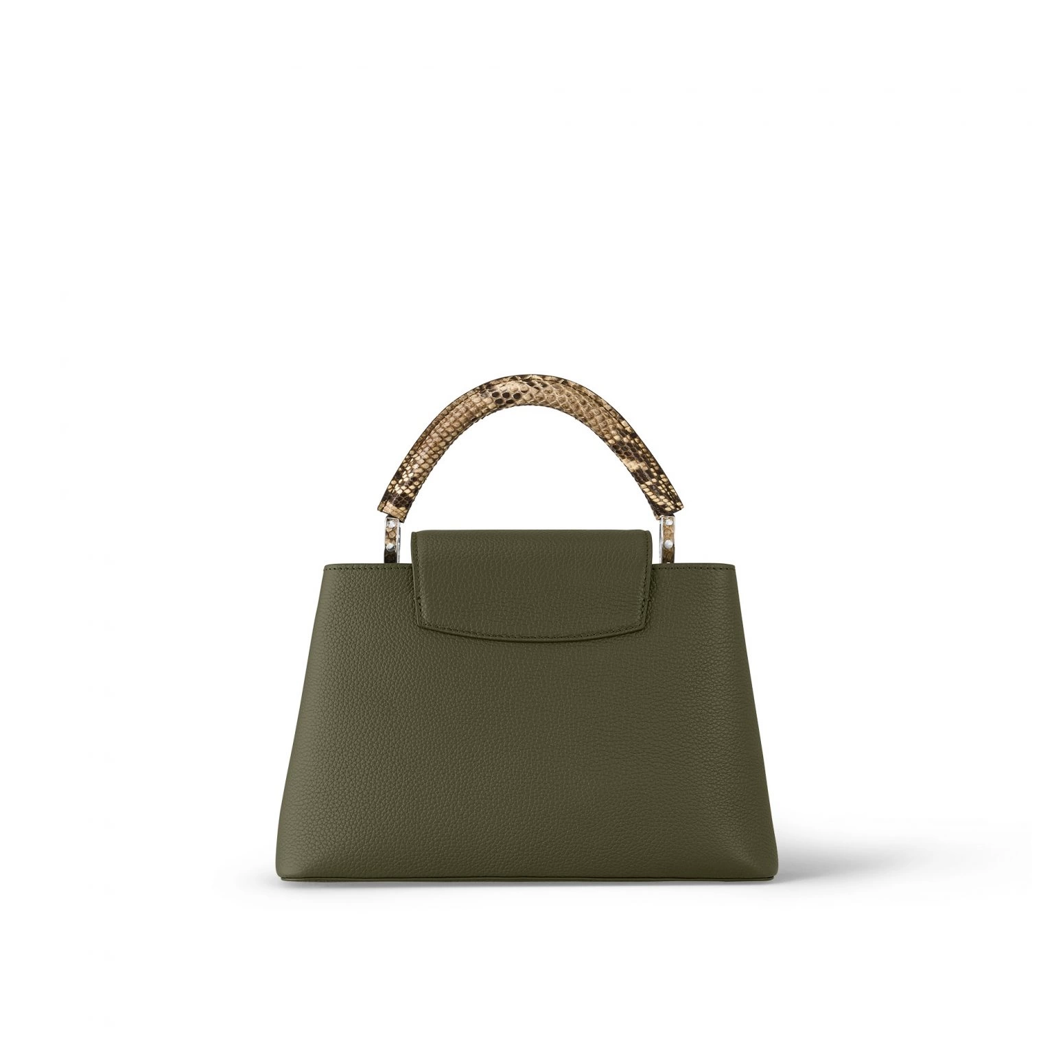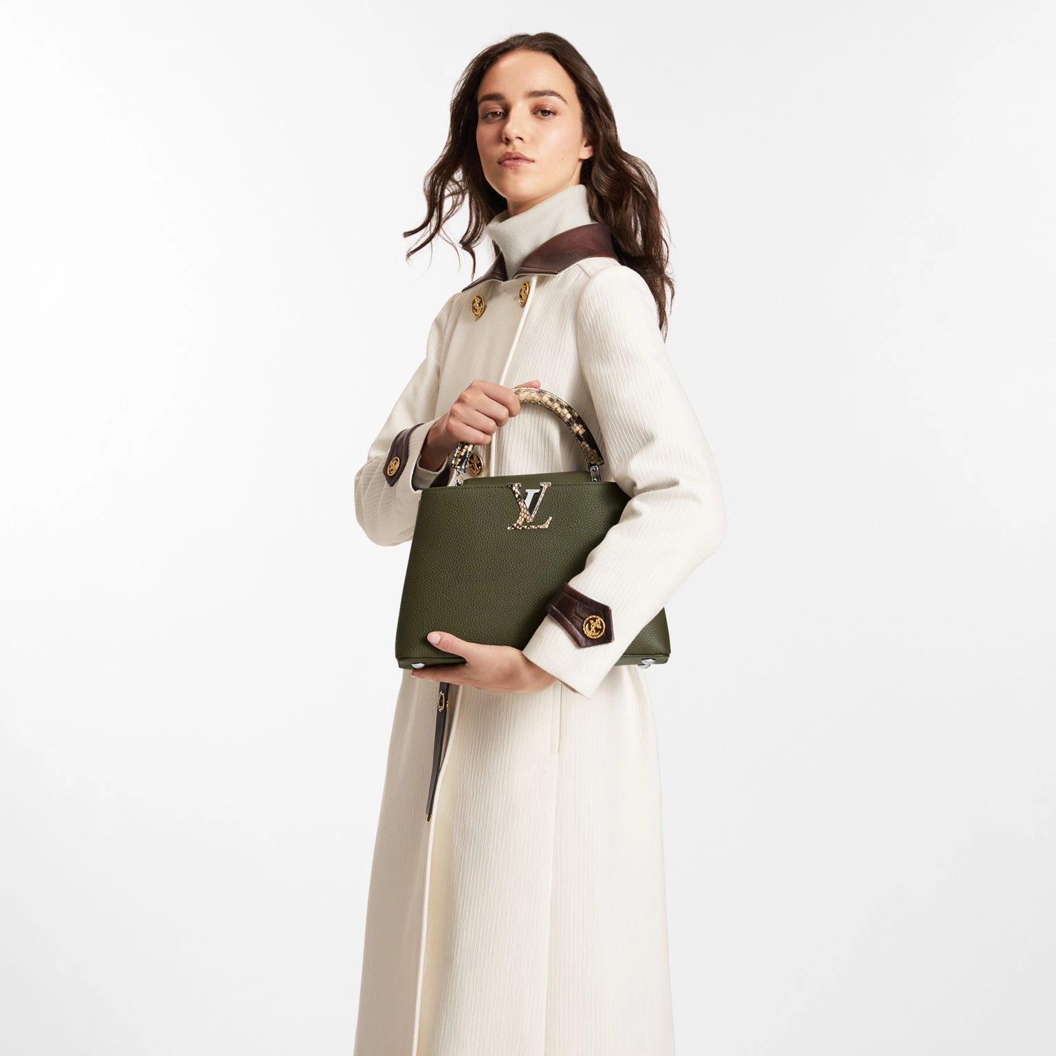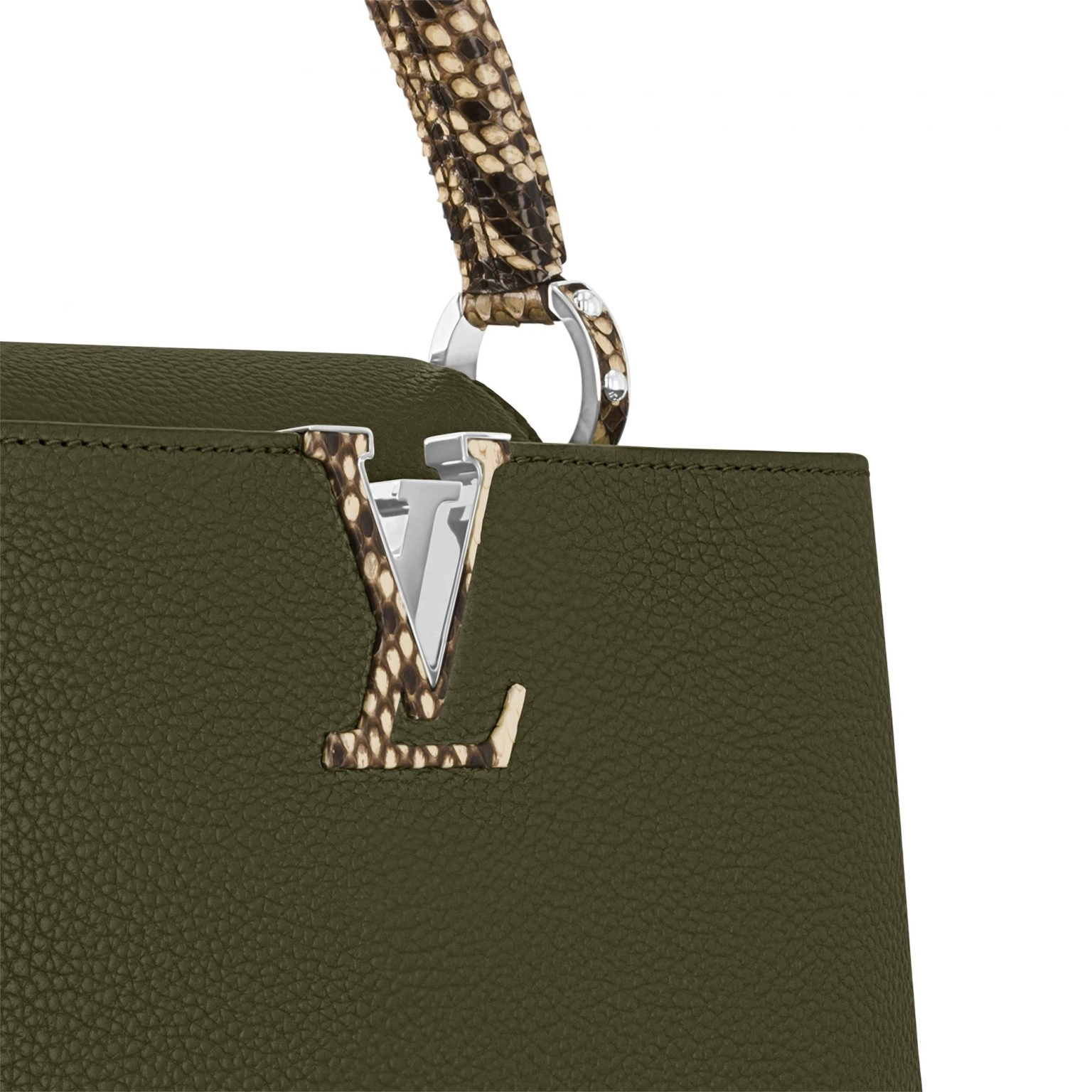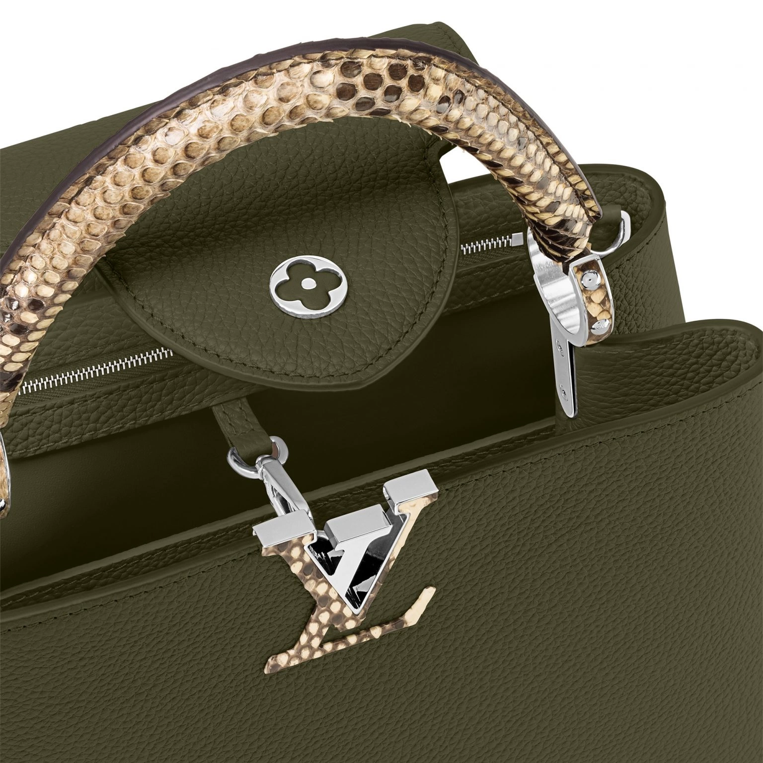 It was on the Rue des Capucines in Paris that the first Louis Vuitton store opened its doors. As timeless as the House itself, the Capucines bag brings chic sophistication to any look. Full-grain Taurillon leather combines with precious python to create a luxurious handbag accented with heritage details: the LV initials, the distinctive side rings and the subtle Monogram flower on the closing flap. With its top handle, removable strap and signature flap, this timeless model can be worn in several ways, to fit any outfit or mood.