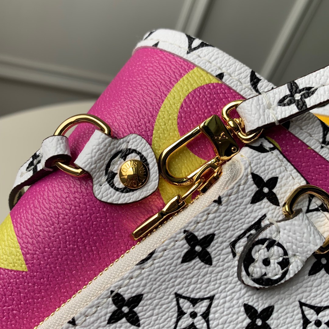 Playful, colorful, Neverfull: this season the iconic carryall wears a bold new spin on Monogram canvas. XL and Mini versions of the signature motif combine in sunny color palettes for a fun, summery look. Worn over the shoulder or carried on the arm, this MM model pairs perfectly with both beach and city looks.