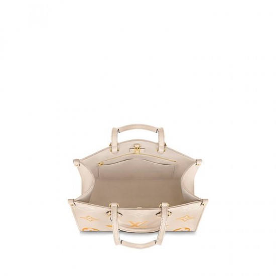 Made from a Monogram Empreinte leather with a subtle colour gradient on the embossed Monogram pattern, the emblematic OnTheGo MM tote bag is part of the By The Pool capsule collection. It has two sets of handles, long and short, for hand and shoulder carry and a spacious interior, which easily fits essentials such as a laptop. A leather charm gives a playful spirit and highlights the LV craftsmanship.