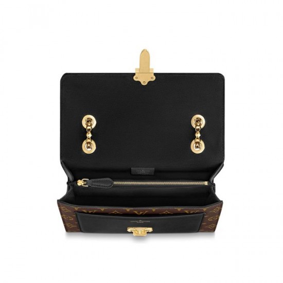 The Victoire chain bag pairs Monogram canvas with smooth colored leather for a sophisticated day-to-evening accessory. The golden clasp is modeled on the lock of classic Louis Vuitton luggage, while the sliding chain strap echoes the Malletage print that lined those historic trunks. Large enough to fit a long wallet, the bag can be worn cross-body or short-shoulder style.