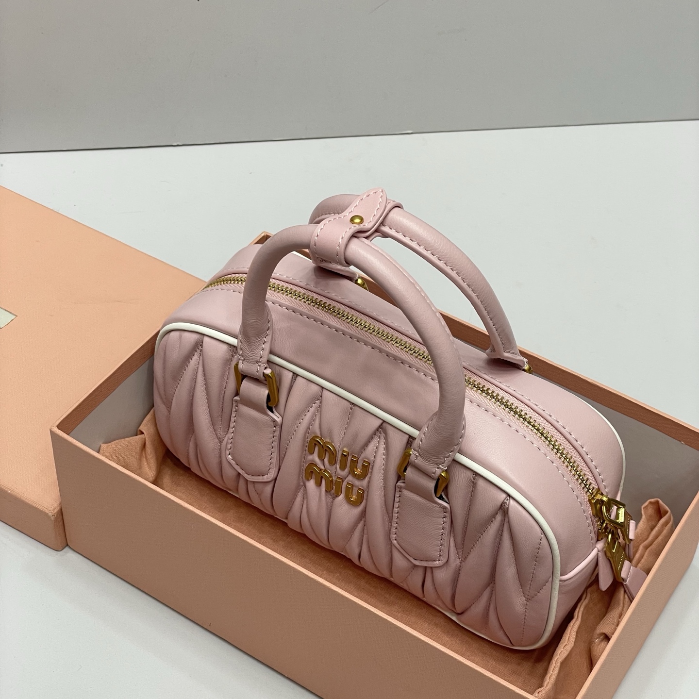 The iconic MIU MIU crinkled leather baguette now comes in a dreamy blossom pink shade – the must-have pastel for the season!