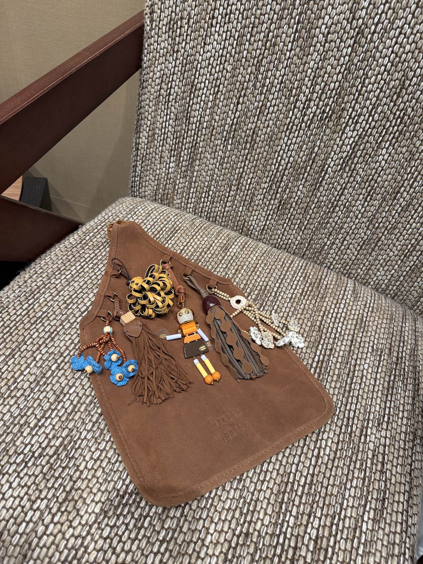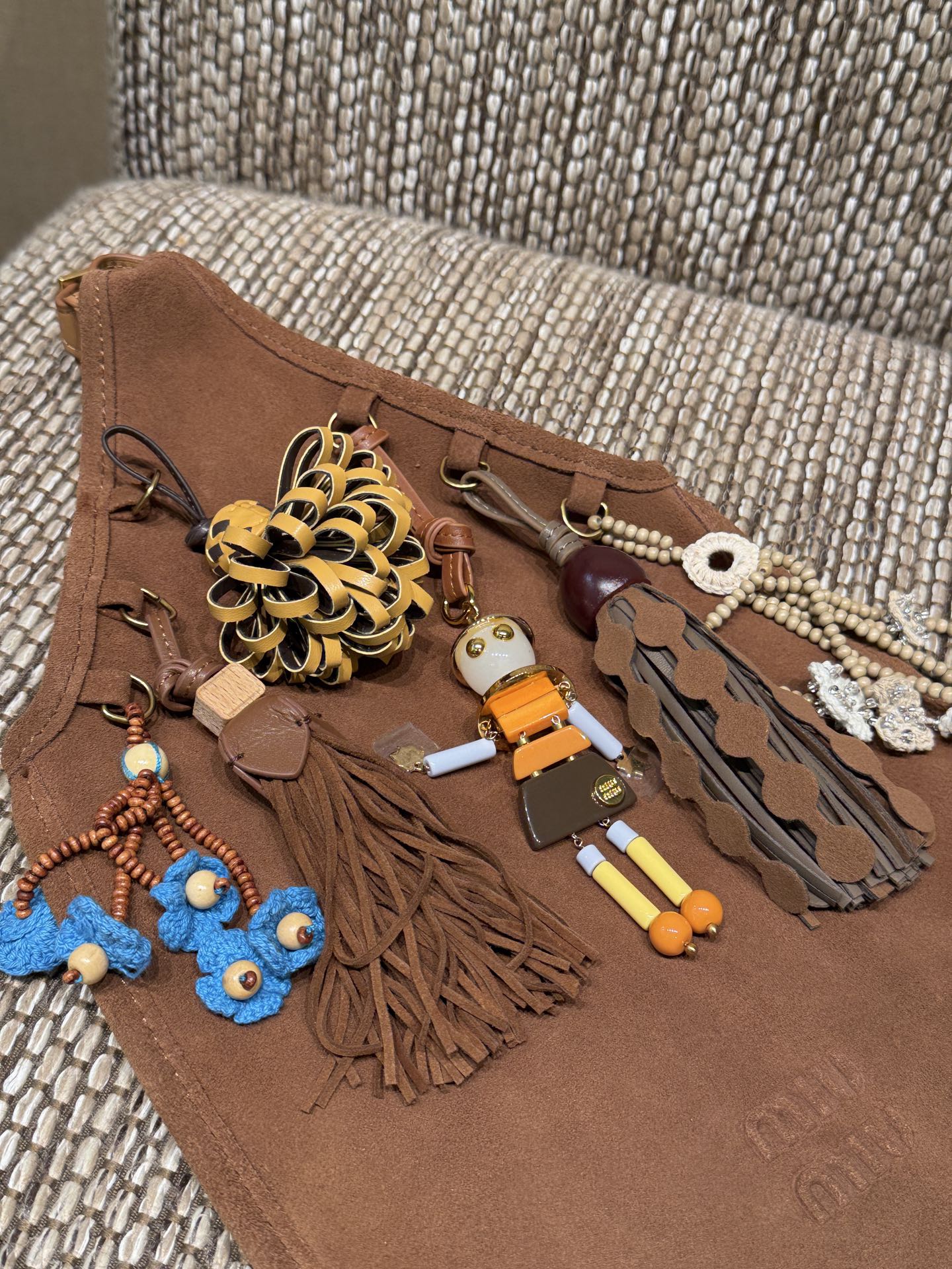Elegant, soft suede is combined with the playful character of small removable tricks that embellish this hobo bag, a perfect interpretation of runway inspirations and Miu Miu's Messy-Chic character.