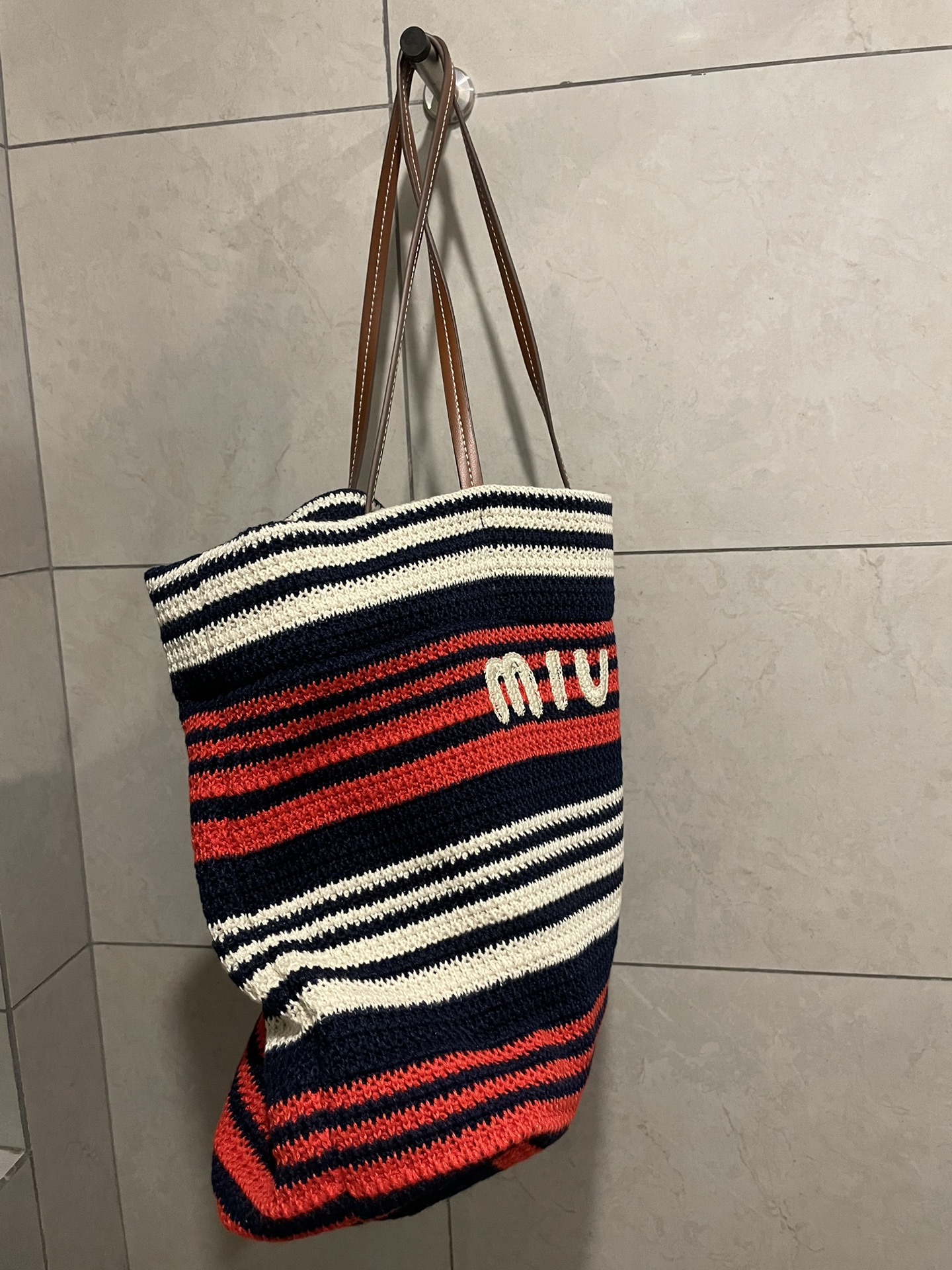 Miu Miu’s new imported raffia woven tote bag features the iconic Miu Miu embroidery on the front. It’s lined with cotton fabric, ultra-lightweight, and offers an oversized capacity—perfect for travel and suitable for all seasons. The actual bag is stunningly beautiful. Dimensions: 40 x 34 x 16 cm