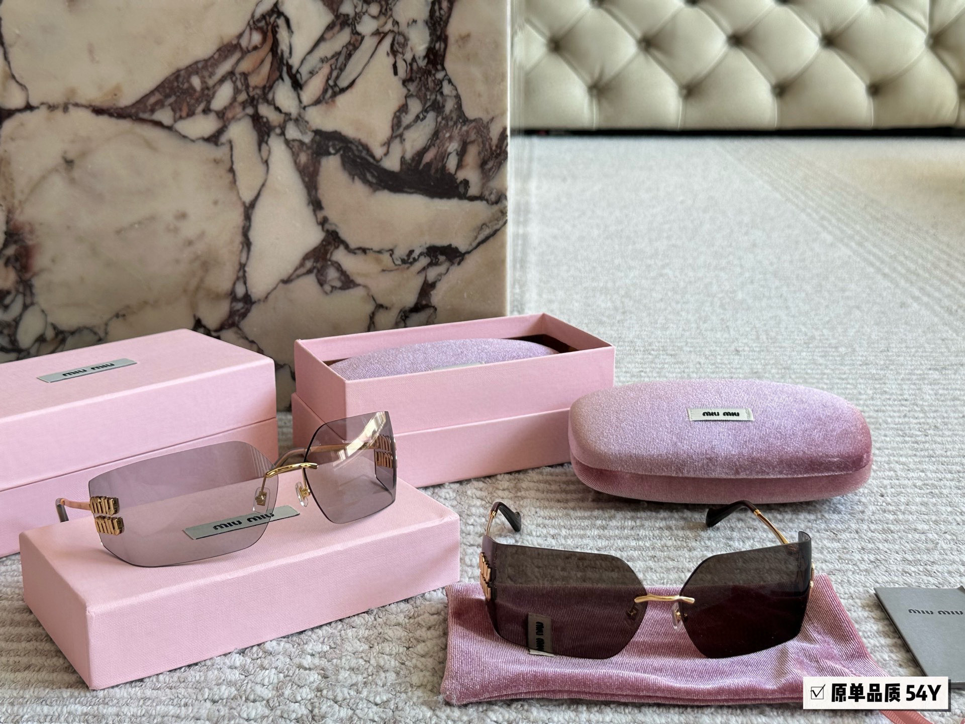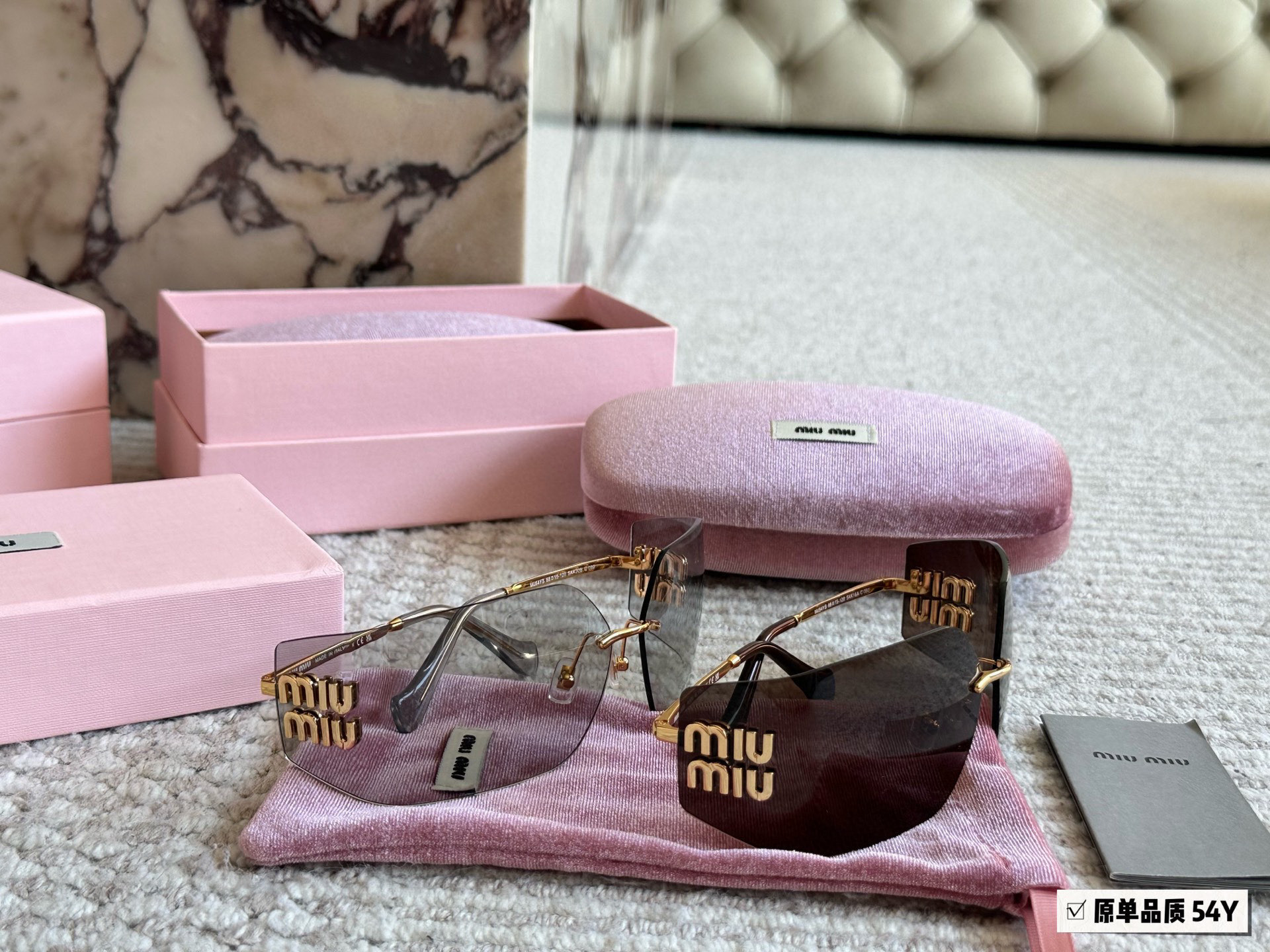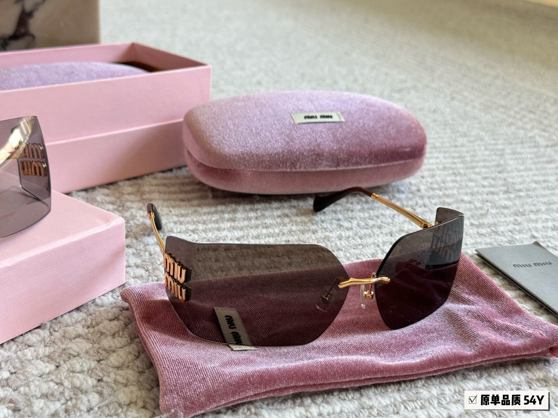 Metal sunglasses with a sophisticated, contemporary design. The ultra-light rimless style is characterized by the curved lenses embellished with the imposing vertical Miu Miu logo.