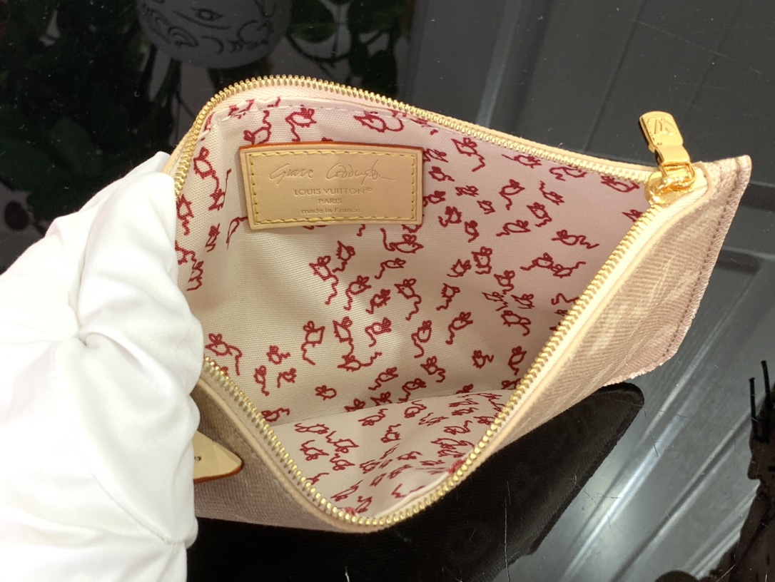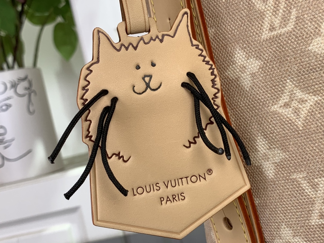 This version of the All In GM features the House's Meowgram signature, designed by fashion icon and artist Grace Coddington. Created exclusively for the LV Travels With collection, it is made from canvas trimmed with cowhide and features a playful cat-shaped key bell. The bucket profile is sized to fit everyday essentials, including a laptop, and comes with a removable zipped pouch.