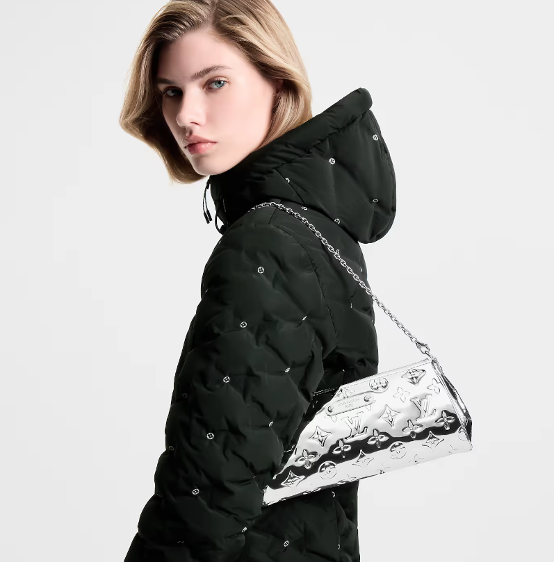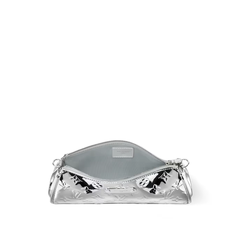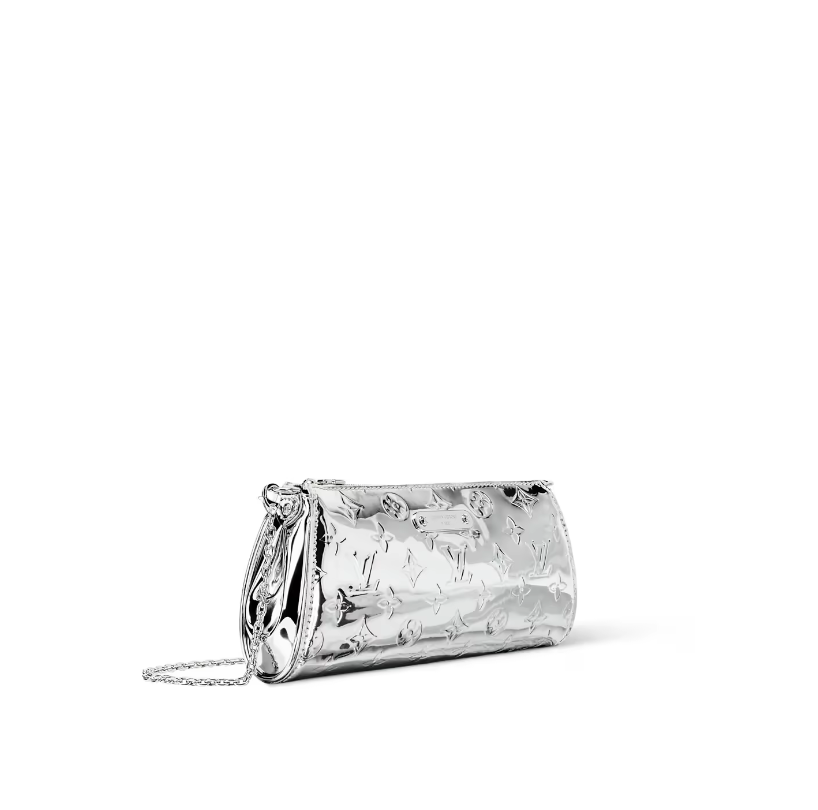 Crafted in silver Monogram Miroir canvas, this Pochette Eva is a statement choice for day or night. Reimagined for the LV Ski collection, it is designed with a removable chain offering multiple carry options, and fits essential items such as a small wallet and phone. Louis Vuitton is engraved on the small plaque across the front.
