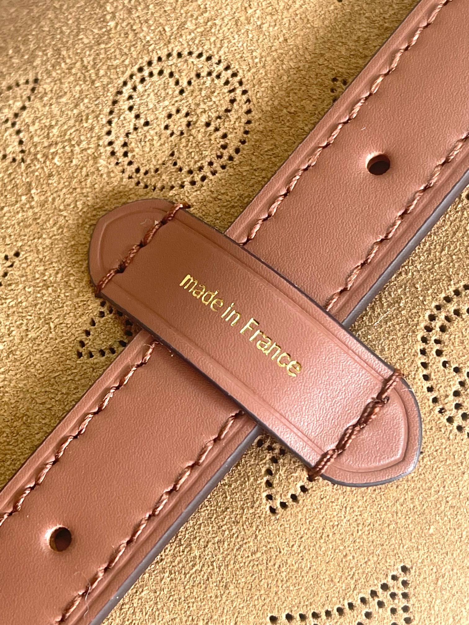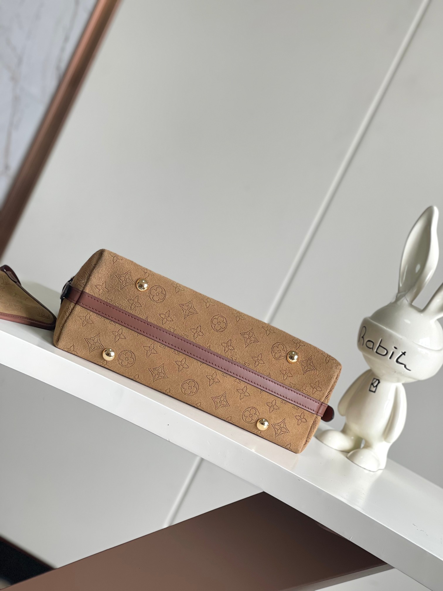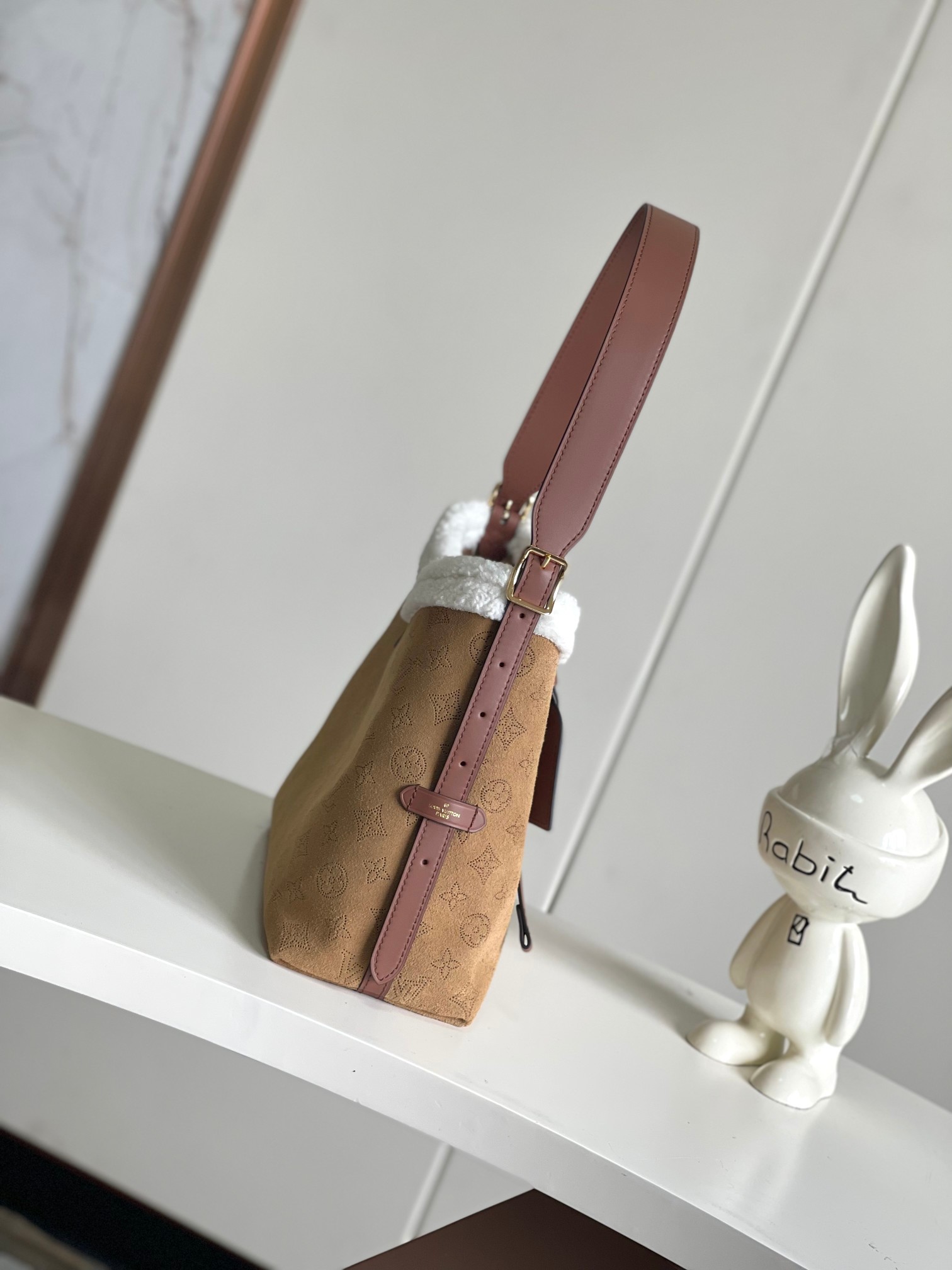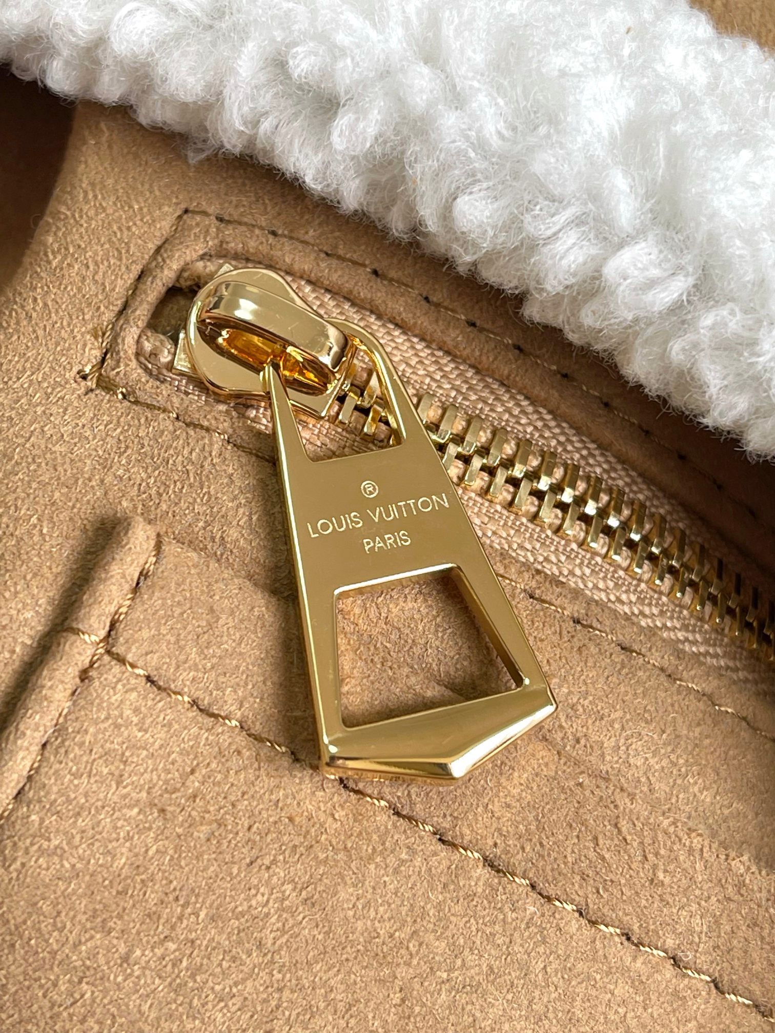 The iconic CarryAll PM adopts a warm and winter style with this luxurious edition from the LV Ski collection. It is crafted from Mahina suede adorned with Monogram perforations and is trimmed with merino-sourced shearling for a cozy finish. The capacious design secures with a magnetic closure and leather ties, and will comfortably fit a long wallet, as well as other daily essentials.
