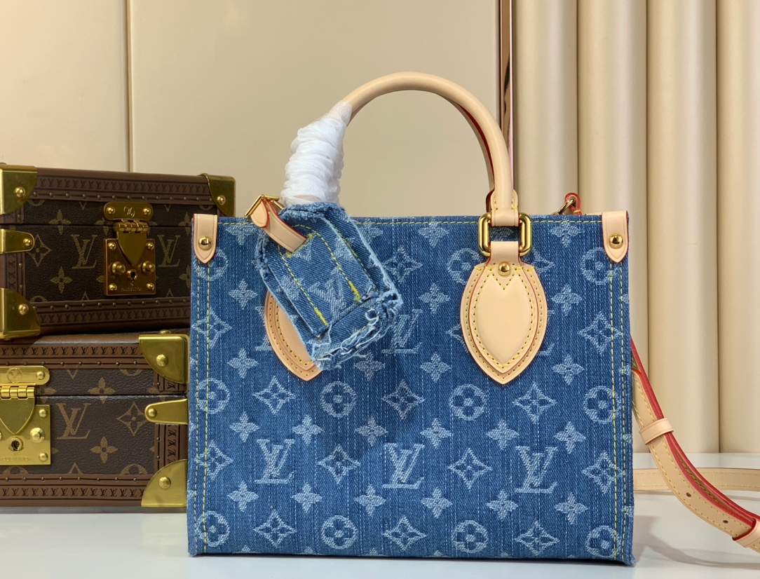 This OnTheGo PM showcases the return of the House’s iconic Monogram denim, accented with signature natural cowhide leather trims. The versatile handbag is refined with gold-tone hardware and secures with a magnetic flap closure. Sized to store a tablet amongst other everyday essentials, it can be carried by hand or worn cross-body thanks to the removable strap.