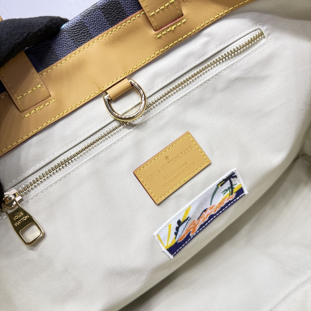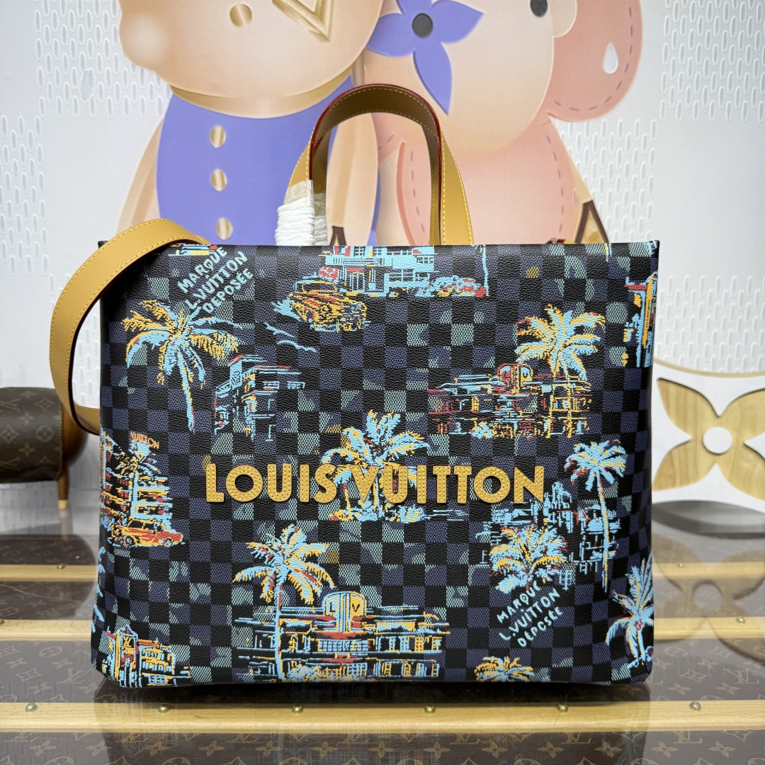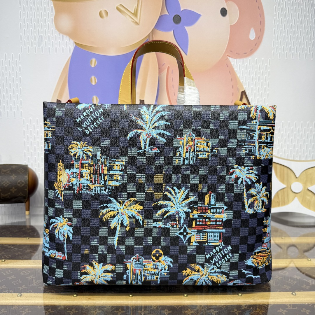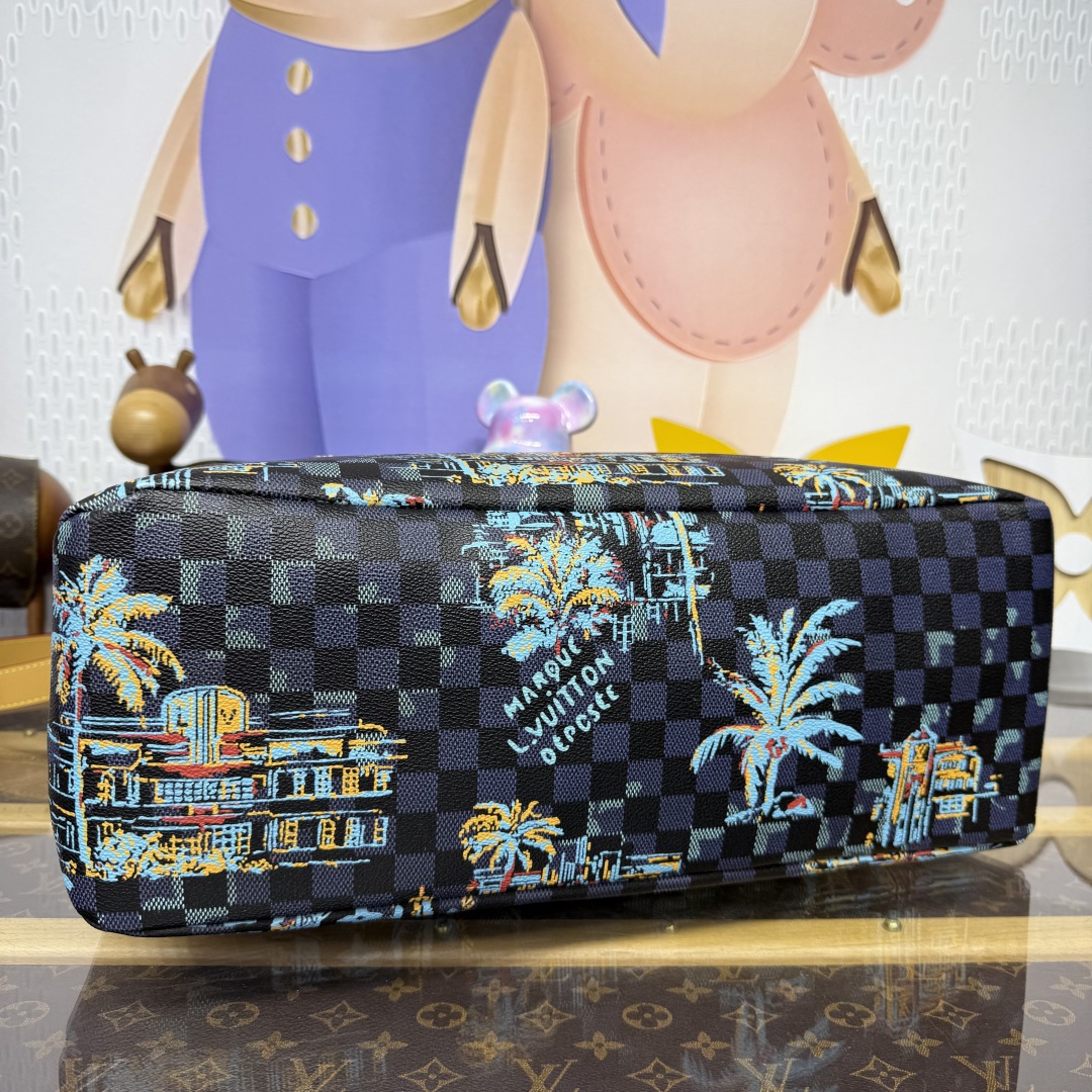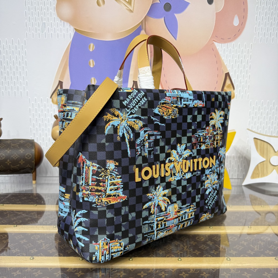 This Shopper Tote in jacquard cotton features a motif inspired by vintage Miami postcards. Capturing the city's vibrant nightlife, the pattern showcases Miami symbols such as palm trees, iconic buildings, and a vintage car on a Marina blue background. Almost hidden in this sumptuous decor is the iconic “Marque déposée L.Vuitton” signature, embraced by Pharrell Williams.