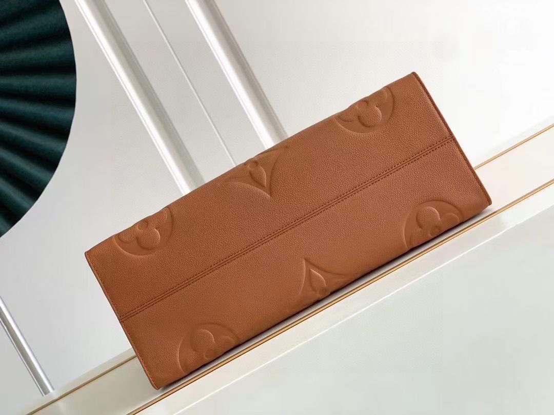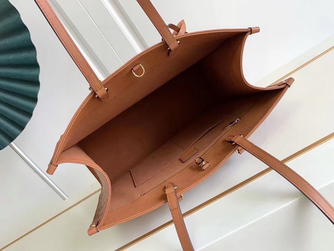 his versatile OnTheGo GM tote bag is made from Monogram-embossed leather, dyed a rich Cognac Brown. Its rectangular design and roomy interior make this carryall great for business, shopping, or travel. It has rolled-leather top handles and long shoulder straps, allowing numerous comfortable carry styles.