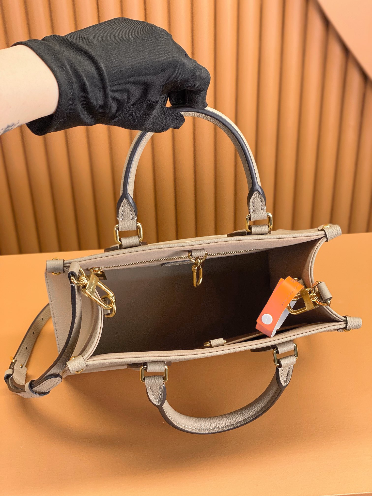 Inspired by Louis Vuitton’s famous Sac Plat from 1968, the Onthego PM tote is fashioned in Monogram Empreinte leather, embossed with a Giant Bicolor Monogram pattern. This smaller version of the original Onthego fits essentials such as an iPad Mini. Articulated top handles and an adjustable removable strap offer a variety of carry options.