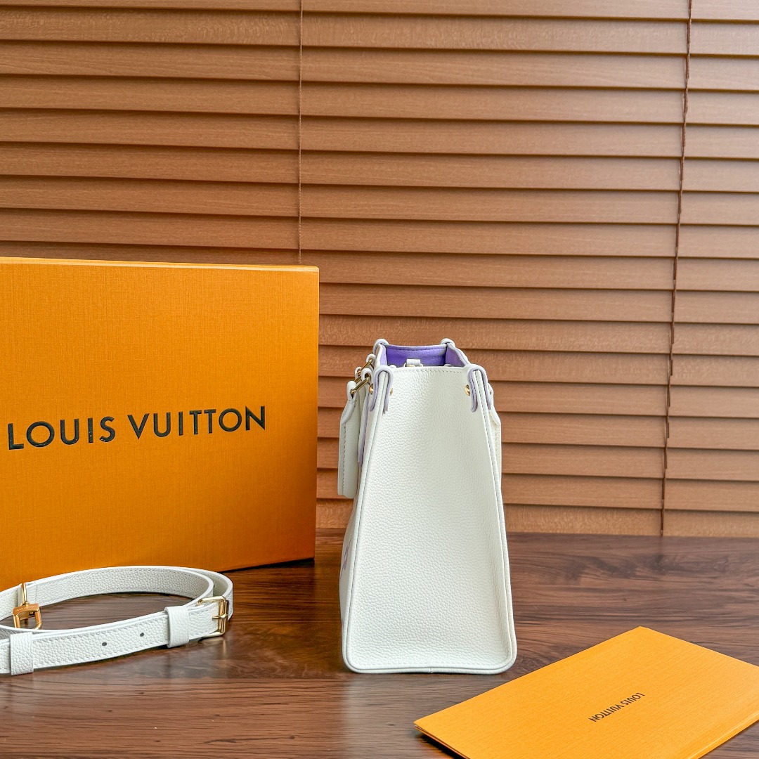 The subdued pastel colorway of this OnTheGo MM small tote in Monogram Empreinte leather brings a fresh feel to this practical bag. Large enough to carry a 13-inch laptop, it features two sets of handles, long and short, for hand and shoulder carry. Touches of pastel around the handle mounts and corner tabs complete the picture.