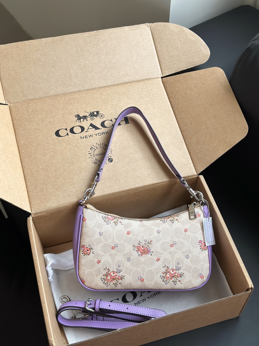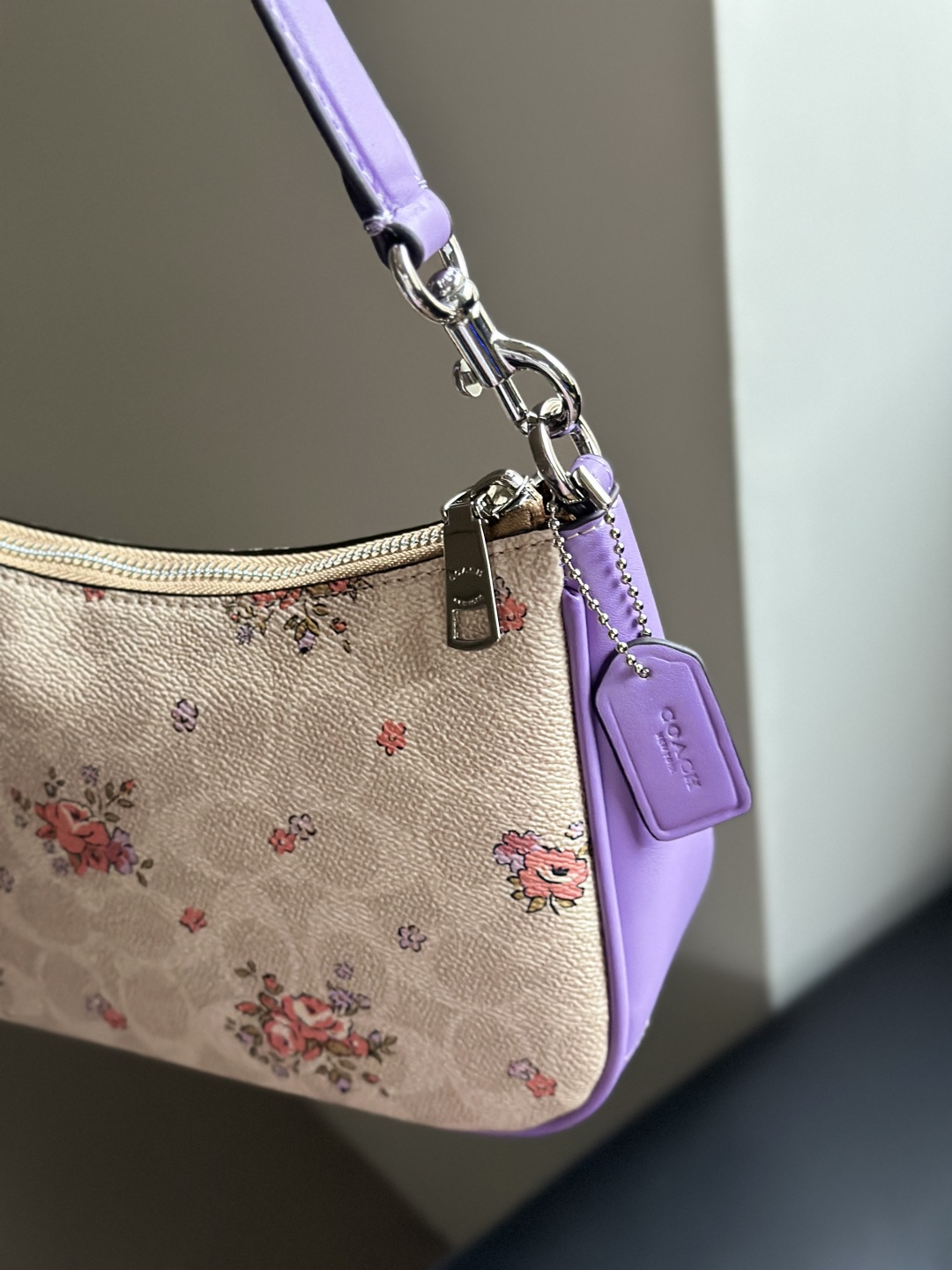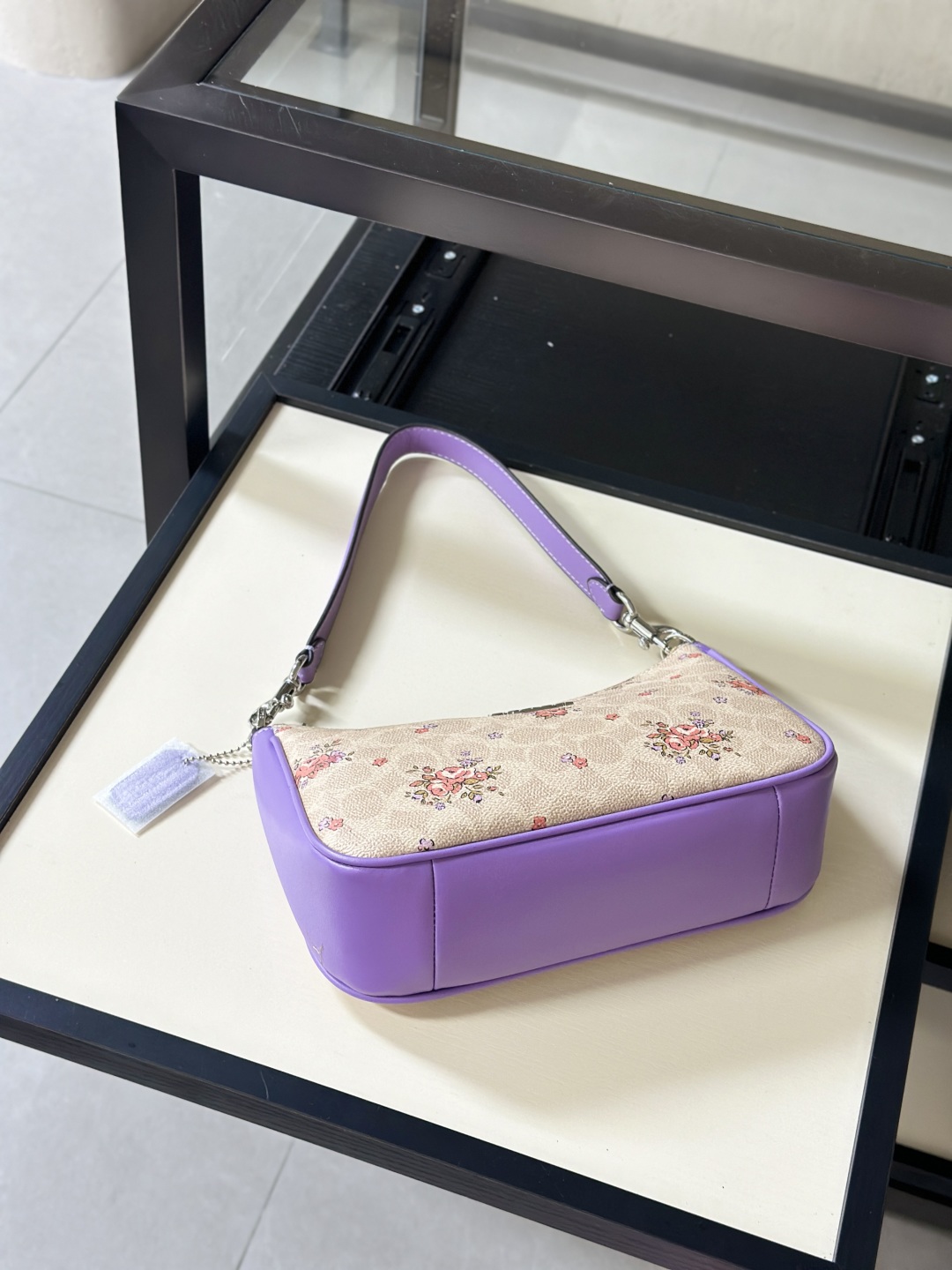 Inspired by the vibrant charm of a spring garden, this Coach purple floral shoulder bag blends elegance with modern style. Crafted from premium leather with a soft, smooth touch, it features a delicate floral print on a rich purple background for a fresh and feminine look.
