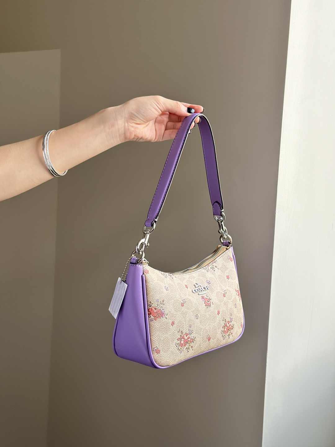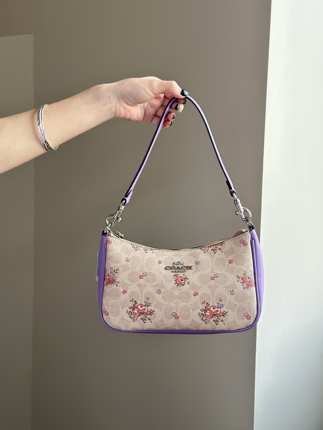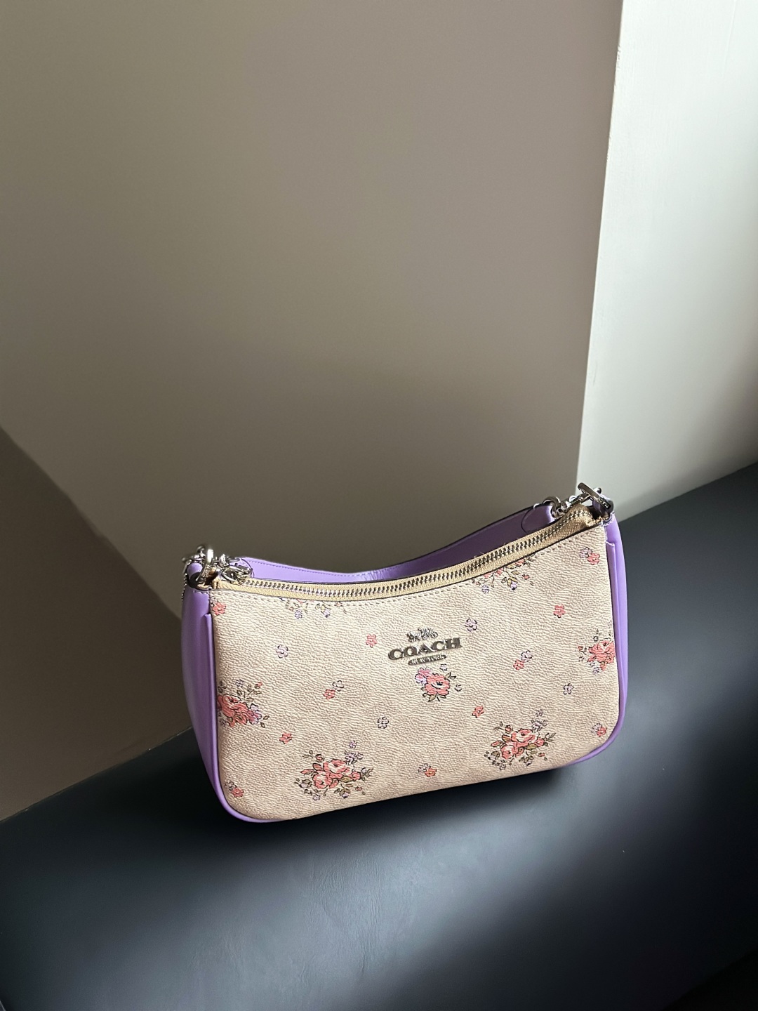 Inspired by the vibrant charm of a spring garden, this Coach purple floral shoulder bag blends elegance with modern style. Crafted from premium leather with a soft, smooth touch, it features a delicate floral print on a rich purple background for a fresh and feminine look.