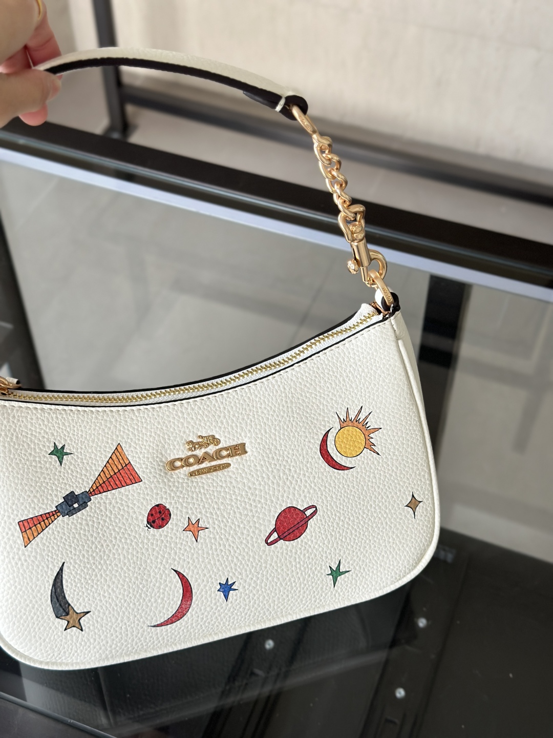 Inspired by the magic of a starlit night, the Coach White Starry Sky Shoulder Bag blends celestial charm with modern elegance. Crafted from high-quality coated canvas and refined leather, the bag features a dreamy white background adorned with delicate star, moon, and constellation motifs — creating a subtle yet eye-catching cosmic design.