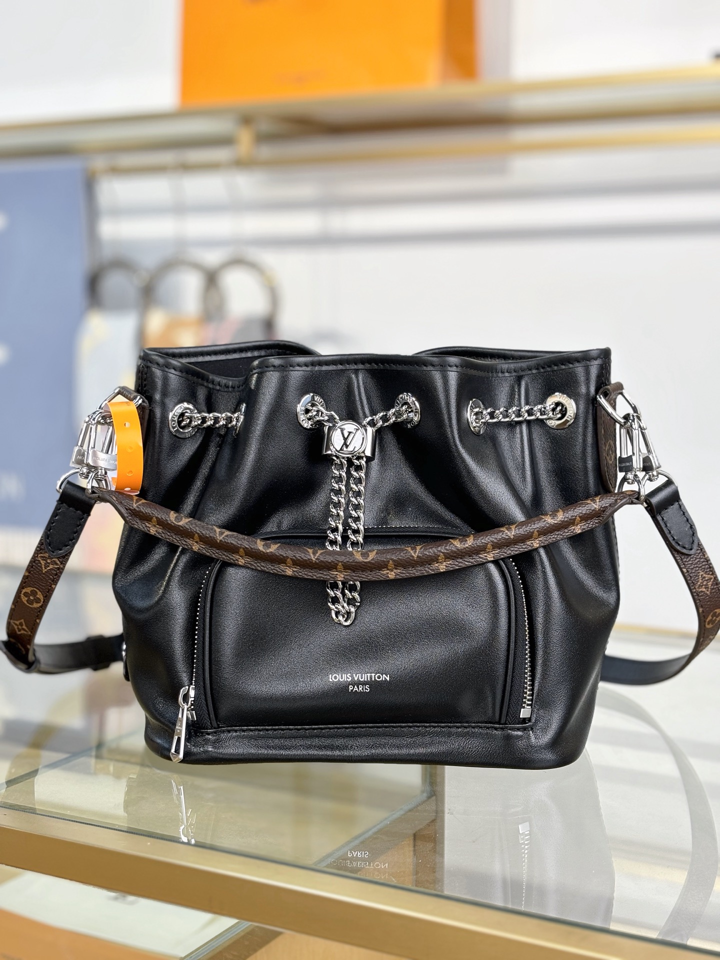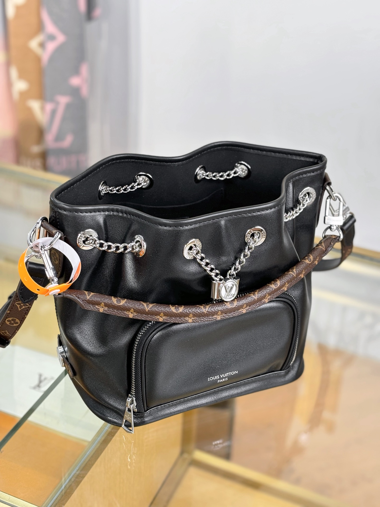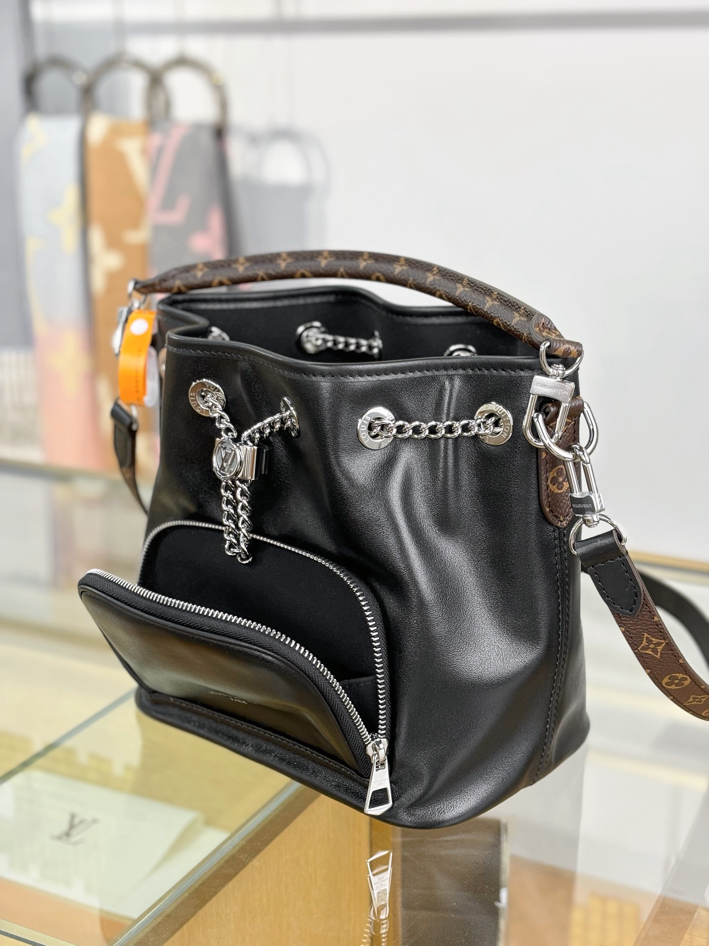 Introducing the No Way handbag from the LV Vibe collection. This modern design takes cues from the iconic Noé style, while adding a rock-inspired attitude. It is crafted from lambskin embellished with silver-toned hardware, including a gliding LV Circle that adjusts the bag opening, while also adding a decorative element. Use the front zipped pocket for keys and makeup essentials.