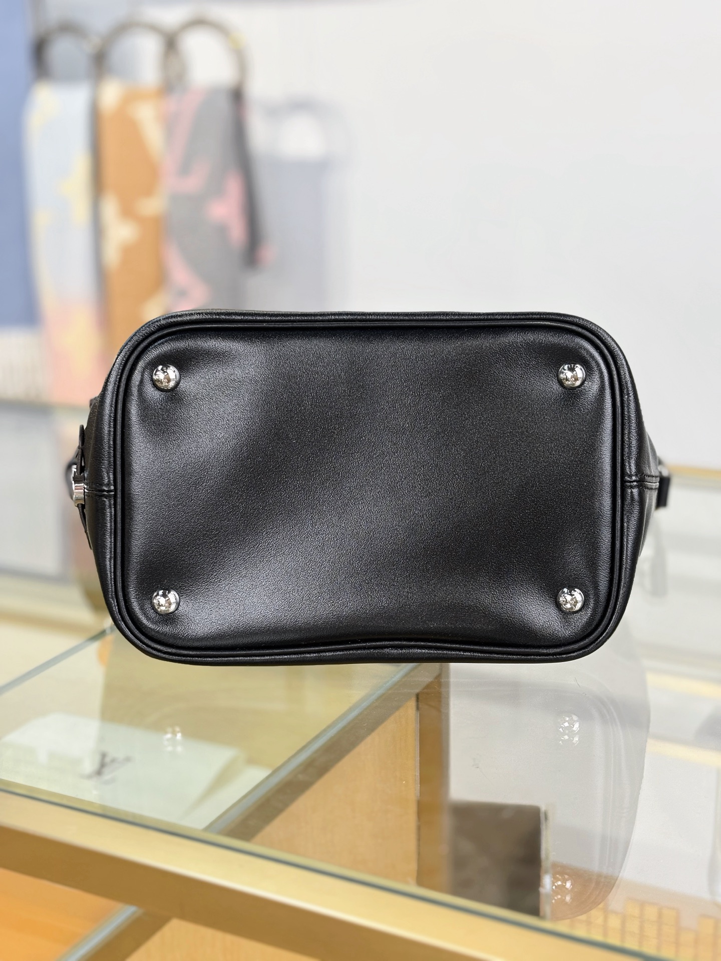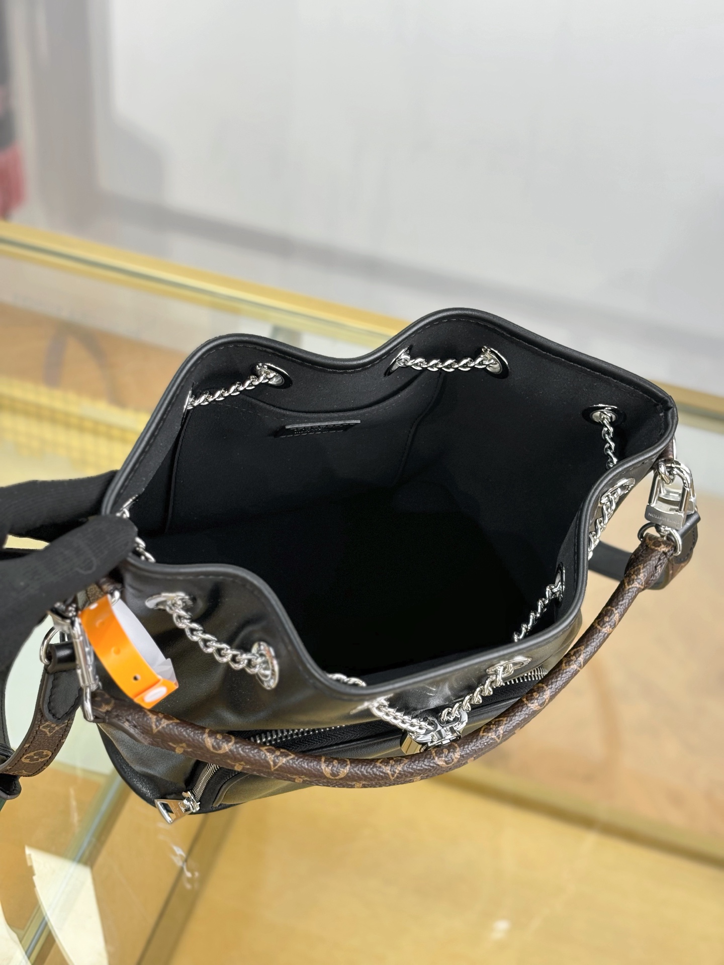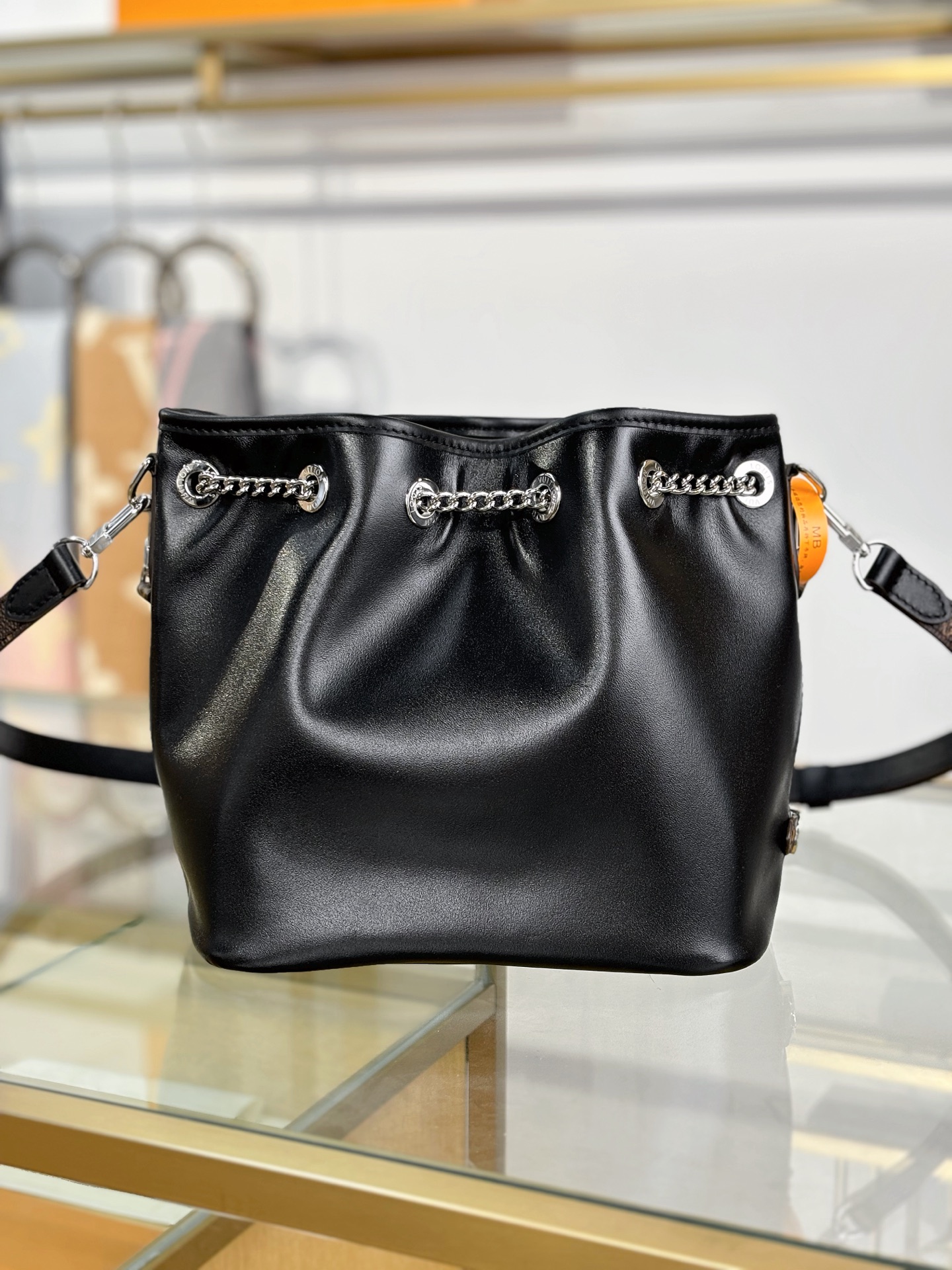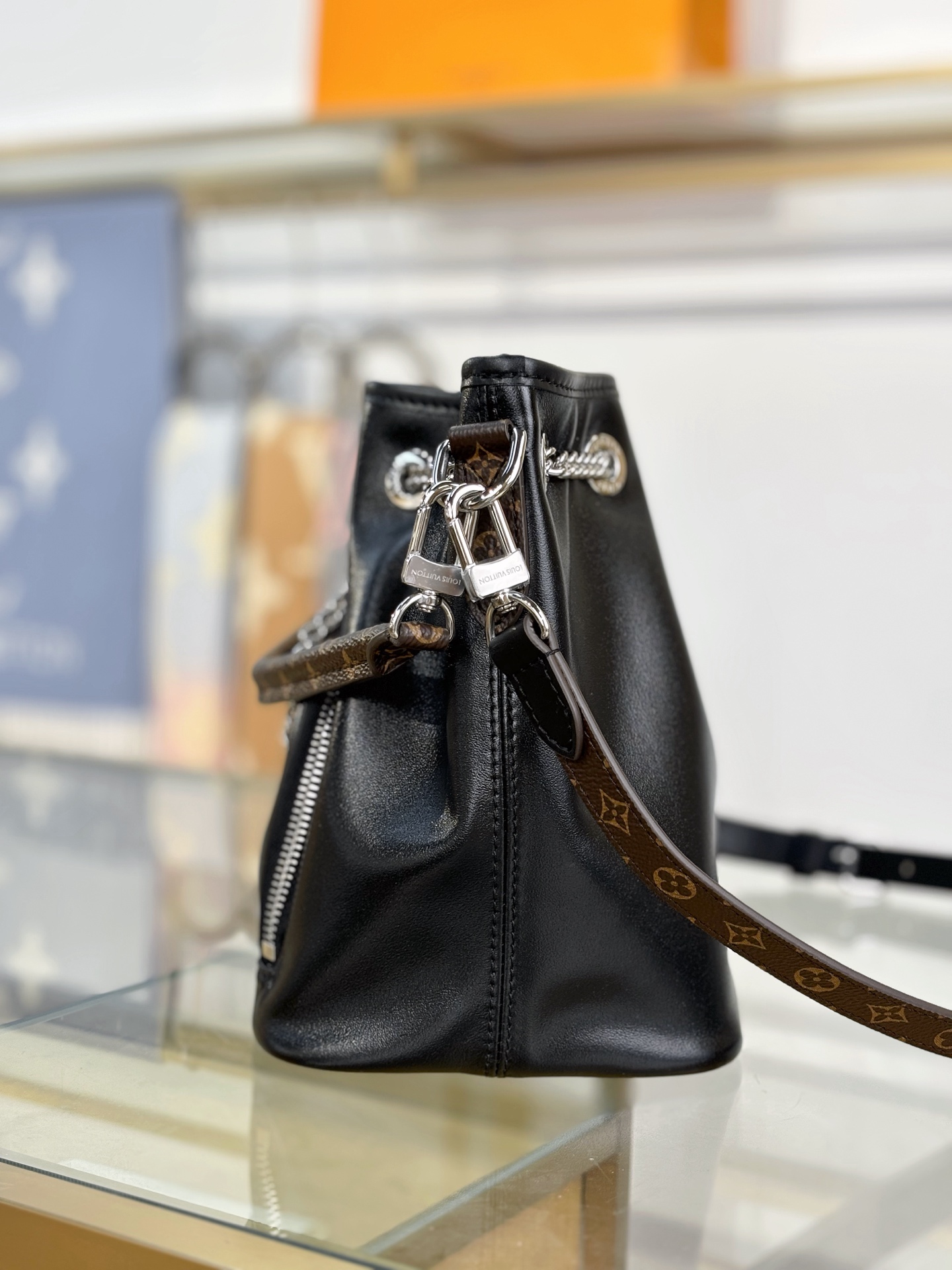 Introducing the No Way handbag from the LV Vibe collection. This modern design takes cues from the iconic Noé style, while adding a rock-inspired attitude. It is crafted from lambskin embellished with silver-toned hardware, including a gliding LV Circle that adjusts the bag opening, while also adding a decorative element. Use the front zipped pocket for keys and makeup essentials.