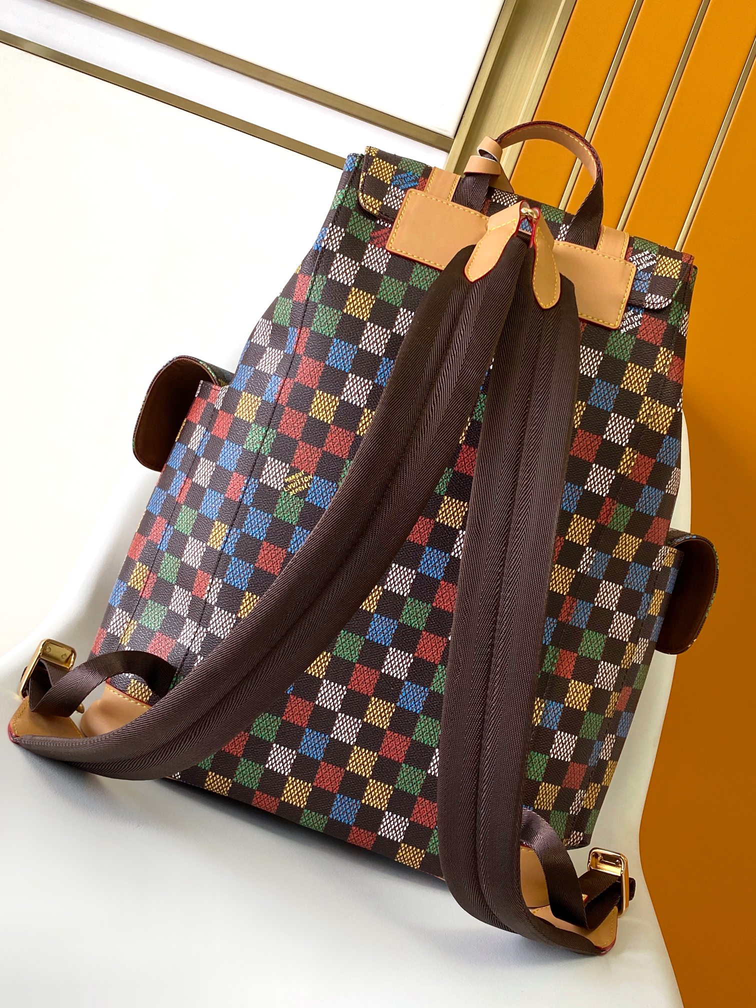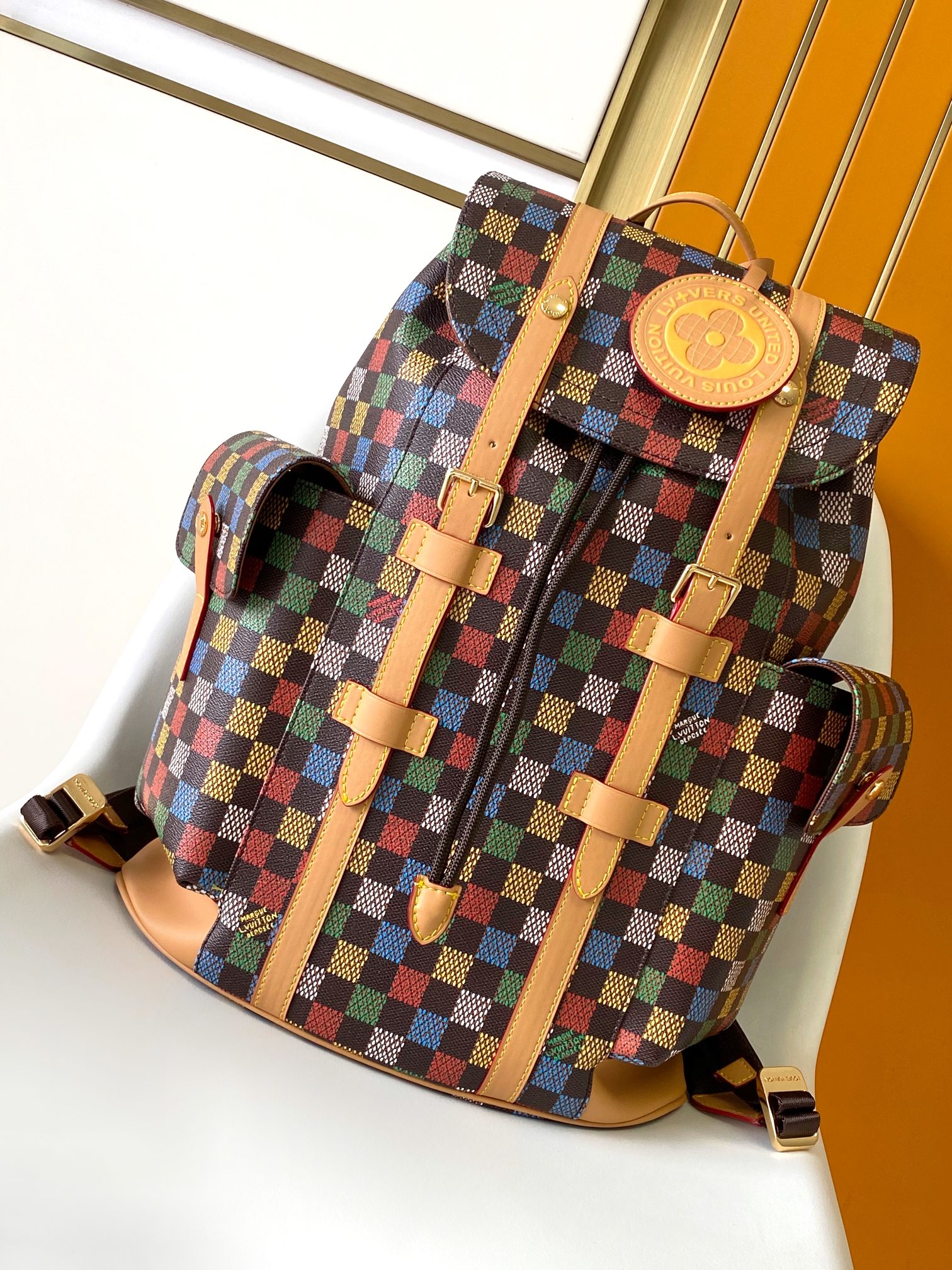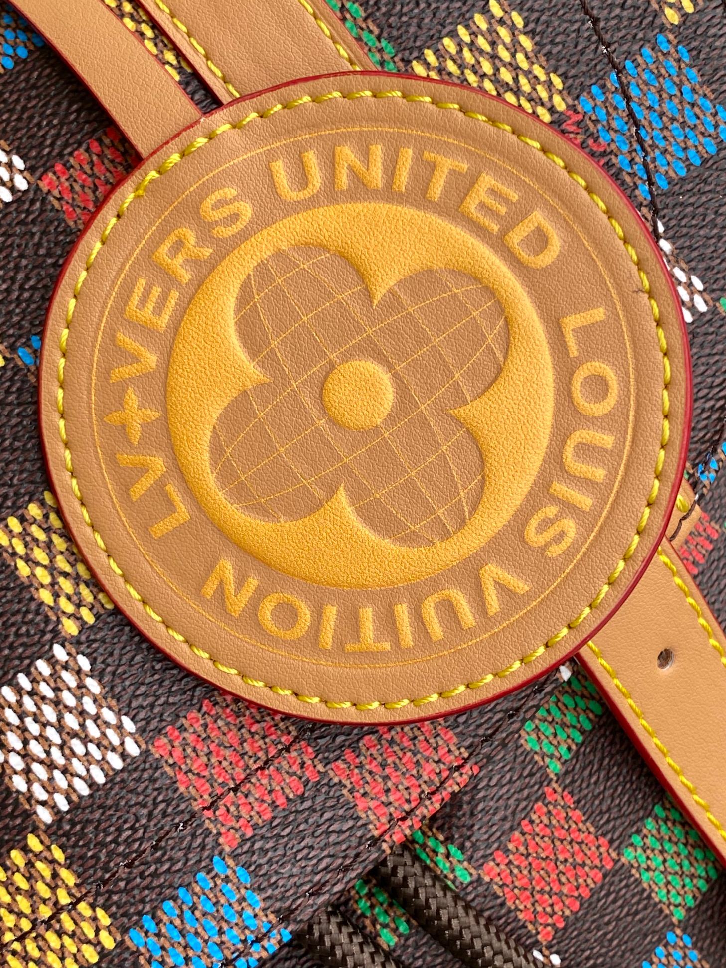 The Christopher MM backpack is fashioned from LV Vers Damier Ebene canvas. The multicolored checks seem to be a hand-painted on top of the Damier Ebene canvas, evoking an array of flags and the message of togetherness defined by Pharrell Williams for this collection. It is signed with a globe-shaped tag inscribed LV Vers UNITED.