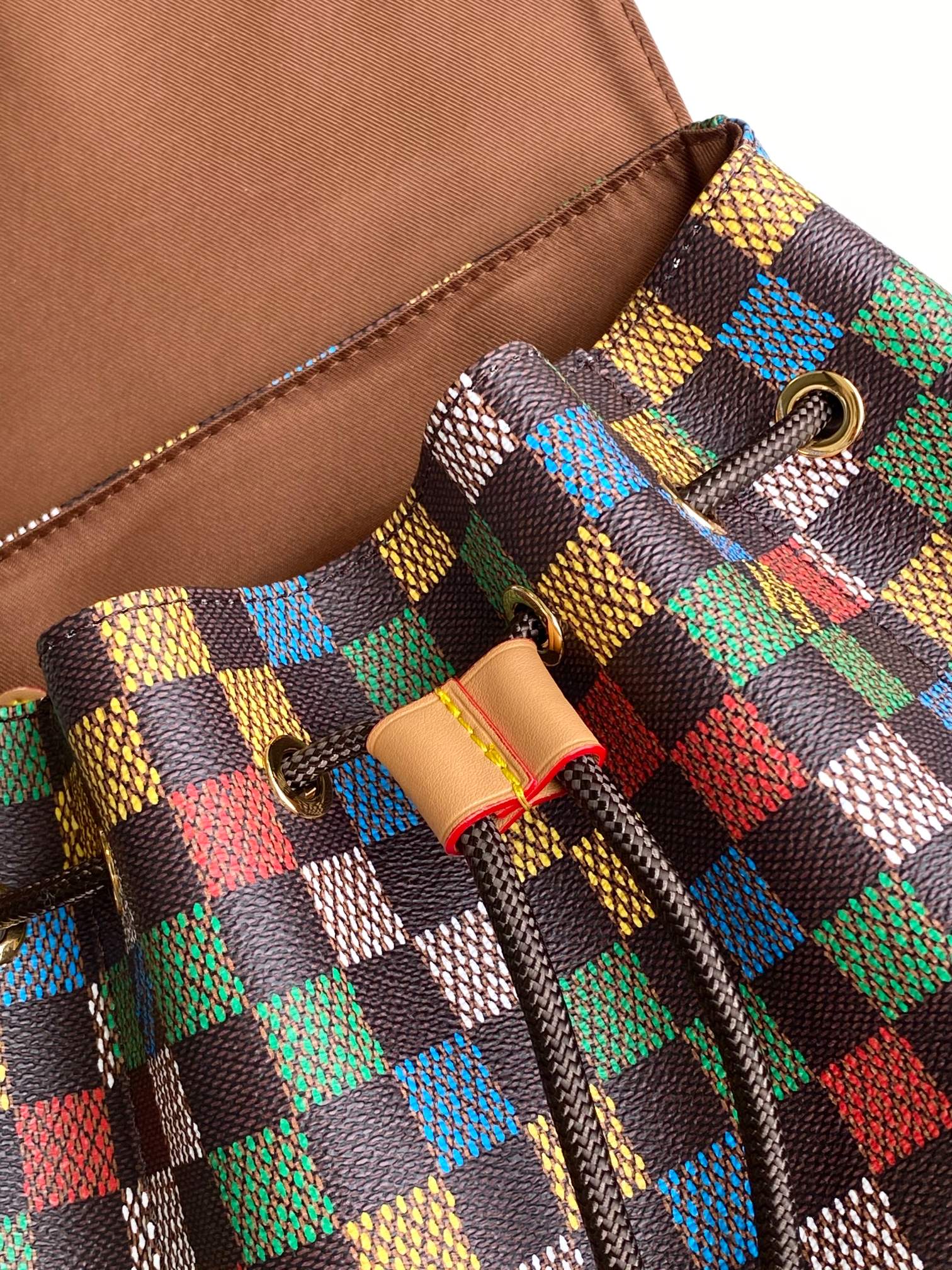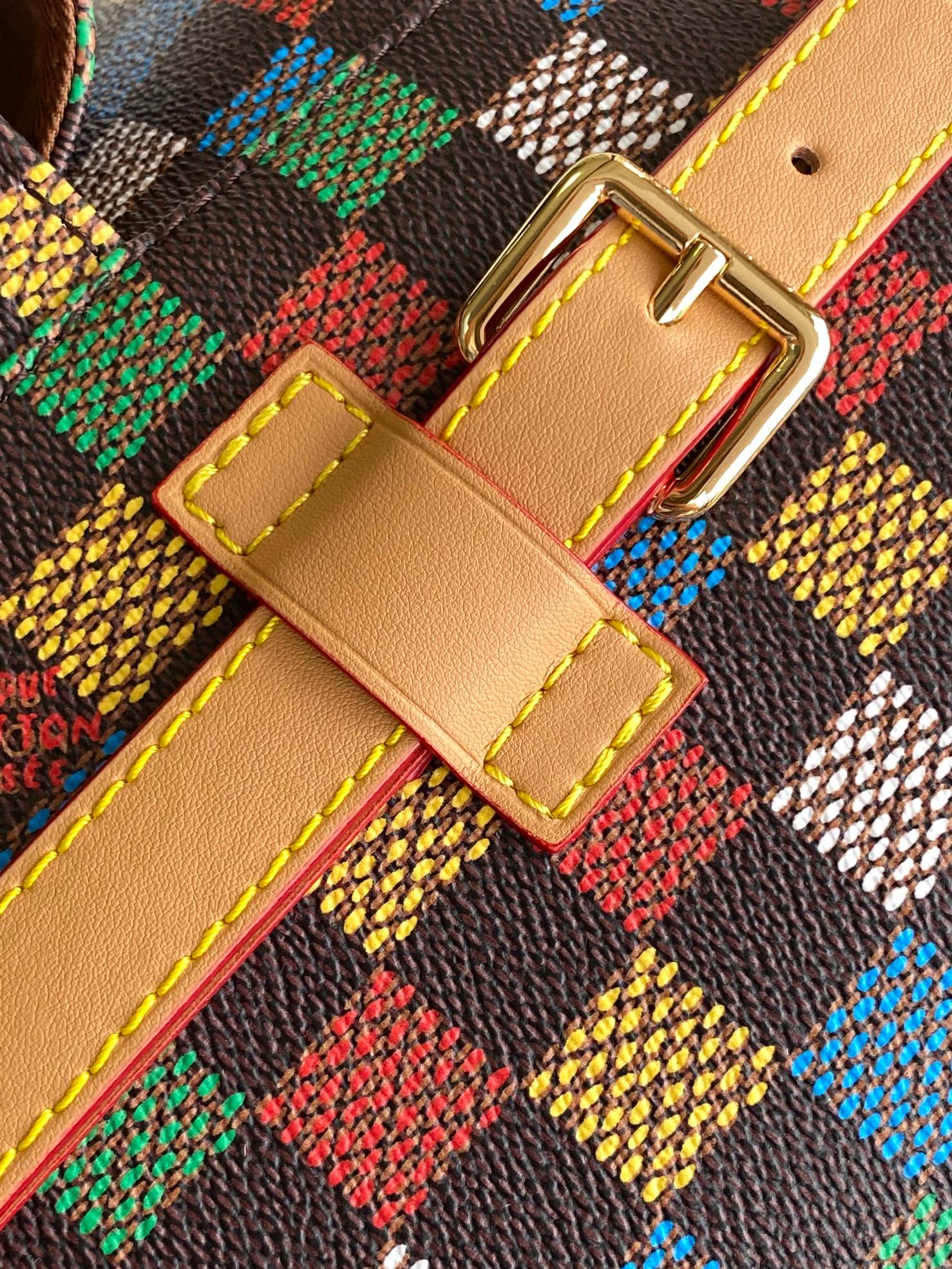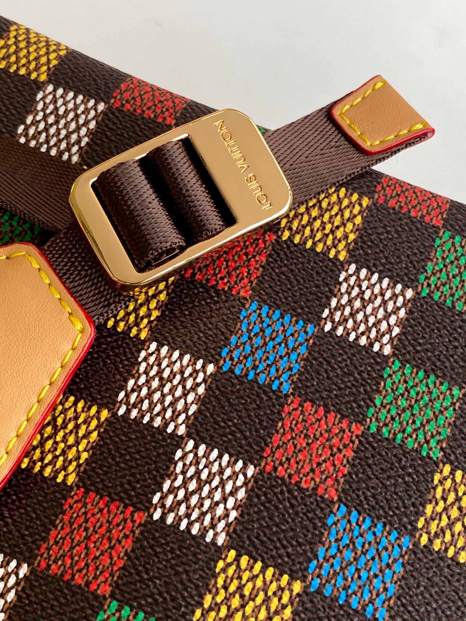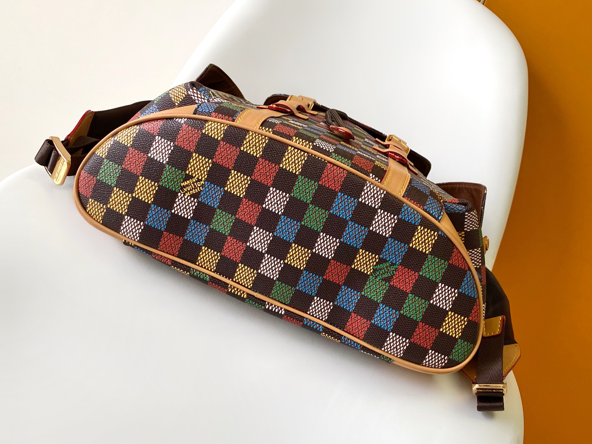 The Christopher MM backpack is fashioned from LV Vers Damier Ebene canvas. The multicolored checks seem to be a hand-painted on top of the Damier Ebene canvas, evoking an array of flags and the message of togetherness defined by Pharrell Williams for this collection. It is signed with a globe-shaped tag inscribed LV Vers UNITED.