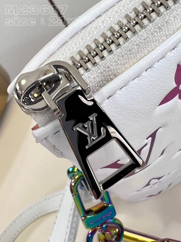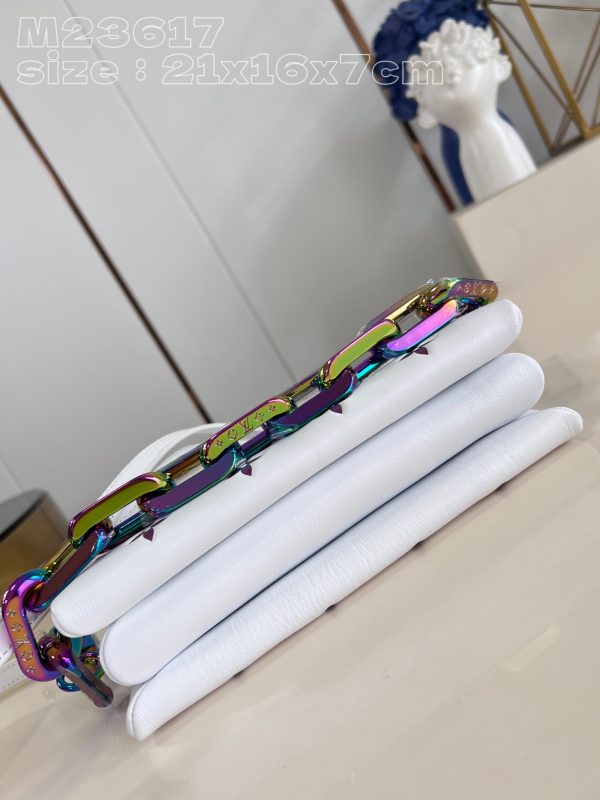 This Coussin BB handbag in padded lambskin seems to have an almost-holographic aspect. The Monogram pattern and certain links chain links are treated with an iridescent finish that makes them shimmer and shine in the light, seemingly changing color. Inside, there are two compartments separated by a zipped pocket.