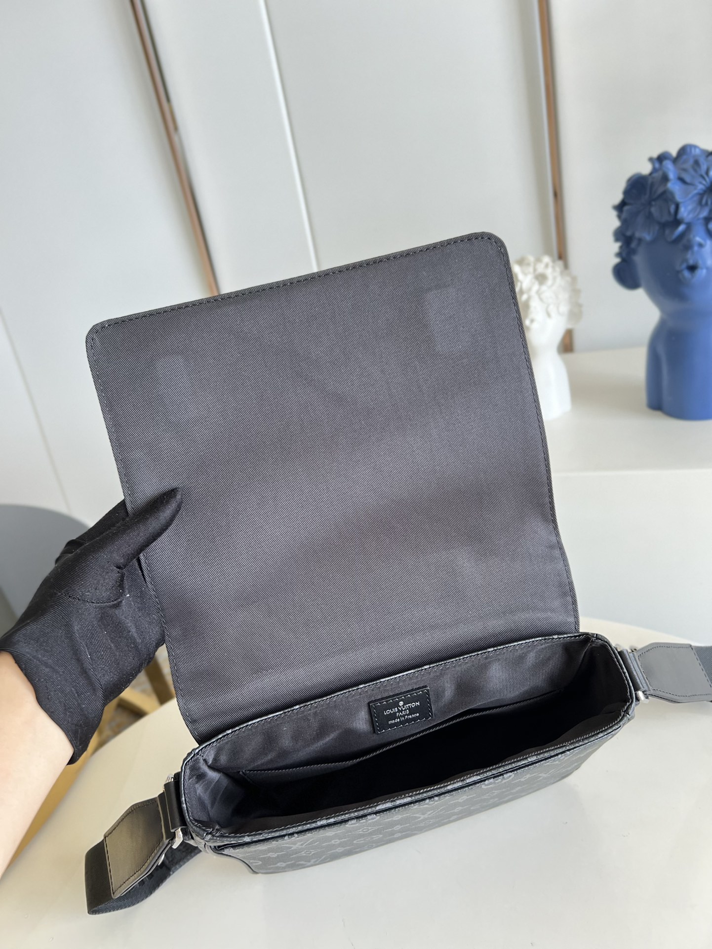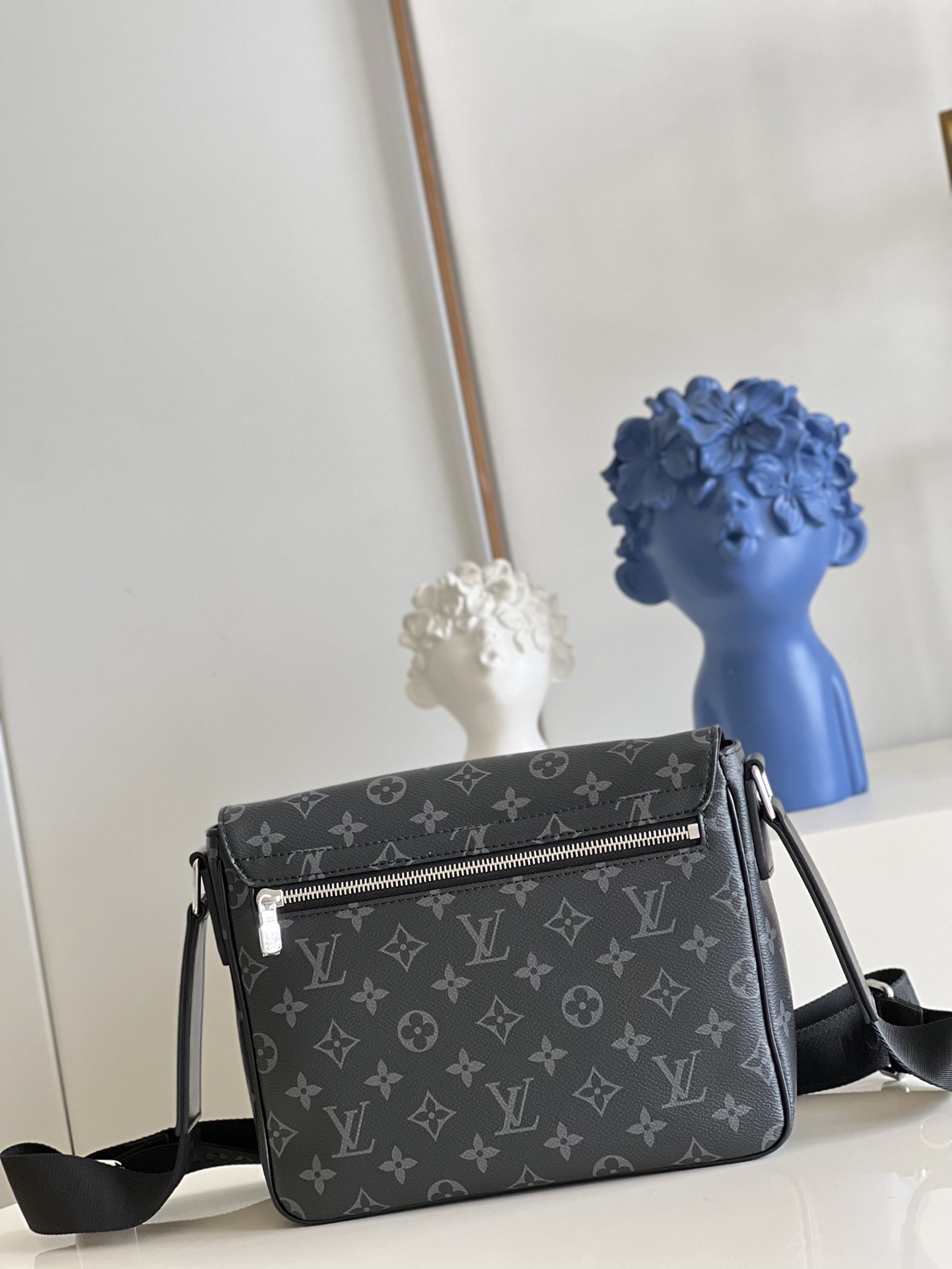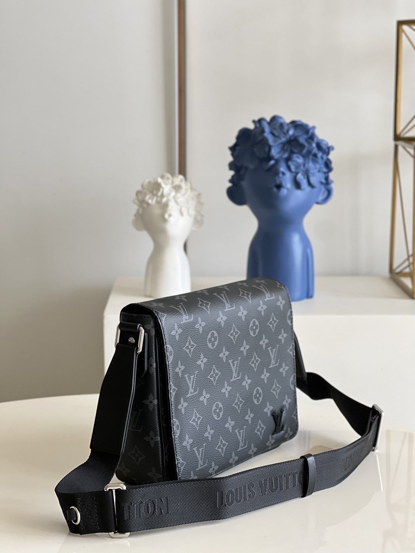 Made from masculine Monogram Eclipse canvas, the new District PM is a messenger-style bag with a contemporary design. An outside back zipped pocket gives quick access to essentials while the adjustable shoulder strap ensures comfortable carry. The strap is signed “Louis Vuitton” and the lower front corner features black metallic LV initials.