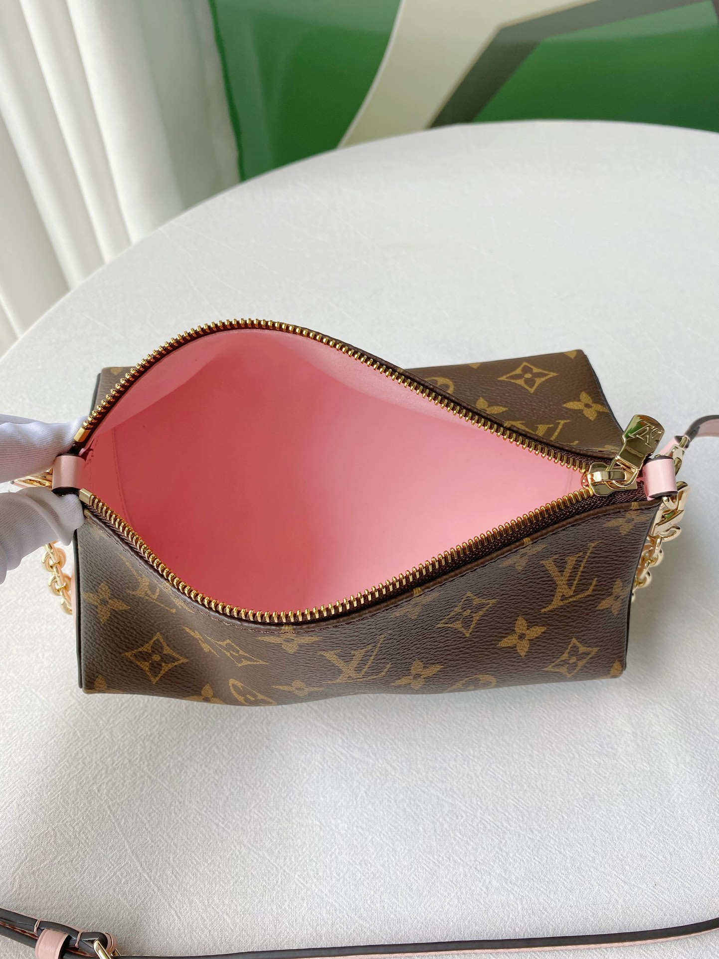 The Bloom pouch combines Louis Vuitton’s iconic Monogram canvas with pastel-colored leather on its side panels. This feminine mini bag is notable for its distinctive shape, inspired by a Monogram Flower. It can hold essentials such as a compact wallet, phone, keys and lipstick, and can be worn with or without its delicate, gold-tone chain.