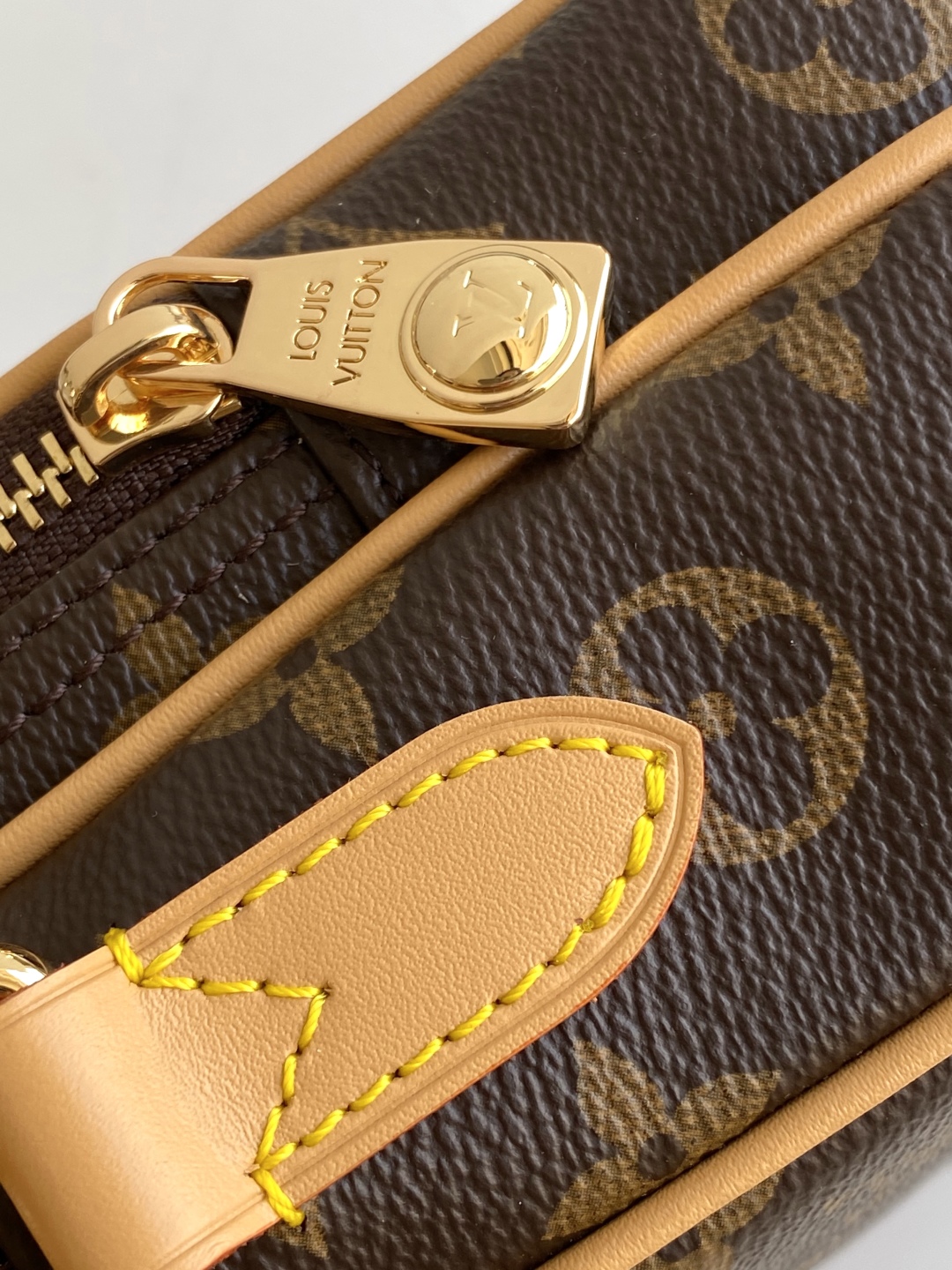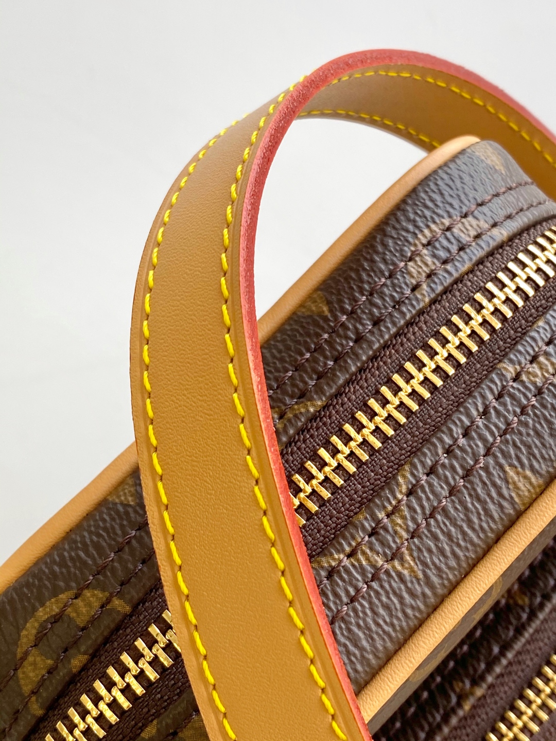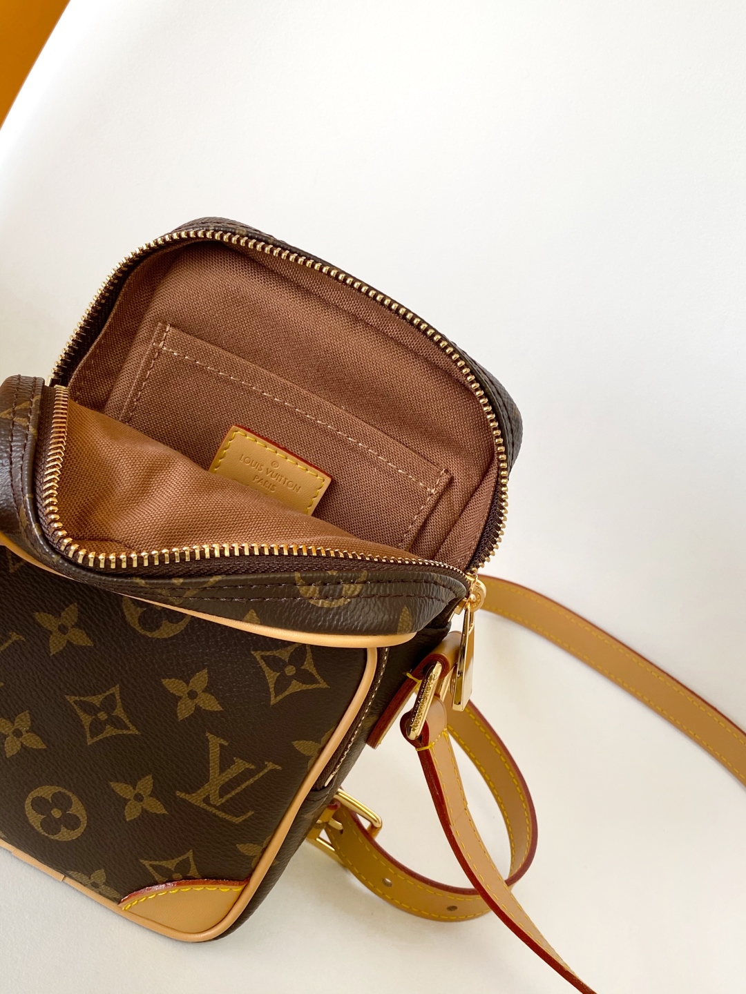 The Amazone is a stylish cross-body bag made from Monogram canvas with aged leather corners, piping, and removable strap. Inspired by designs from the 1980s, Pharrell Williams creates a compact bag that blends vintage charm with modern sophistication. The zip-pulls are adorned with pearl. The adjustable strap ensures comfortable carry.