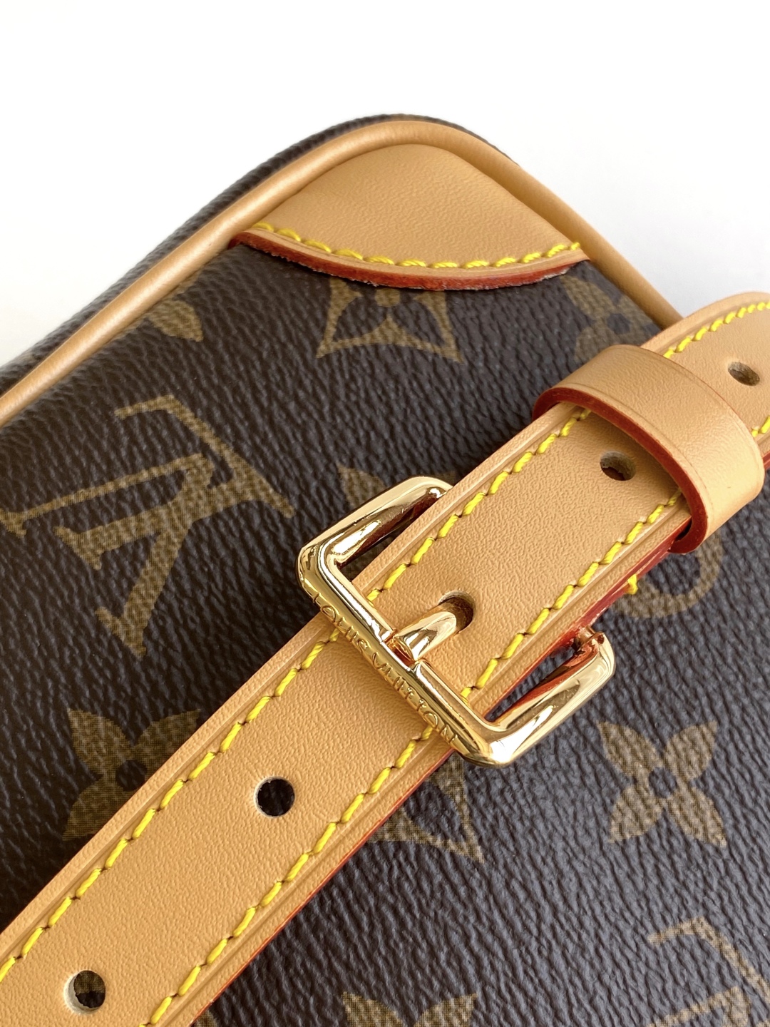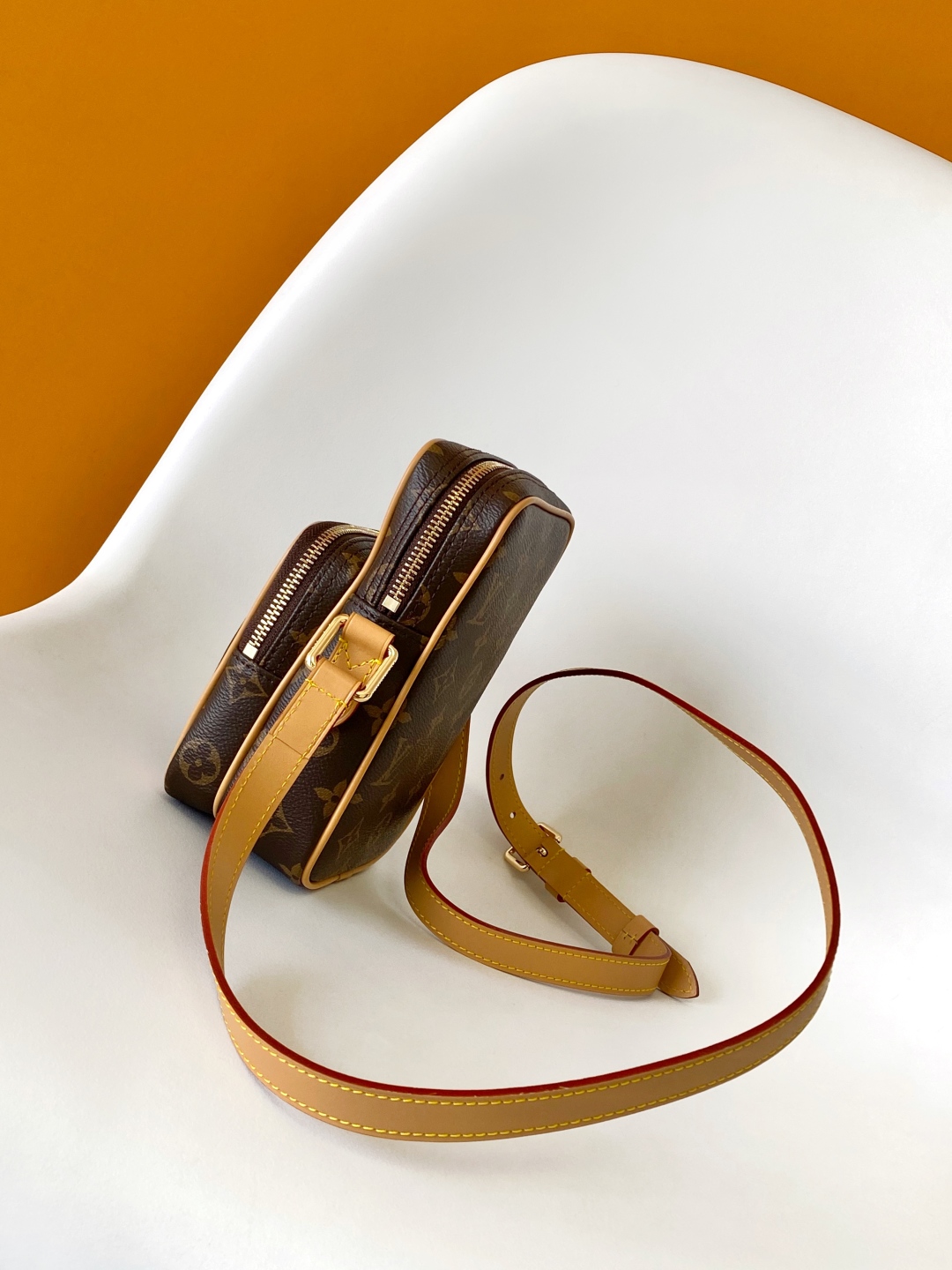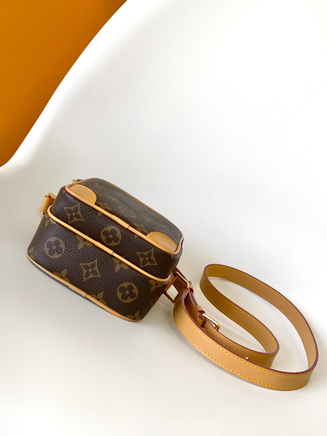 The Amazone is a stylish cross-body bag made from Monogram canvas with aged leather corners, piping, and removable strap. Inspired by designs from the 1980s, Pharrell Williams creates a compact bag that blends vintage charm with modern sophistication. The zip-pulls are adorned with pearl. The adjustable strap ensures comfortable carry.