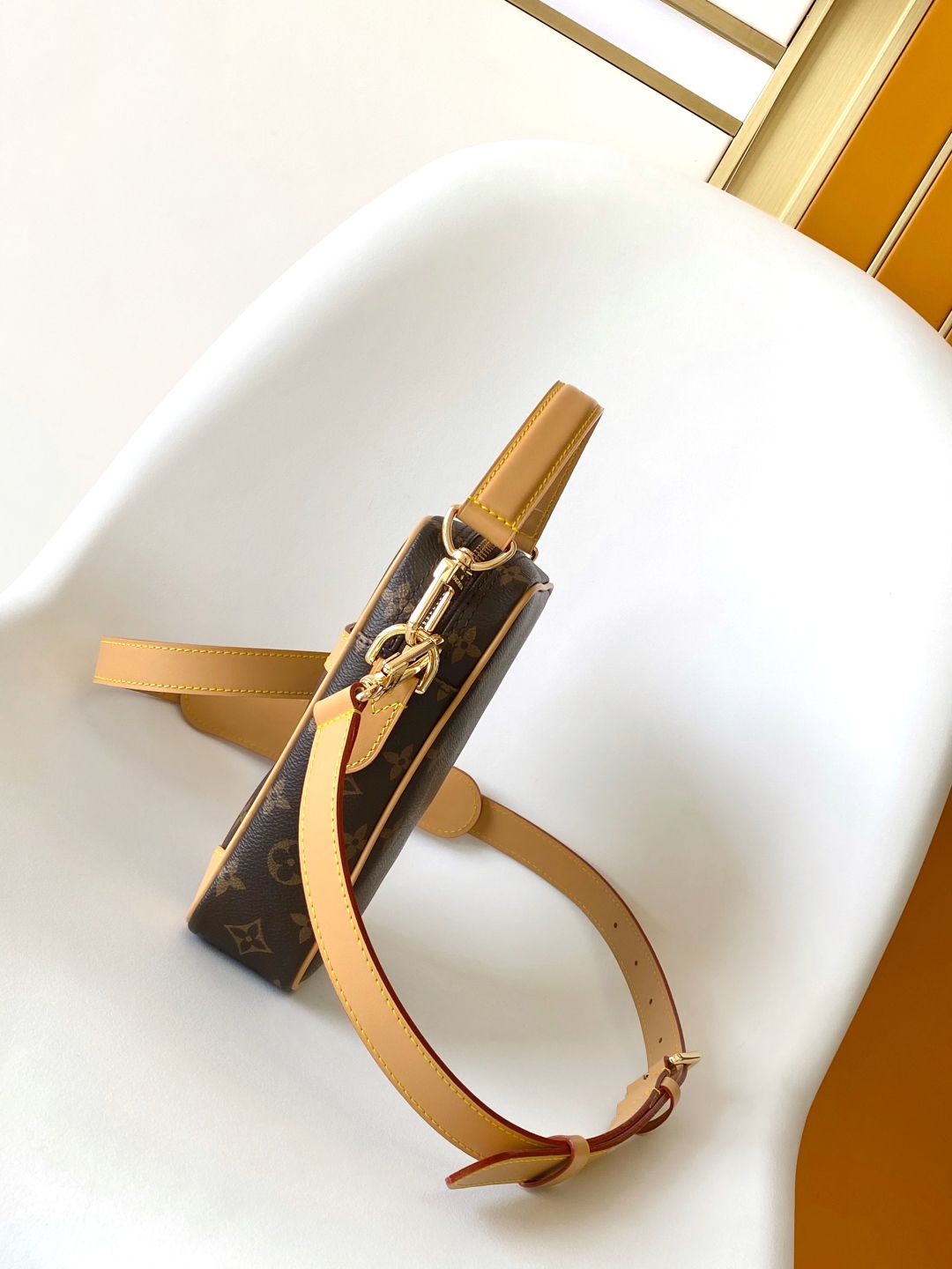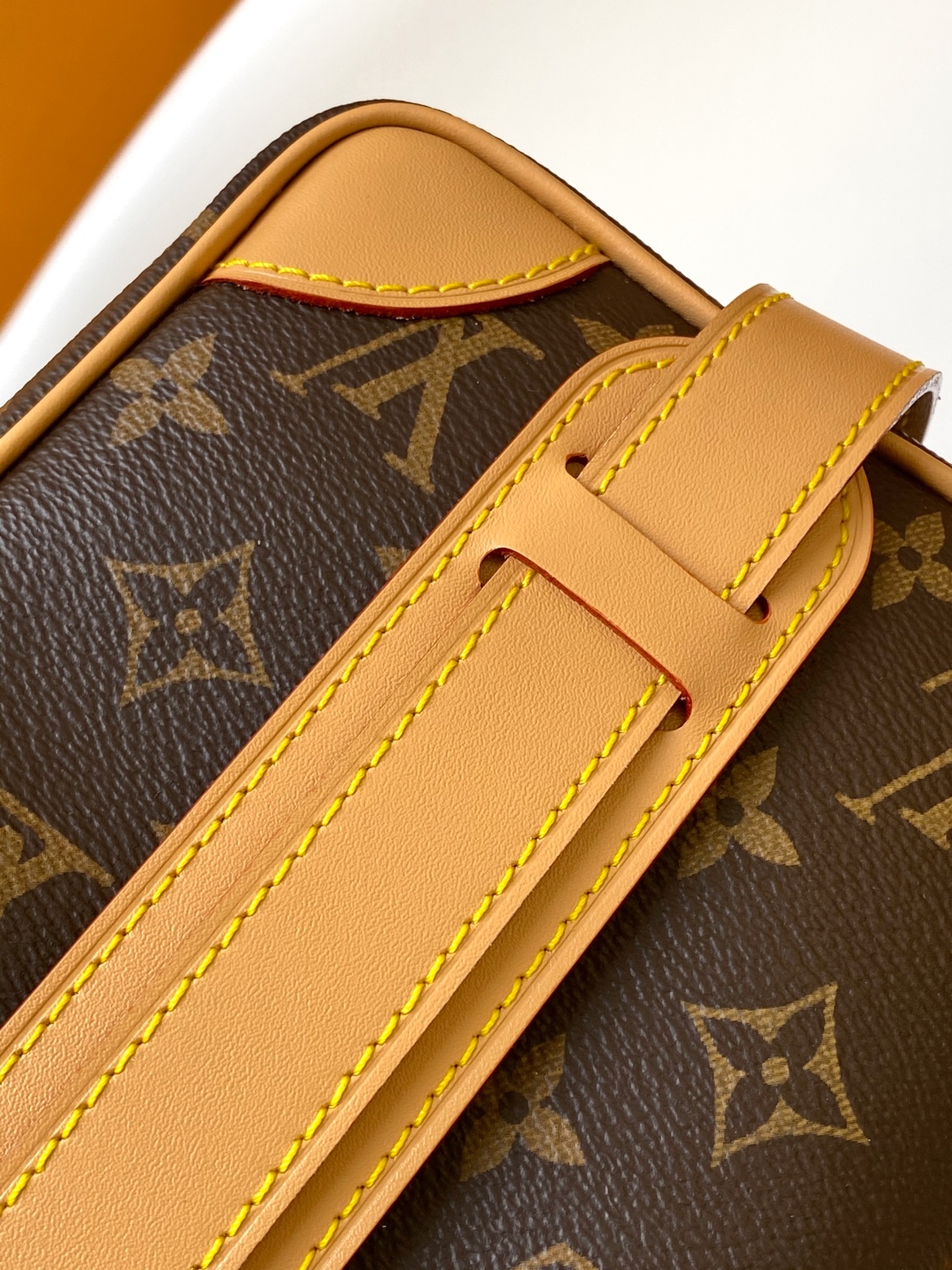The Danube cross-body bag in calfskin evokes House designs from the 1980s. With its slightly faded Monogram print, it gives the illusion of being fashioned from Monogram canvas. A front flat pocket, in addition to the zipped main compartment, makes it practical. It features a removable metallic tag signed Louis Vuitton.