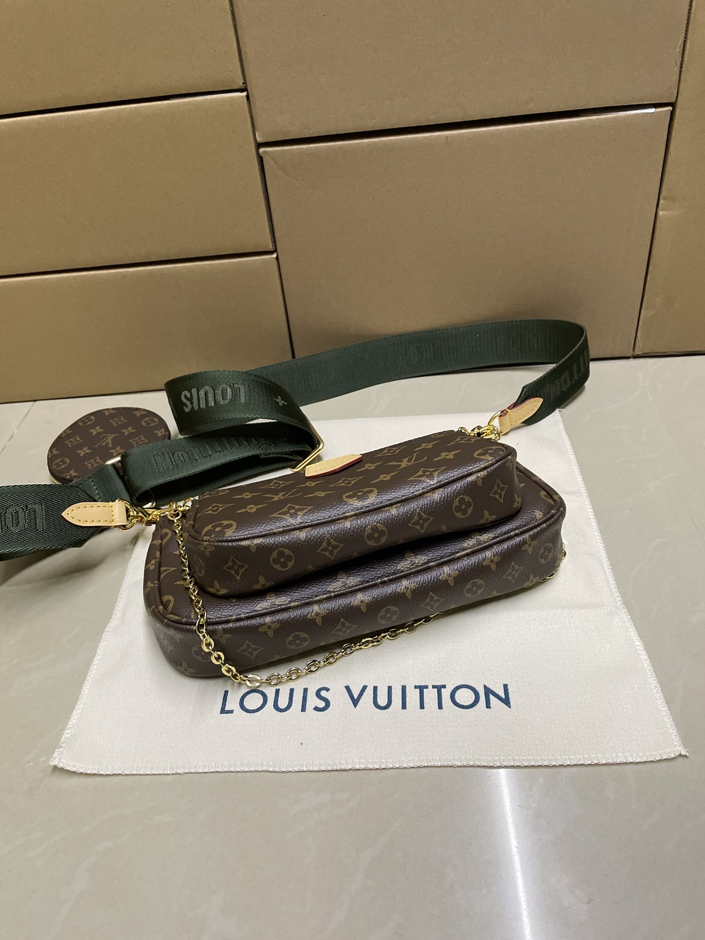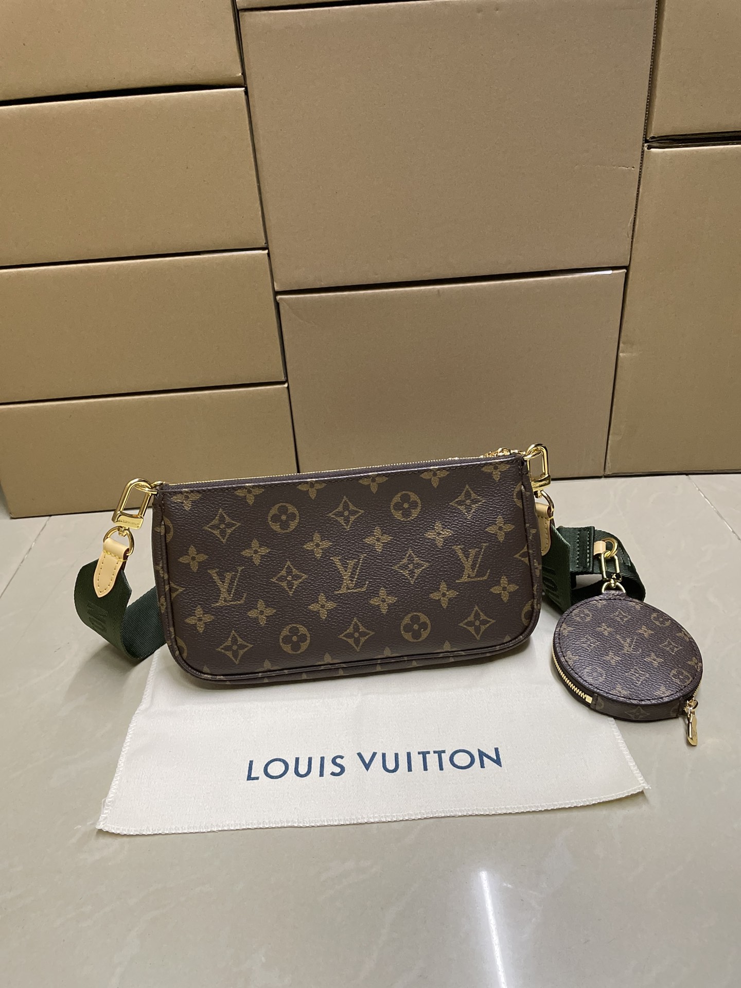 The Multi Pochette Accessoires is a hybrid cross-body bag with multiple pockets and compartments that brings together a Pochette Accessoires, a Mini Pochette Accessoires and a Round Coin Purse. Fashioned from Monogram canvas with a mini Monogram pattern on the sides of the two pochettes, it has both a removable gold-tone chain and an adjustable Louis Vuitton inscribed Jacquard strap for multiple carrying options.