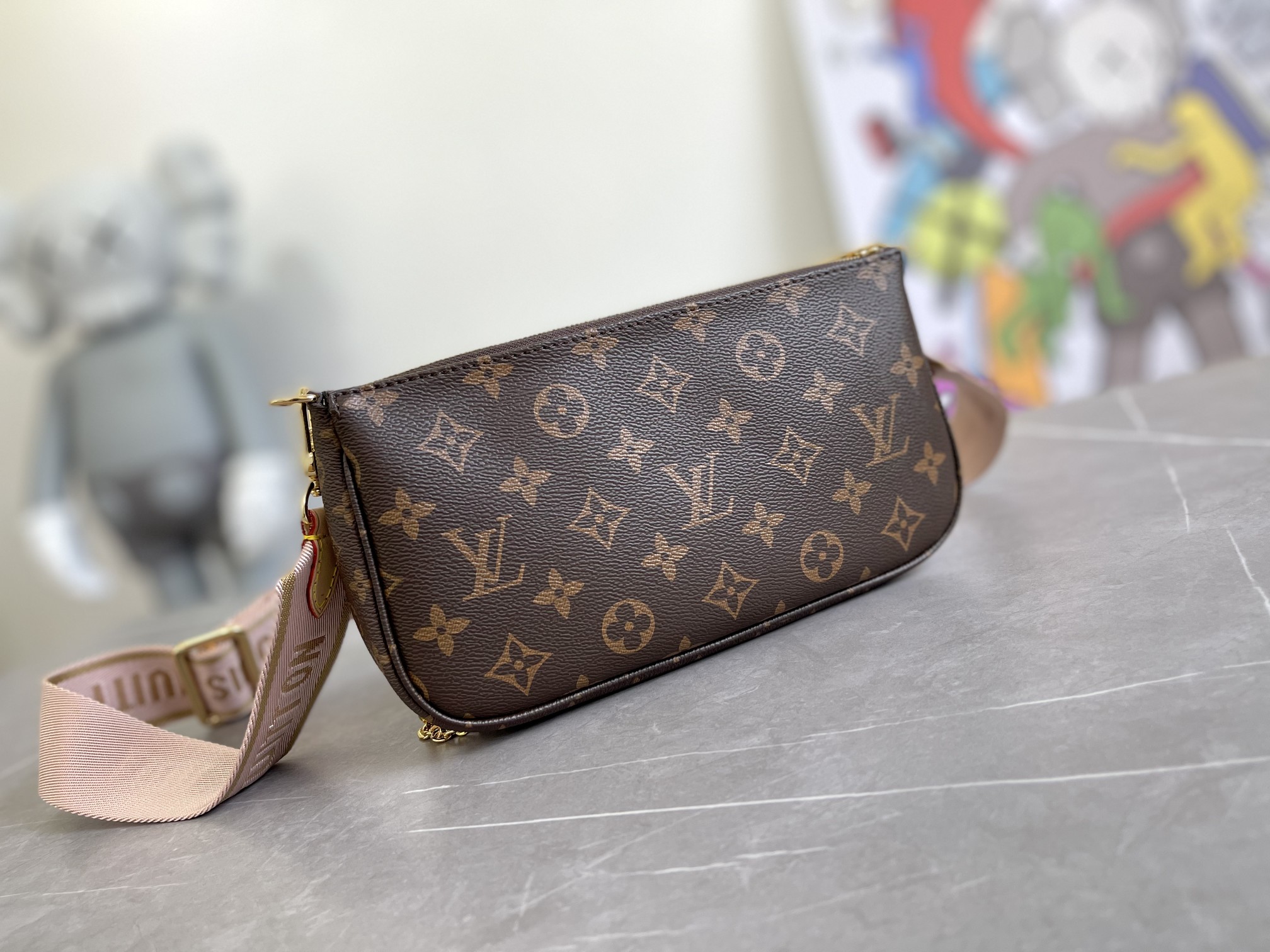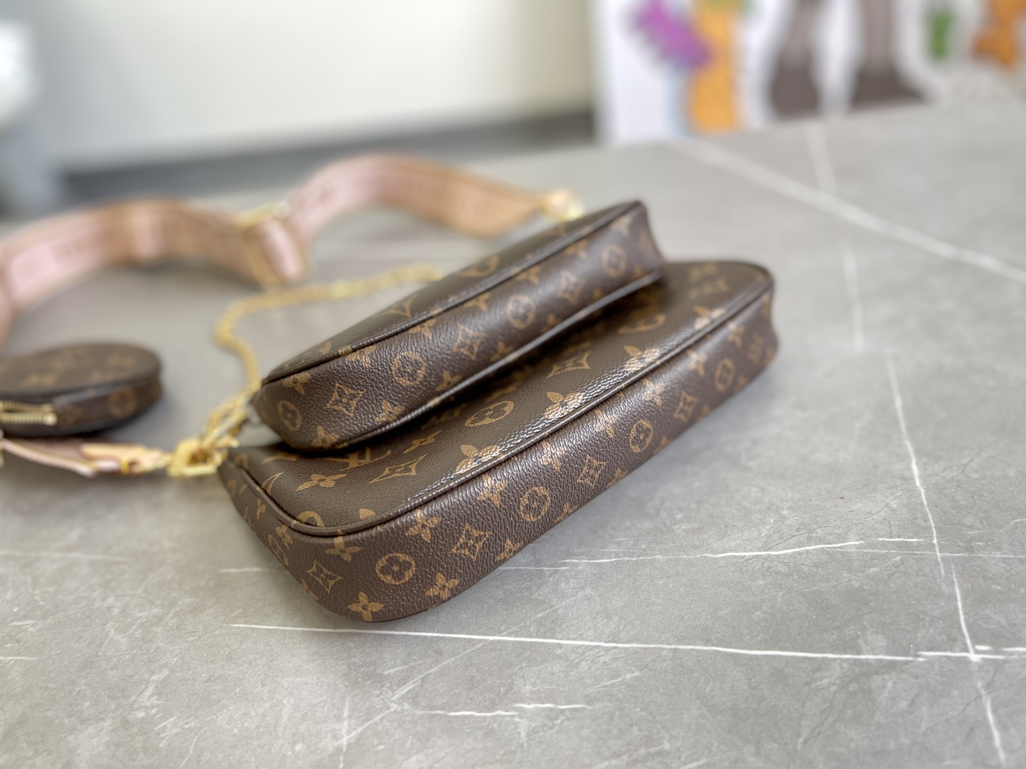 The Multi Pochette Accessoires is a hybrid cross-body bag with multiple pockets and compartments that brings together a Pochette Accessoires, a Mini Pochette Accessoires and a Round Coin Purse. Fashioned from Monogram canvas with a mini Monogram pattern on the sides of the two pochettes, it has both a removable gold-tone chain and an adjustable Louis Vuitton inscribed Jacquard strap for multiple carrying options.