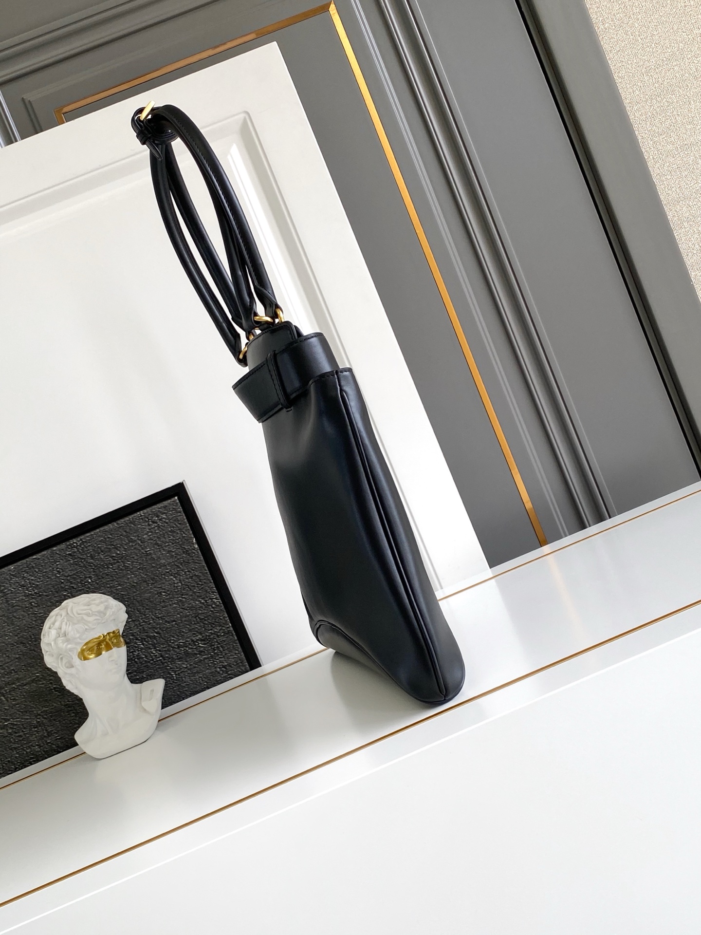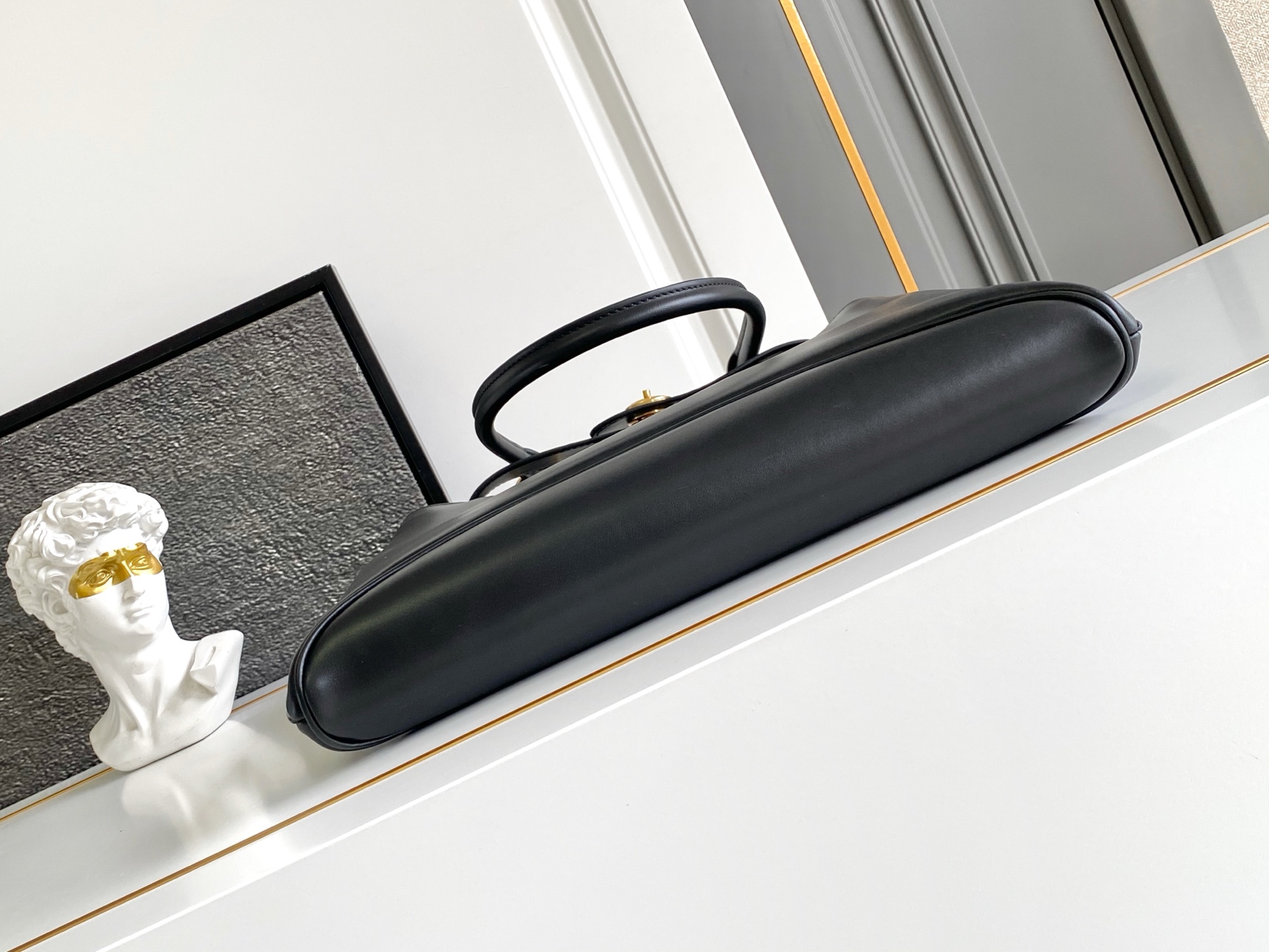 The harmony between futuristic shapes and vintage touches defines this leather bag with sophisticated details. The elegant design, in which classical elements and contemporary notes coexist, is completed by a refined turn-lock clasp taken from Prada archives.