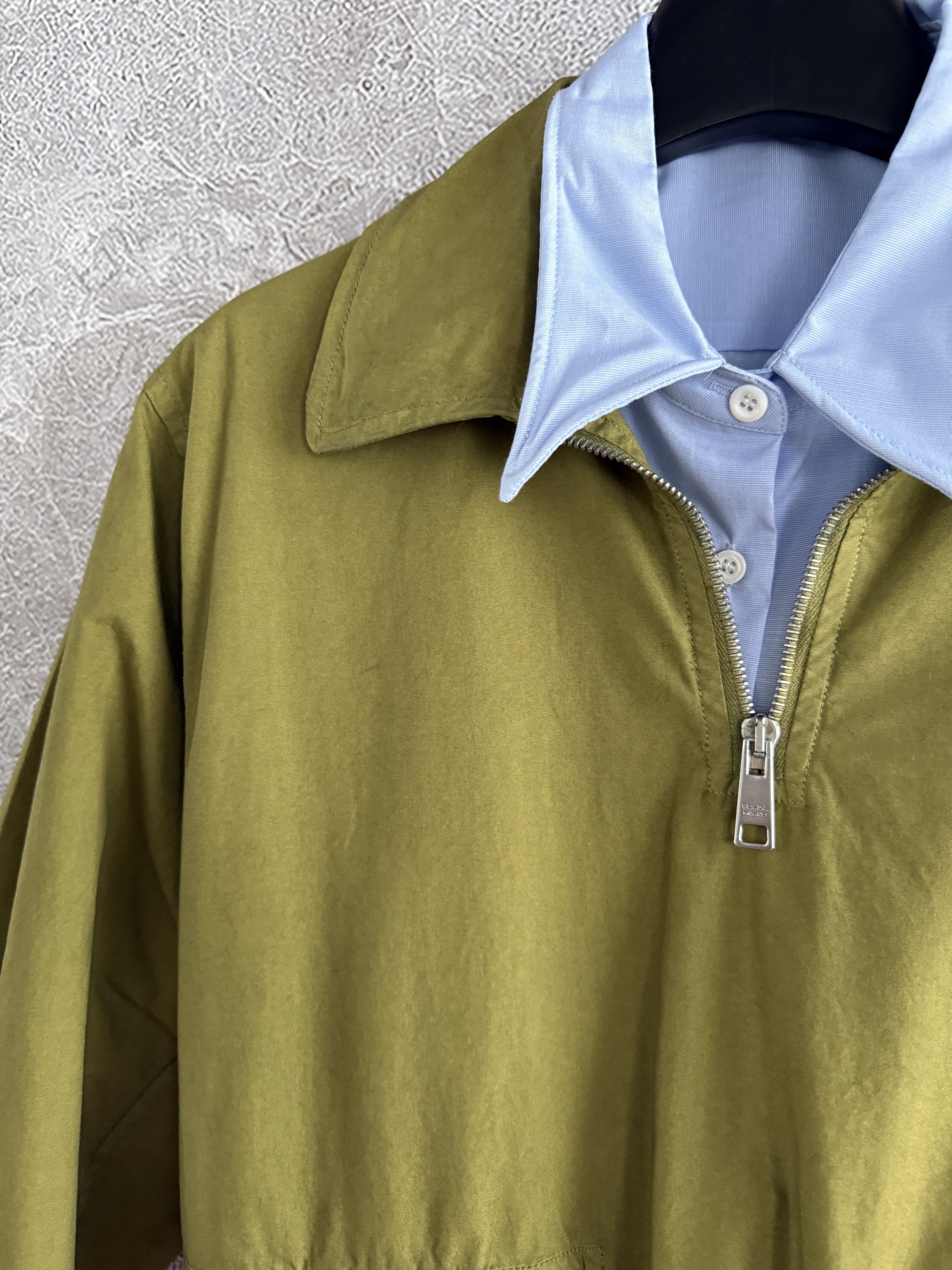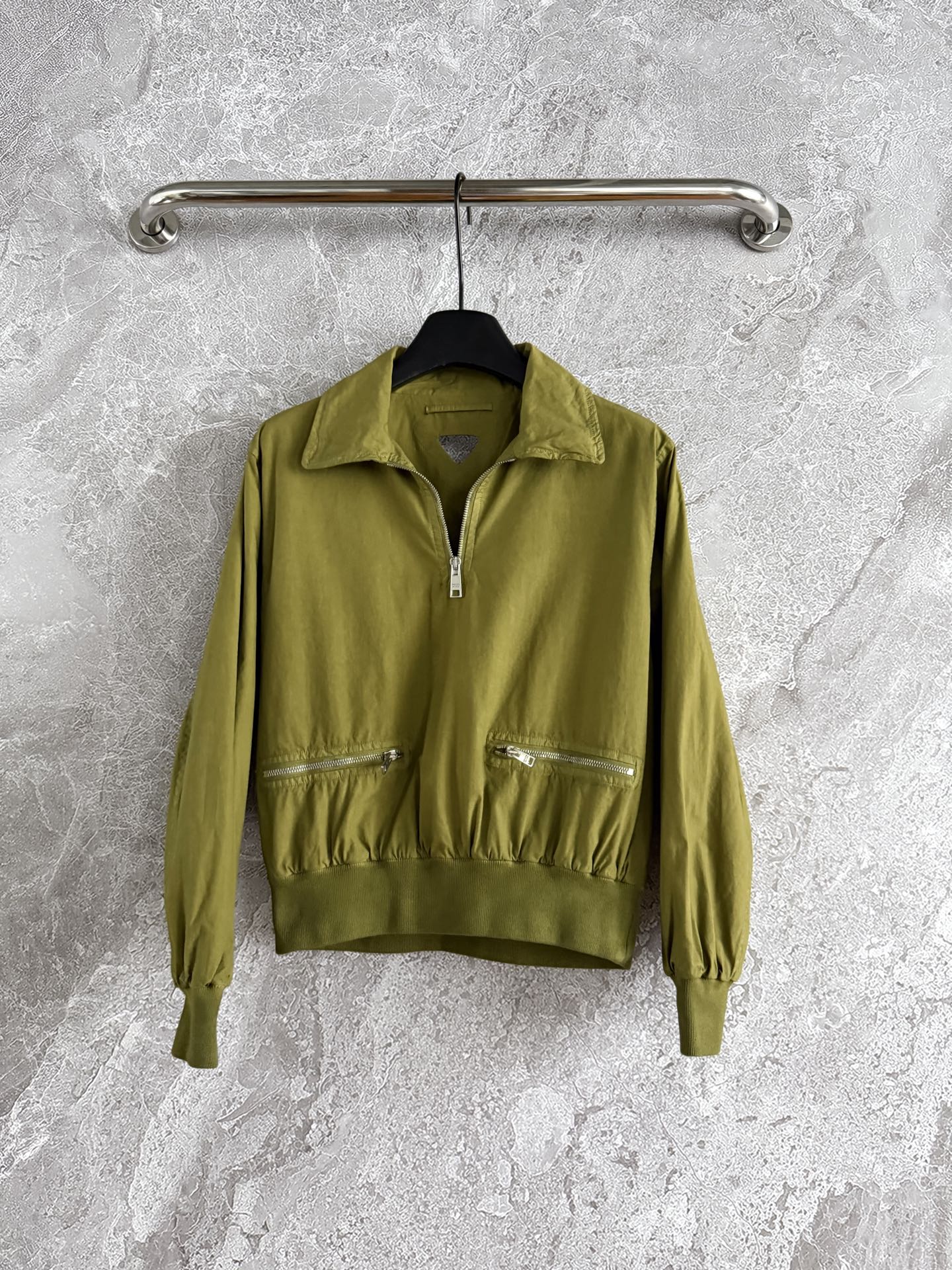 Featuring a unique vintage washing technique, this jacket comes in a deliberately distressed, muted green shade with a lived-in feel. Crafted from sturdy cotton, it showcases a sporty silhouette accented by a reinterpreted cut-out triangle logo.