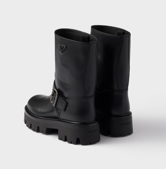 A design with refined lines and artisan construction defines these leather booties decorated with the iconic triangle logo. The distinctive metal buckle adds character to biker style, completed with chunky rubber soles.