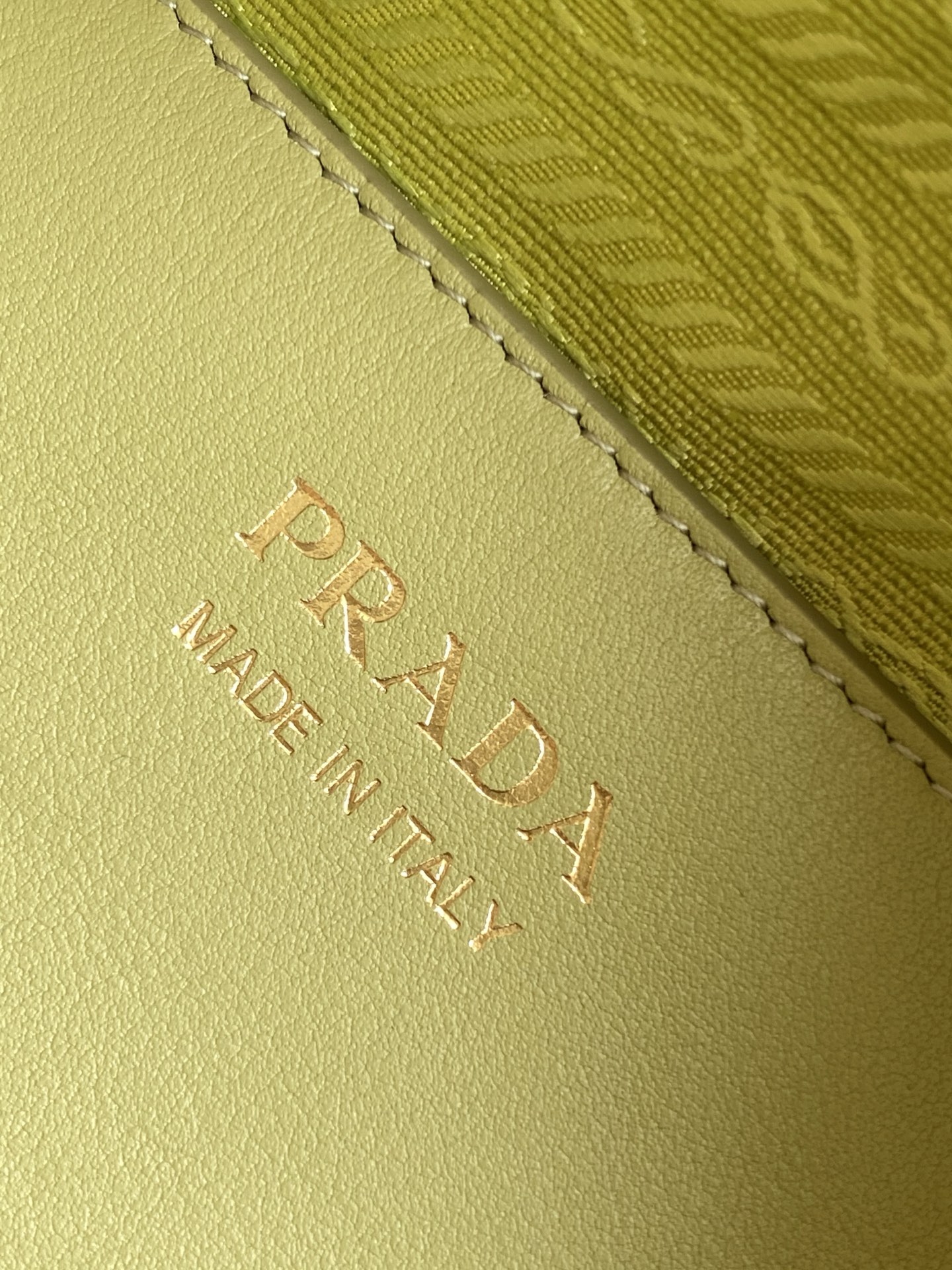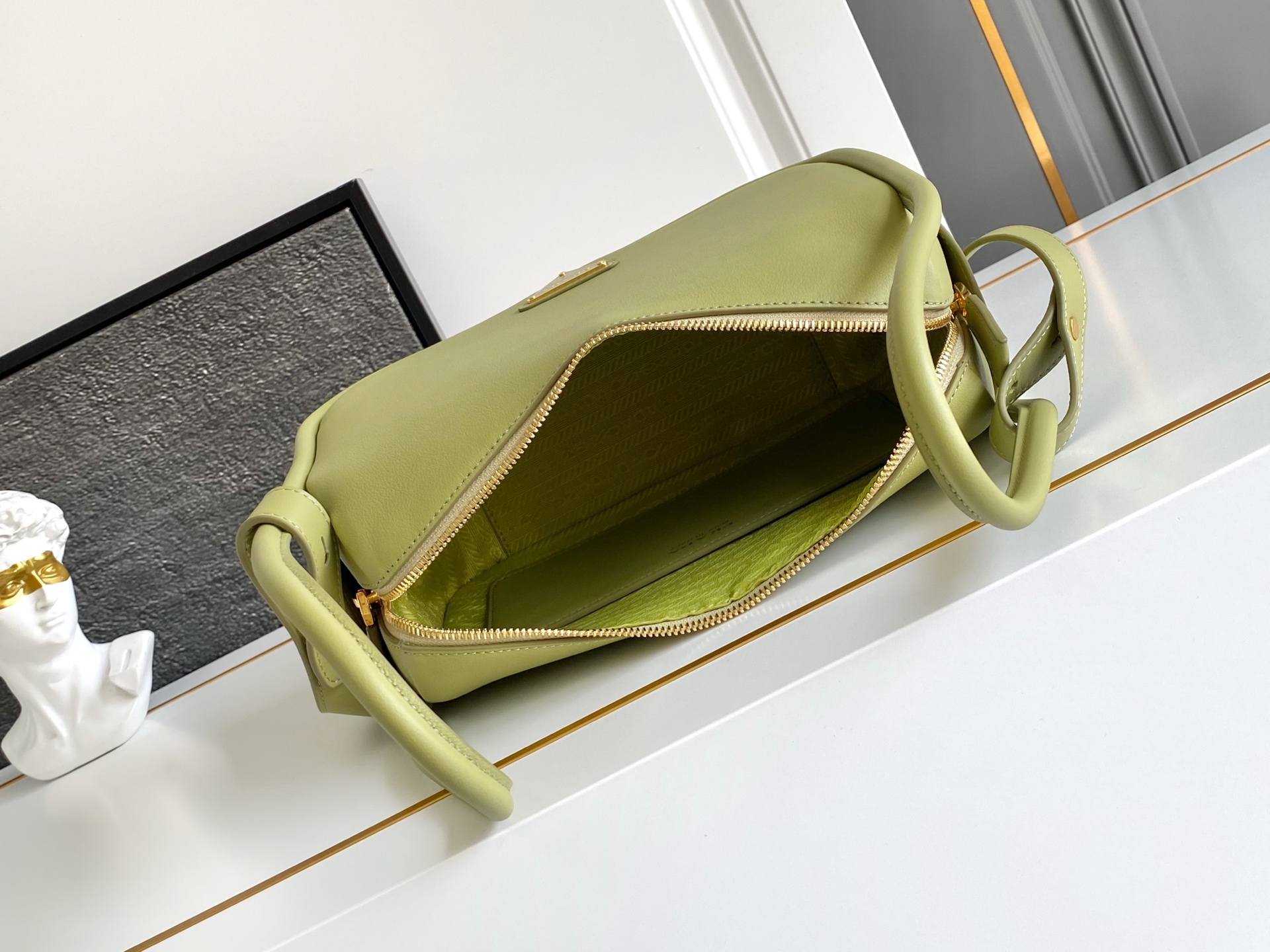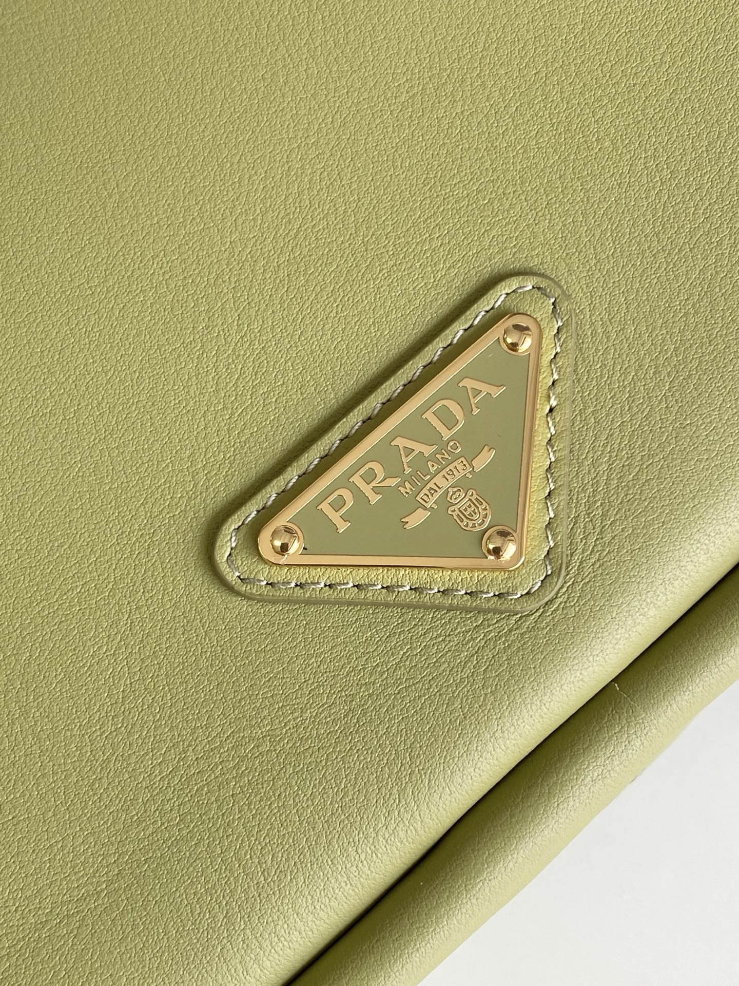The front is adorned with the iconic gold triangle logo, and it opens with a sleek zipper. The long handle allows for both handheld and underarm carry, offering versatility for all your looks. Inside, the spacious pocket with a slip compartment ensures your essentials are perfectly organized.