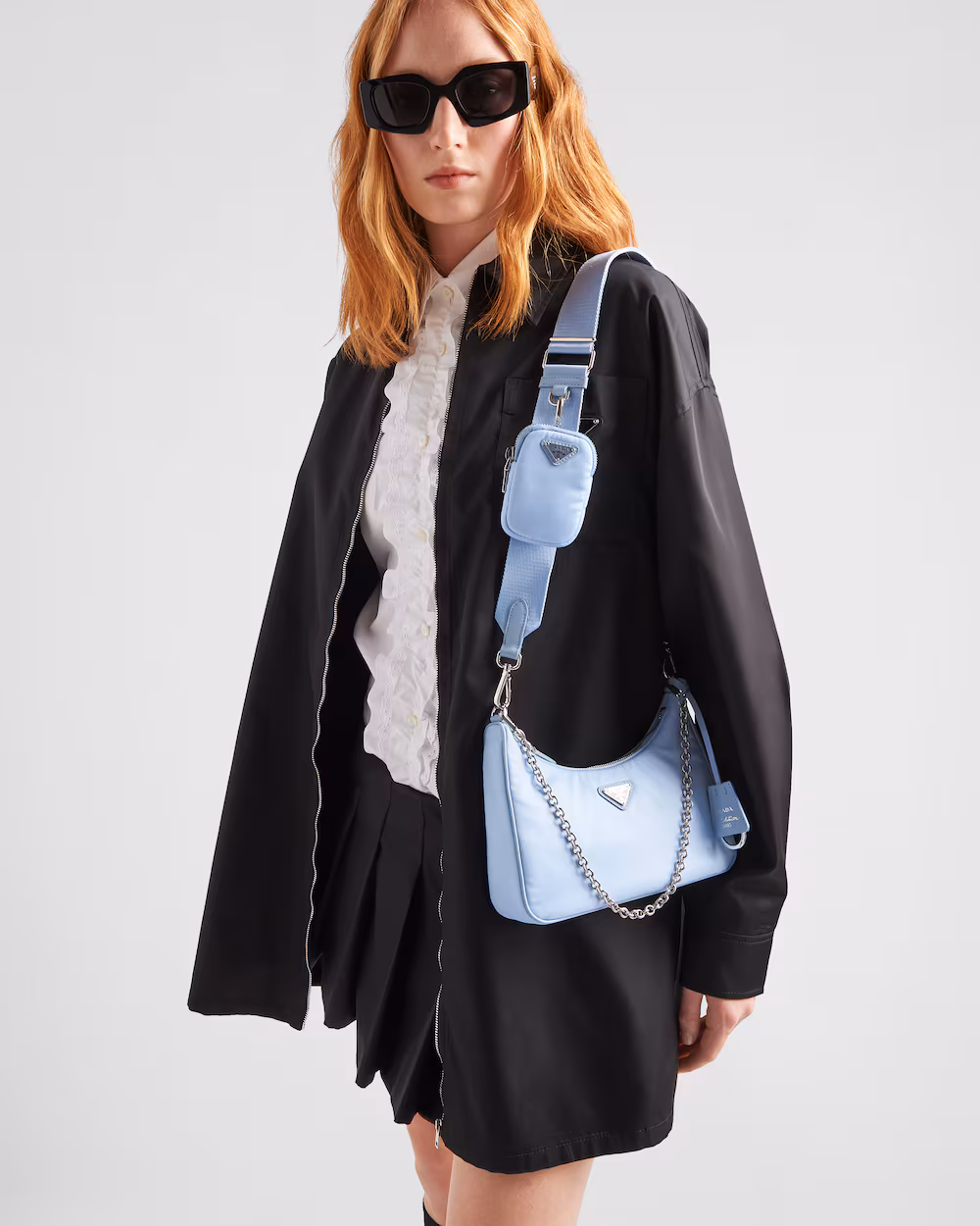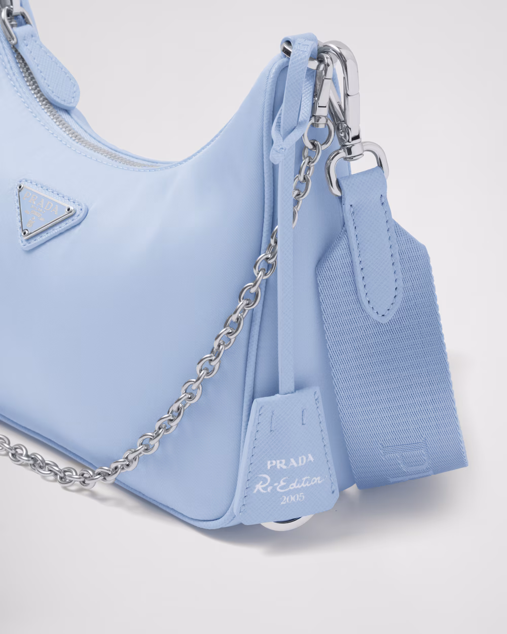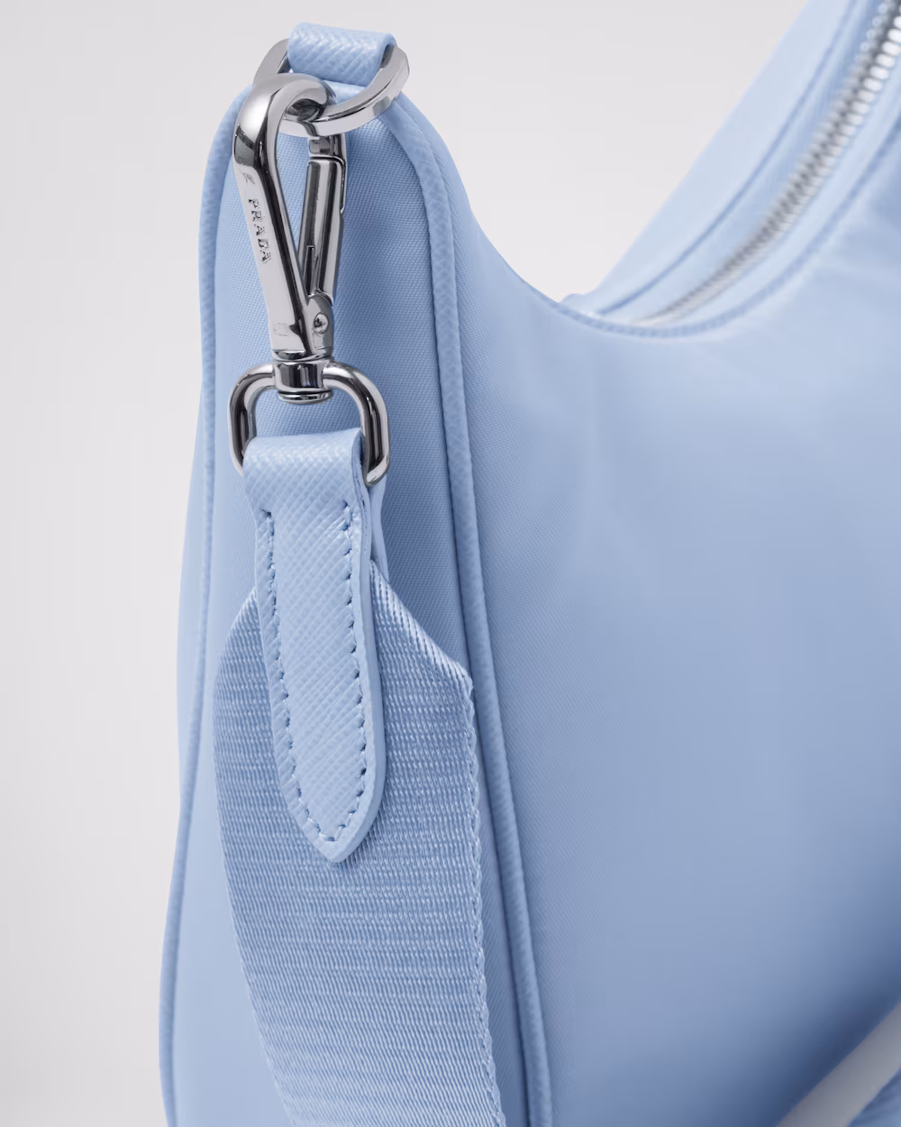 Inspired by the iconic mini hobo bag, the Prada Re-Edition 2005 shoulder bag is made of Re-Nylon: a regenerated nylon yarn (ECONYL®)produced from recycled, purified plastic trash collected in the ocean, fishing nets and textile waste fibers. This versatile bag with Saffiano leather trim comes with a detachable pouch attached to the shoulder strap. For sustainable care to preserve the product's characteristics and reduce microfiber shedding, we recommend not washing the item too often. Let the product air out after every use and have it dry cleaned at a specialized ecological dry cleaners.