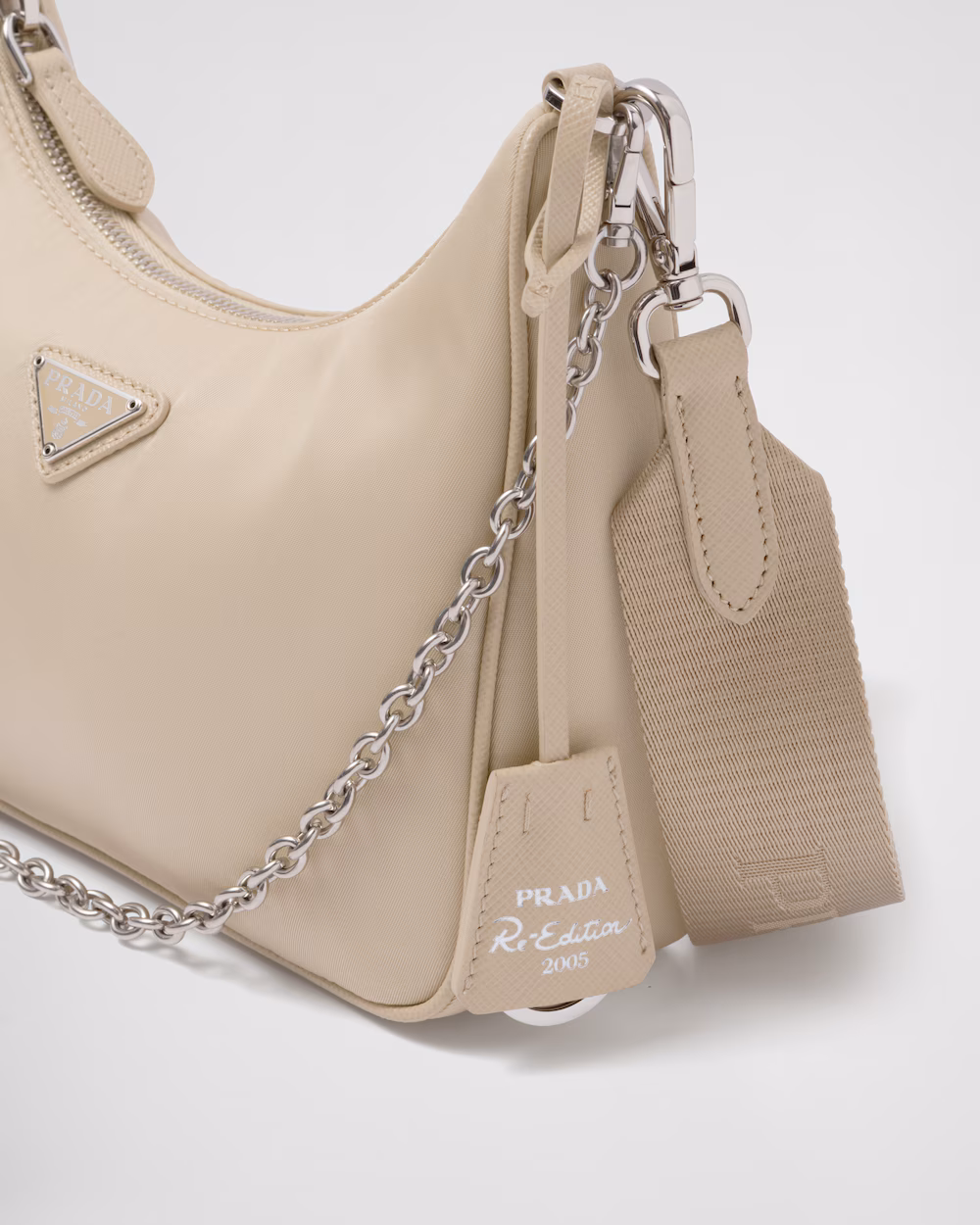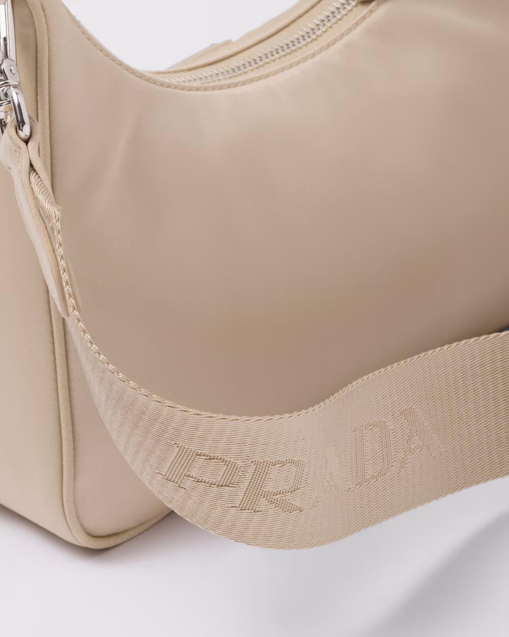 Inspired by the iconic mini hobo bag, the Prada Re-Edition 2005 shoulder bag is made of Re-Nylon: a regenerated nylon yarn (ECONYL®)produced from recycled, purified plastic trash collected in the ocean, fishing nets and textile waste fibers. This versatile bag with Saffiano leather trim comes with a detachable pouch attached to the shoulder strap. For sustainable care to preserve the product's characteristics and reduce microfiber shedding, we recommend not washing the item too often. Let the product air out after every use and have it dry cleaned at a specialized ecological dry cleaners.