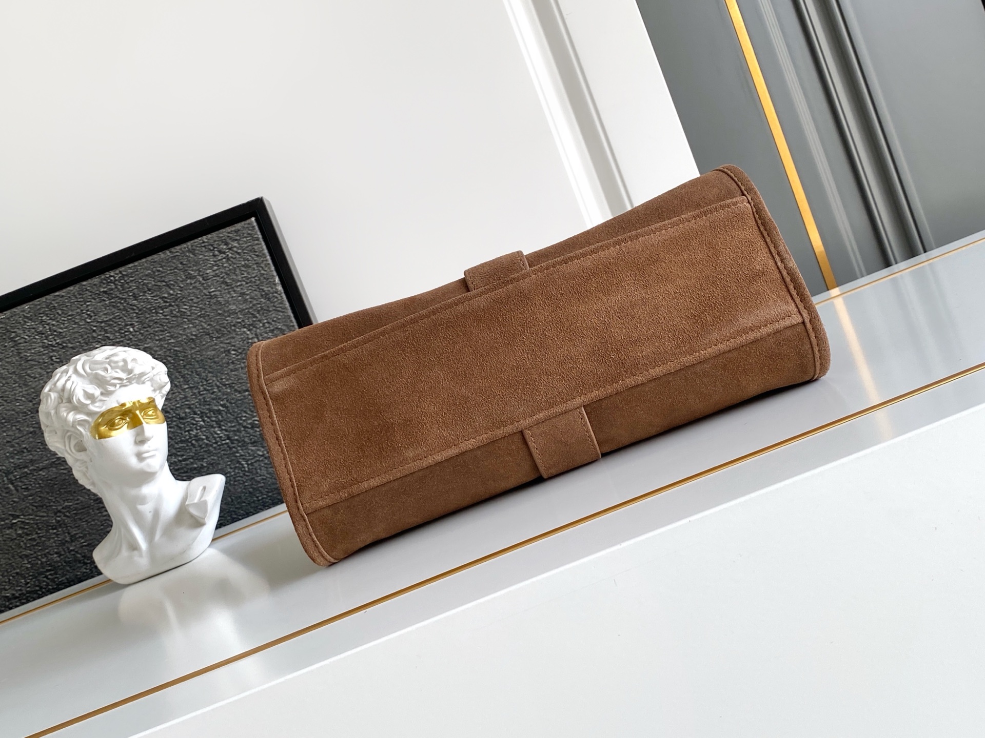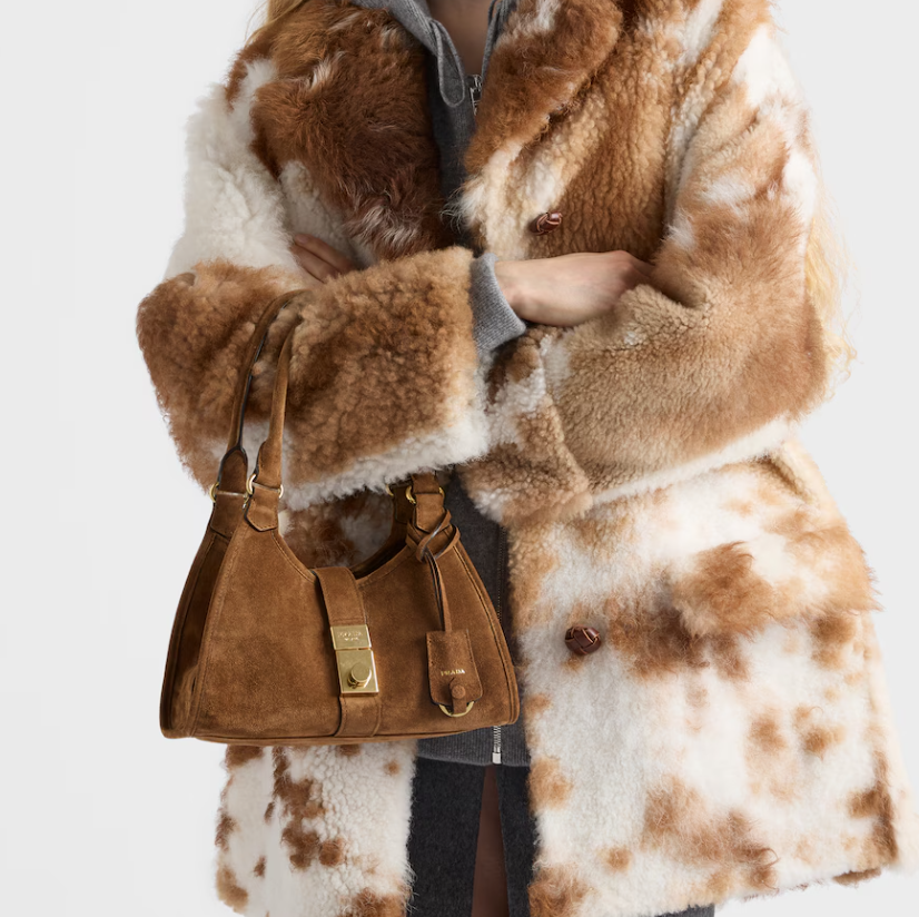 Geometric lines and refined artisan details define this suede bag with soft volumes. The trapezoidal silhouette features elongated handles for easy wear, also as a shoulder bag. The vertical clasp, inspired by the archives, and the leather mirror case complete the accessory with a sophisticated note.