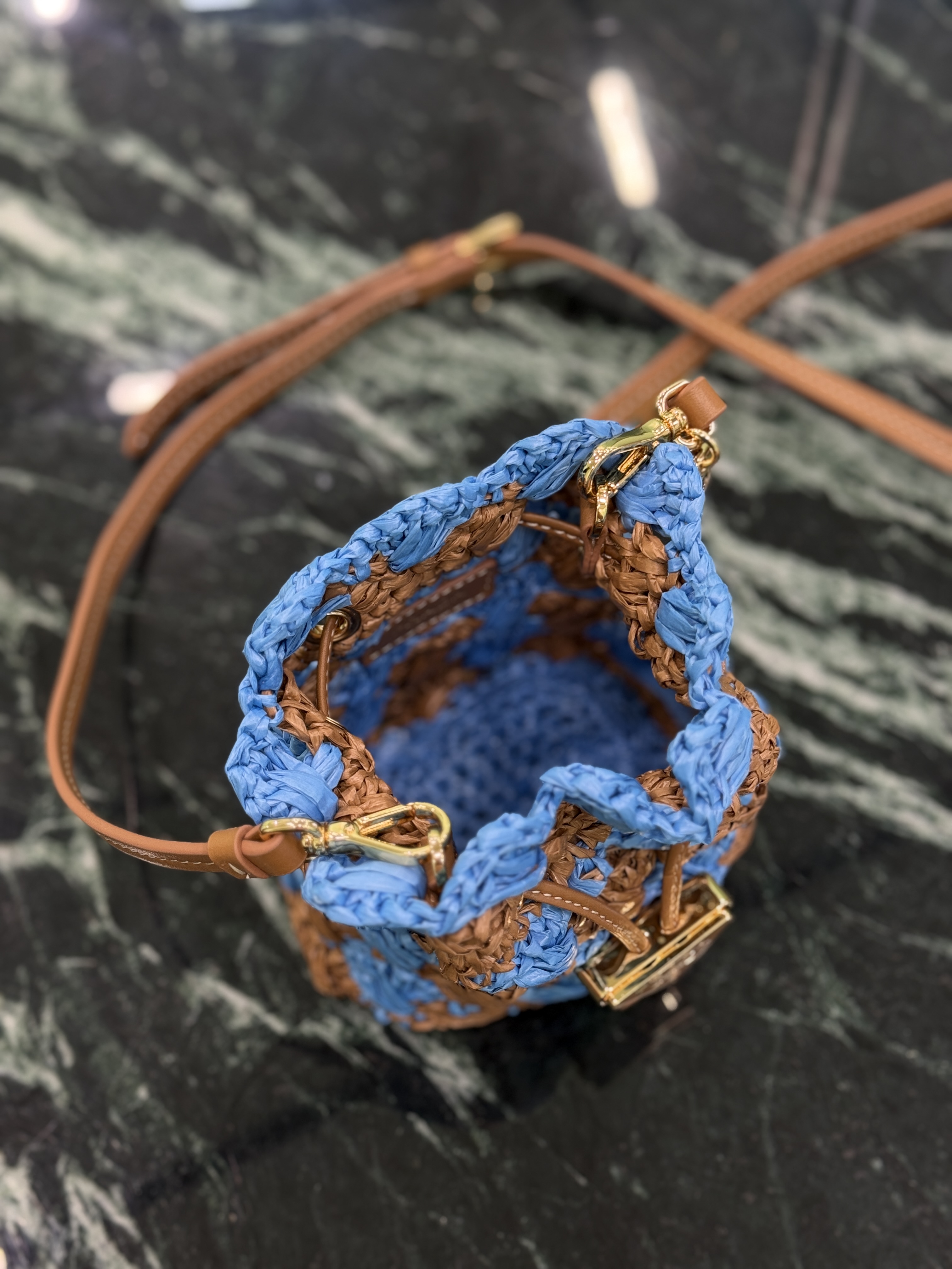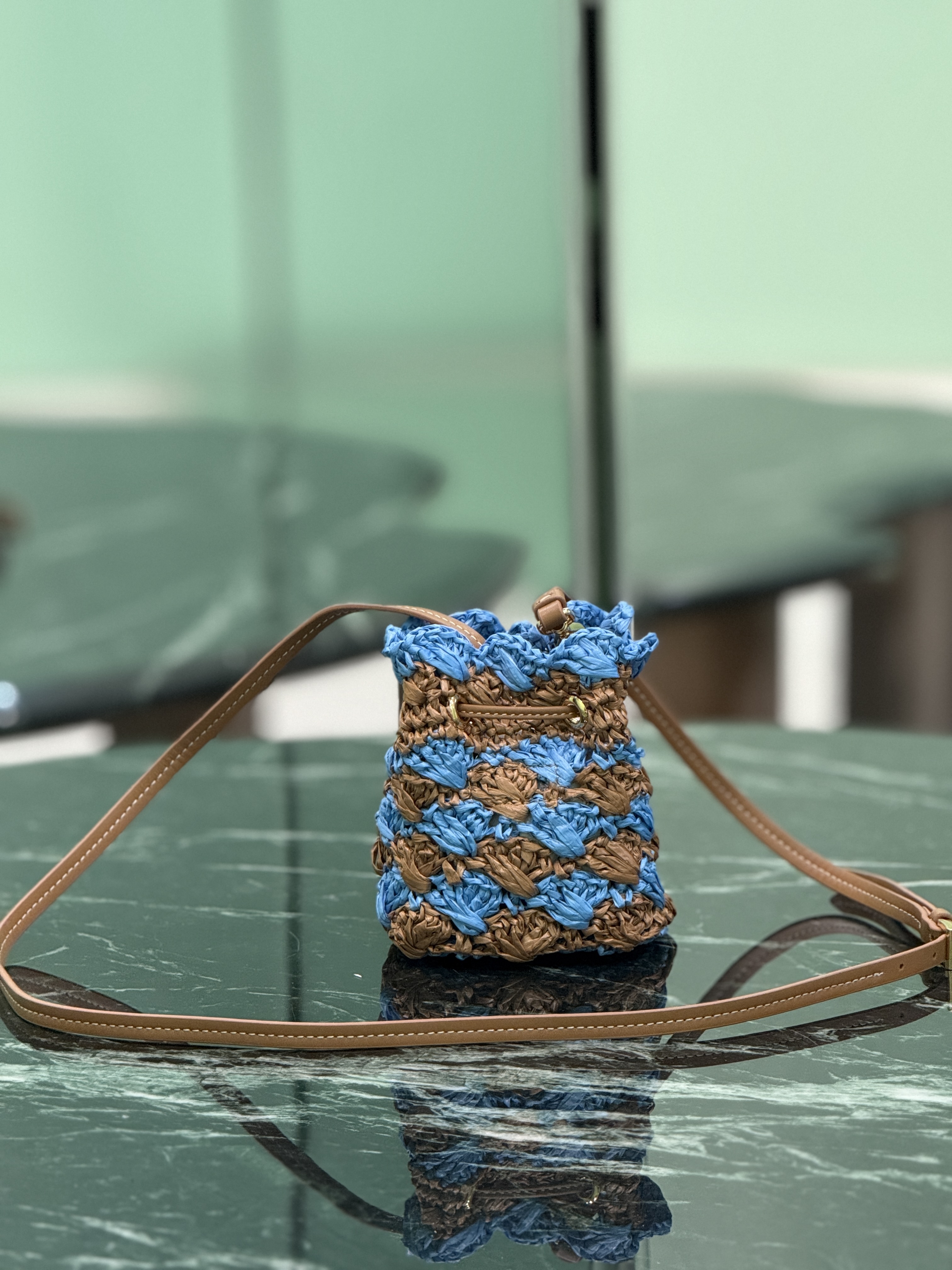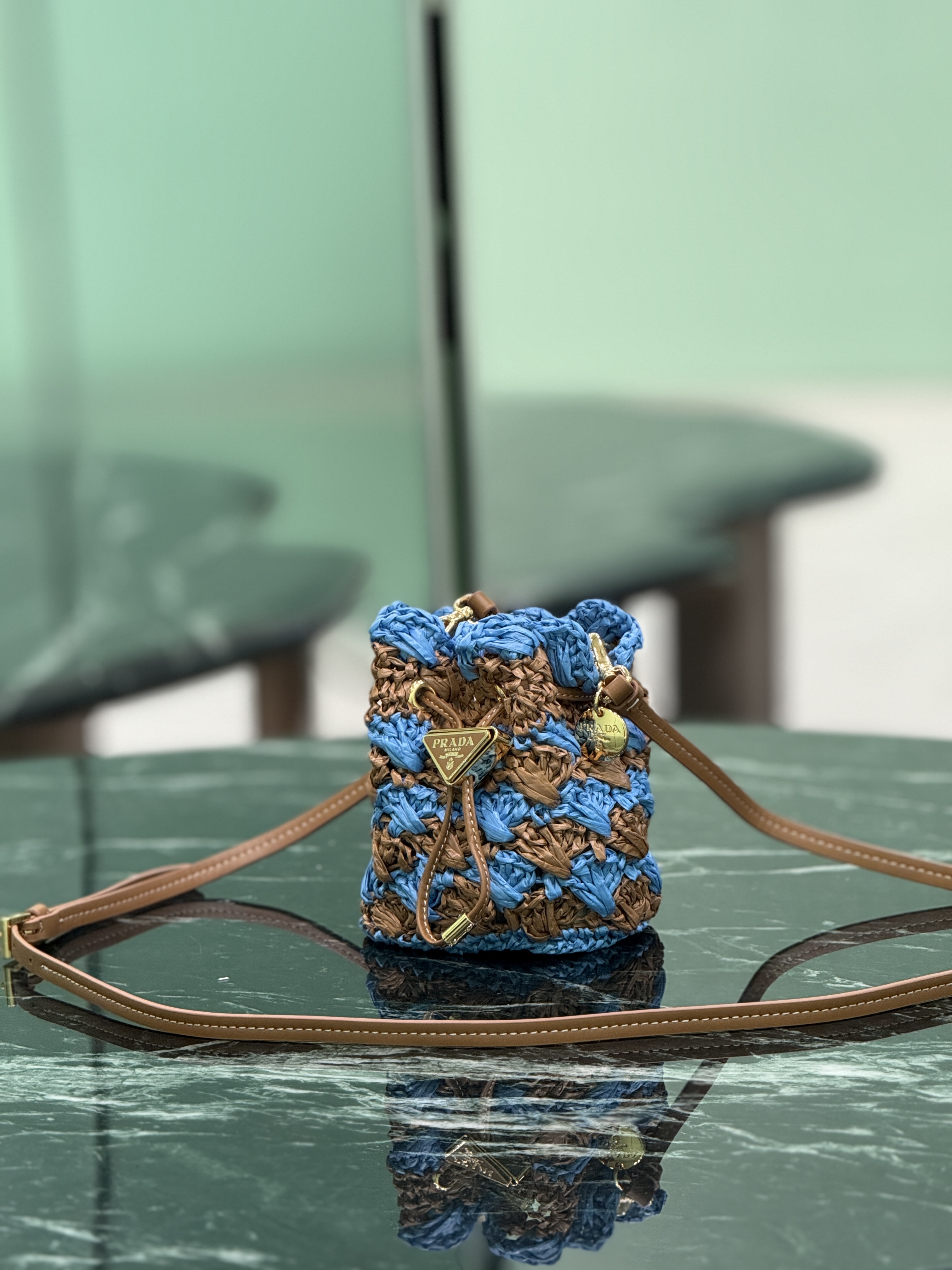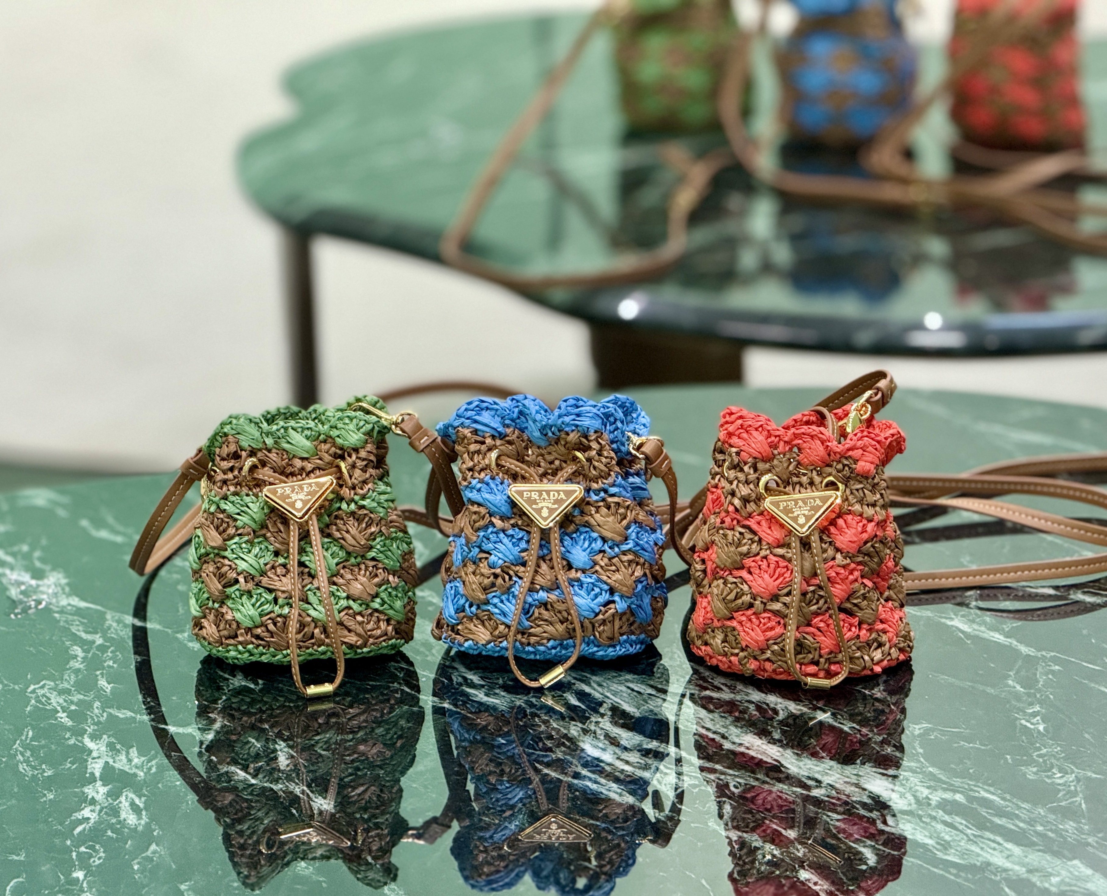 This handwoven Prada mini bucket bag is absolutely adorable! Featuring a colorful woven design with an enamel-coated metal triangle logo detail at the closure. Comes with a matching leather shoulder strap for easy crossbody wear. So chic and playful!