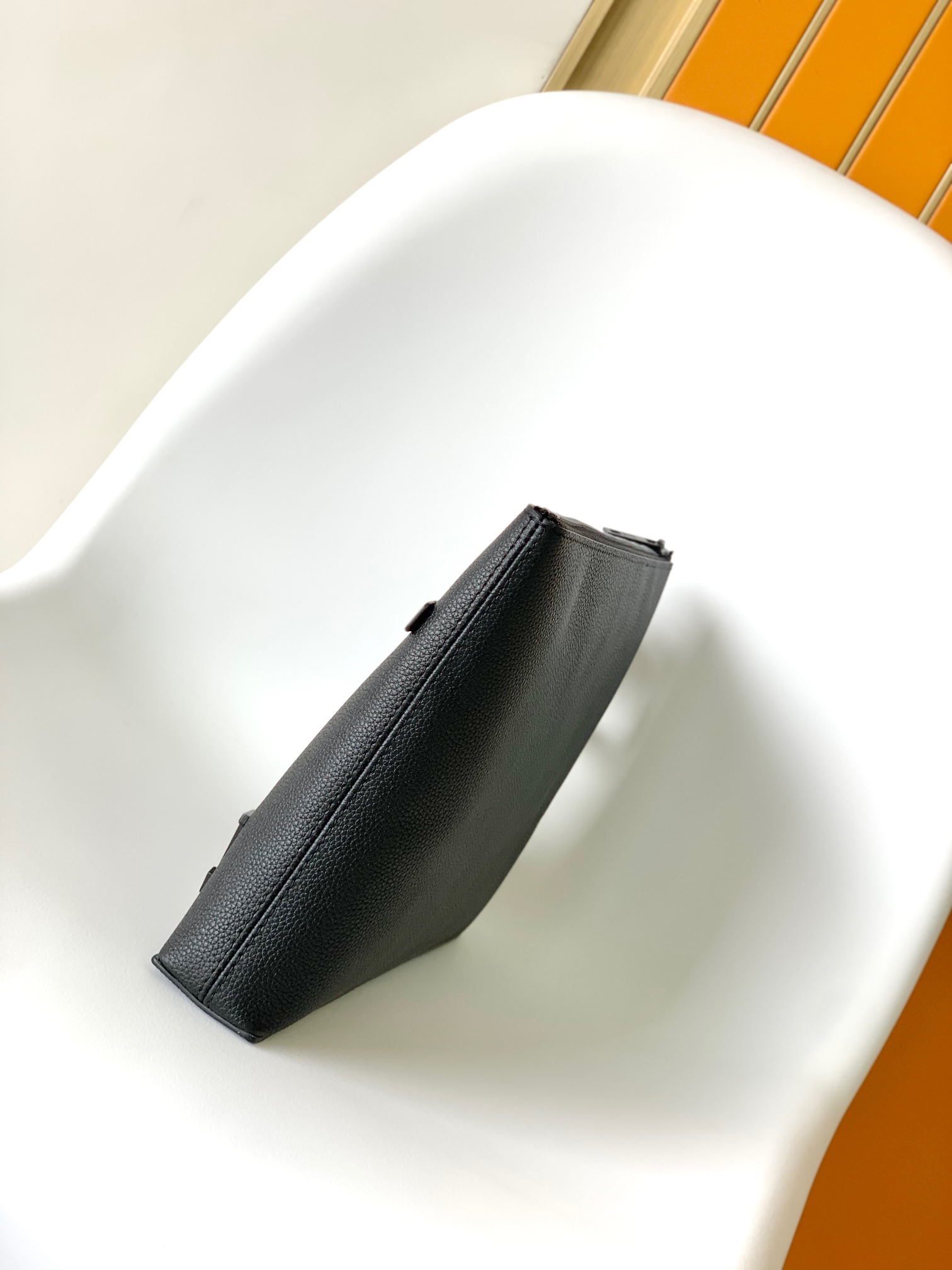 The pared-down design of the LV Aerogram Takeoff Pouch makes it a fashionable and functional accessory. Crafted in fine black calf leather, whose soft, supple feel recalls an old-fashioned aerogram, it features the “LV” initials in black metal and a customizable tag for an understated signature touch – plus user-friendly extras like a removable leather wristband.