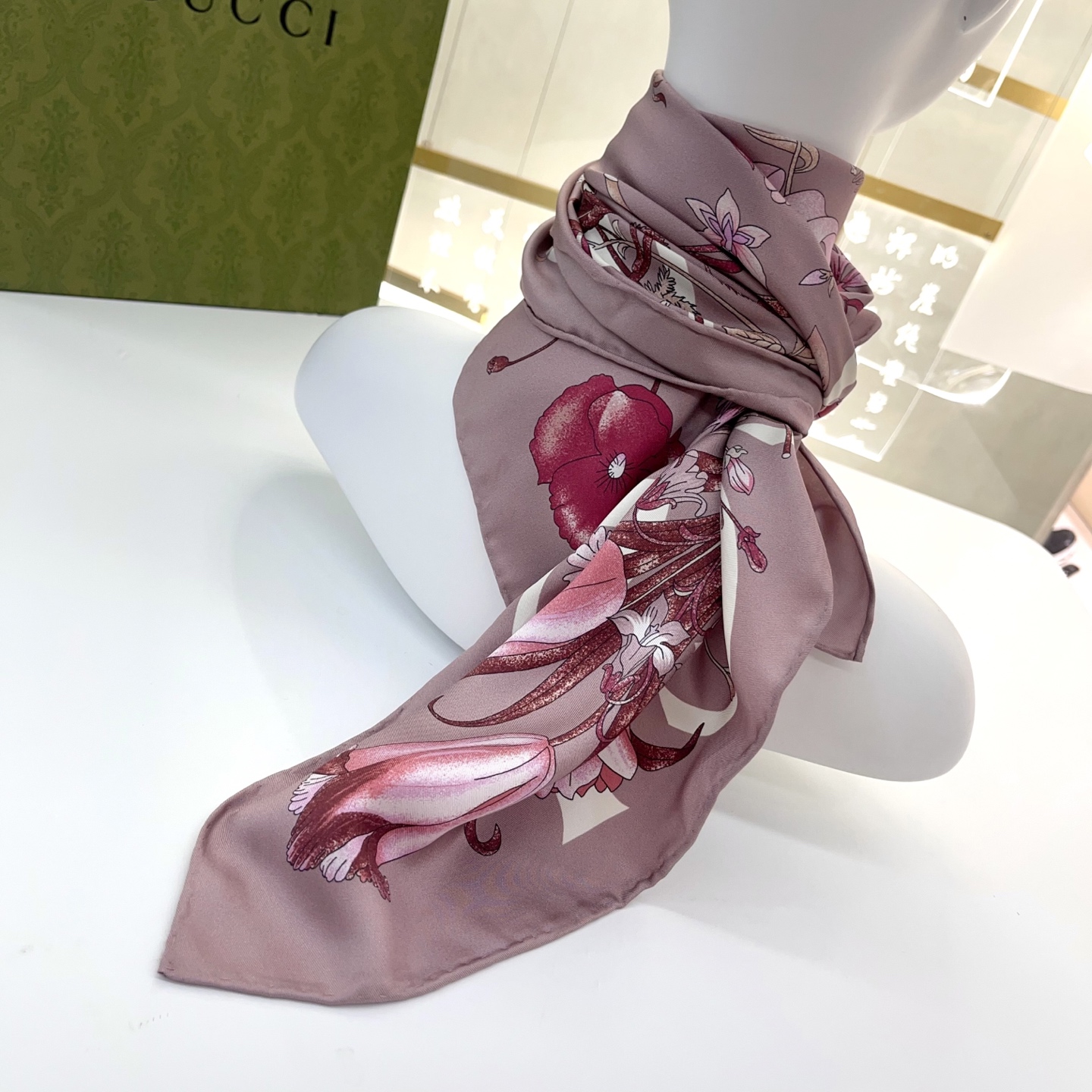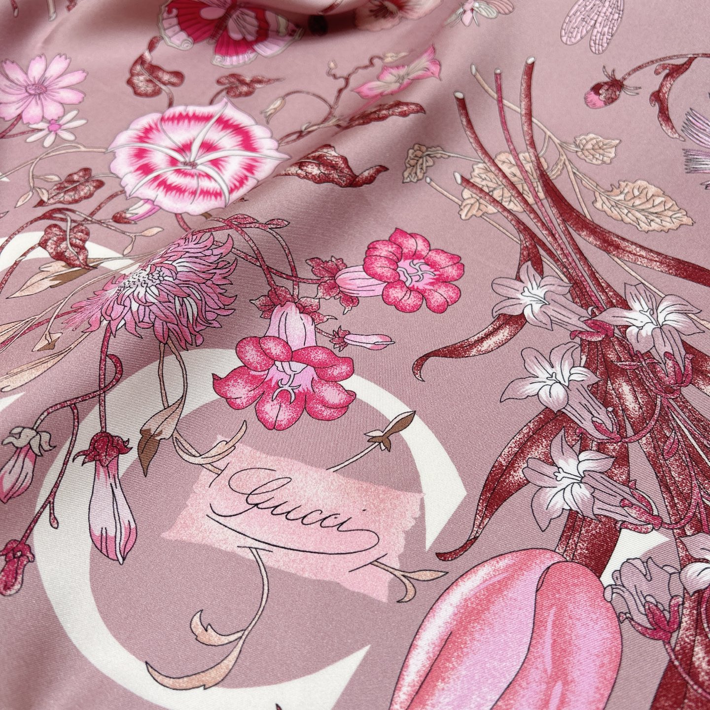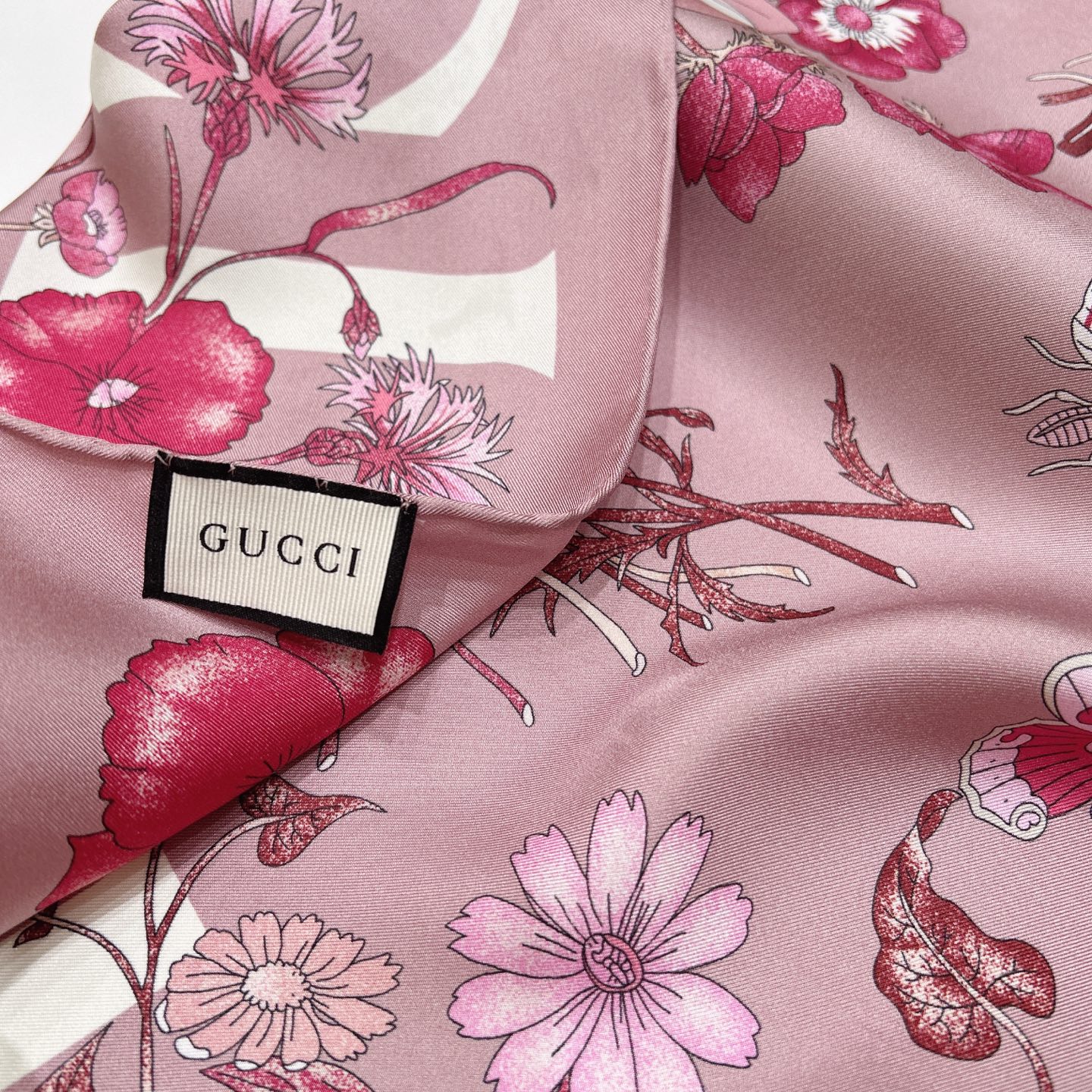 The Flora floral print, a timeless design, is reinterpreted in the 2025 Early Spring collection. This iconic pattern appears on a series of soft, smooth silk accessories in delicate pastel tones, infusing each piece with a romantic flair. This square scarf is crafted from light blue silk and is beautifully adorned with the Gucci Flora floral print, adding a romantic touch to any outfit.