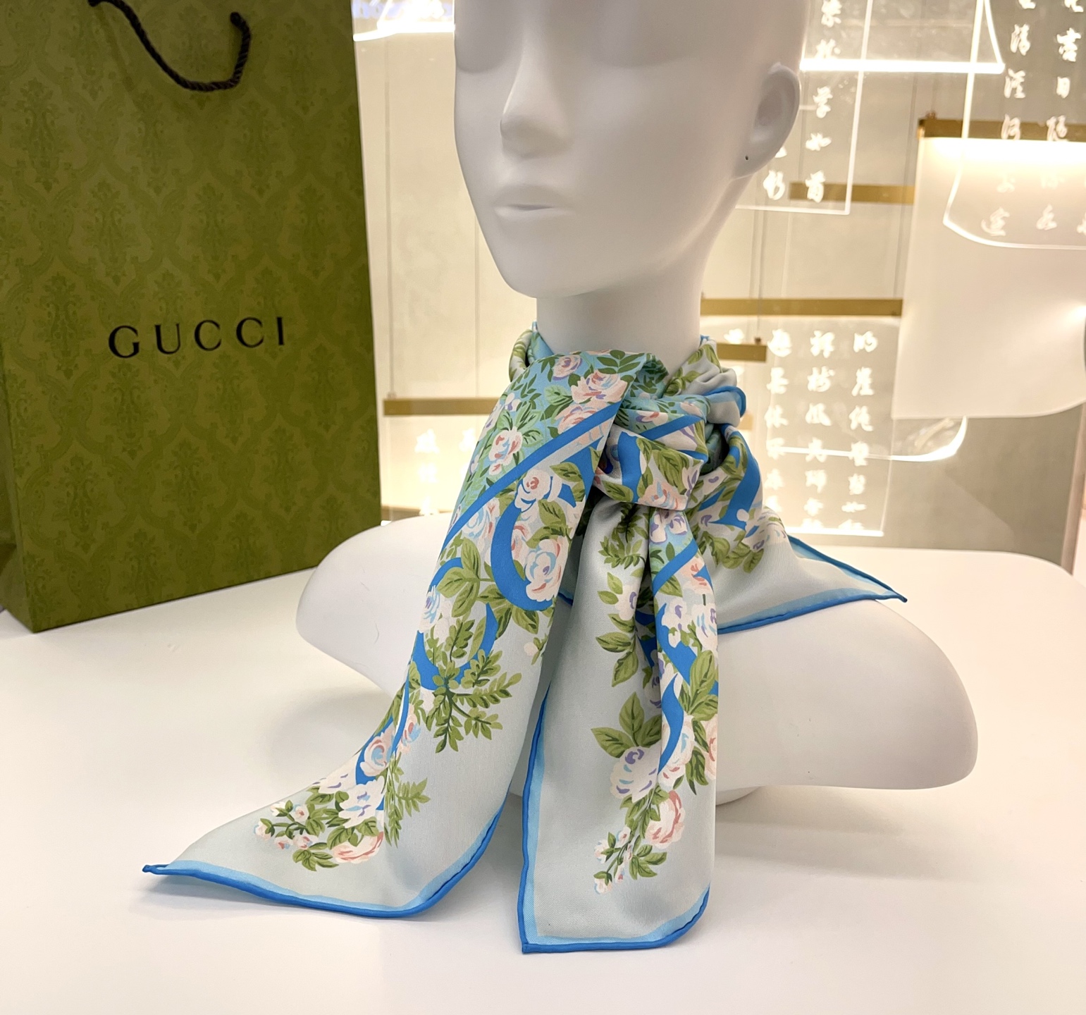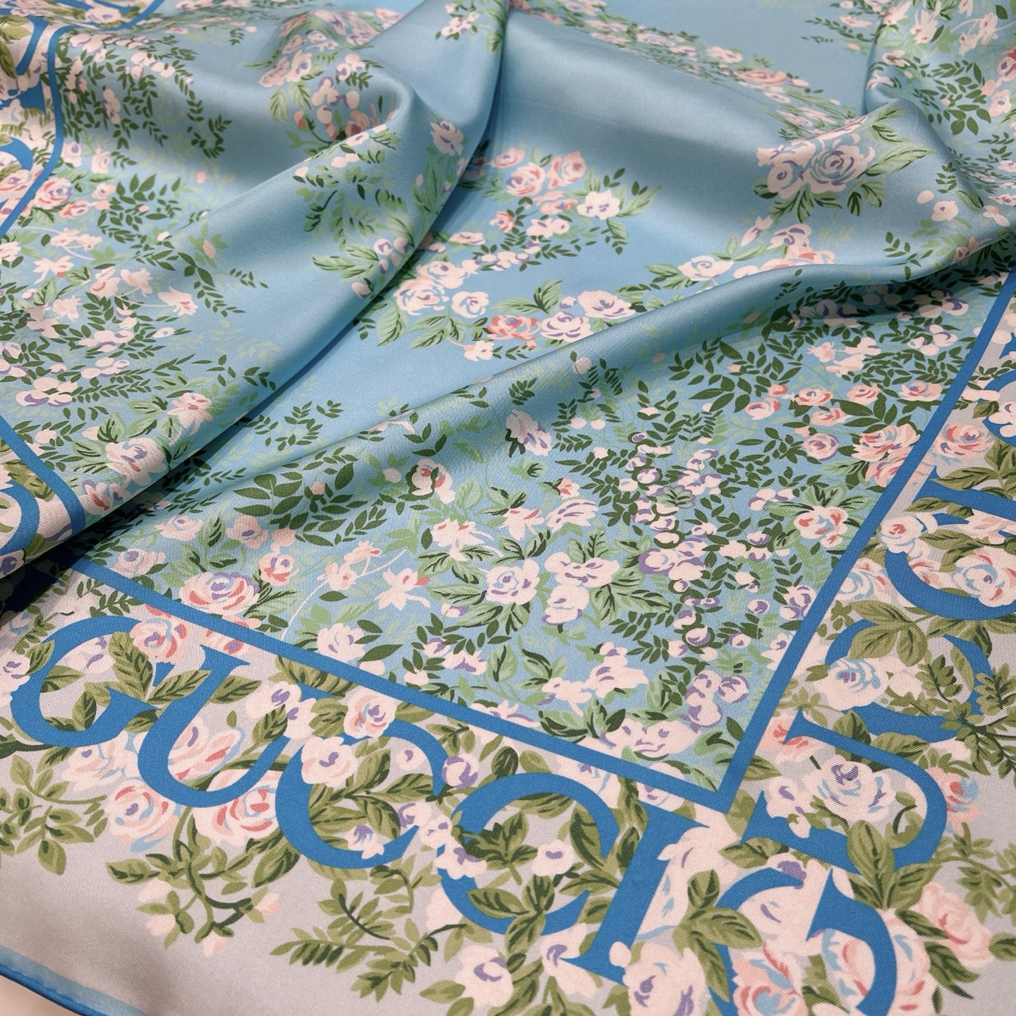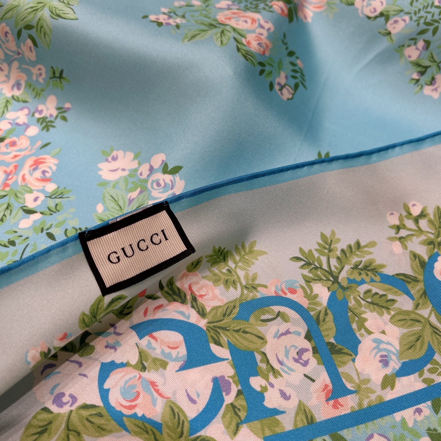 In the Early Spring Collection, a variety of soft, smooth accessories beautifully showcase floral patterns and delicate pastel colors, radiating a romantic vibe. This square scarf is crafted from high-quality silk, adorned with the iconic Gucci interlocking GG floral print all over, adding an elegant and timeless touch to your ensemble.