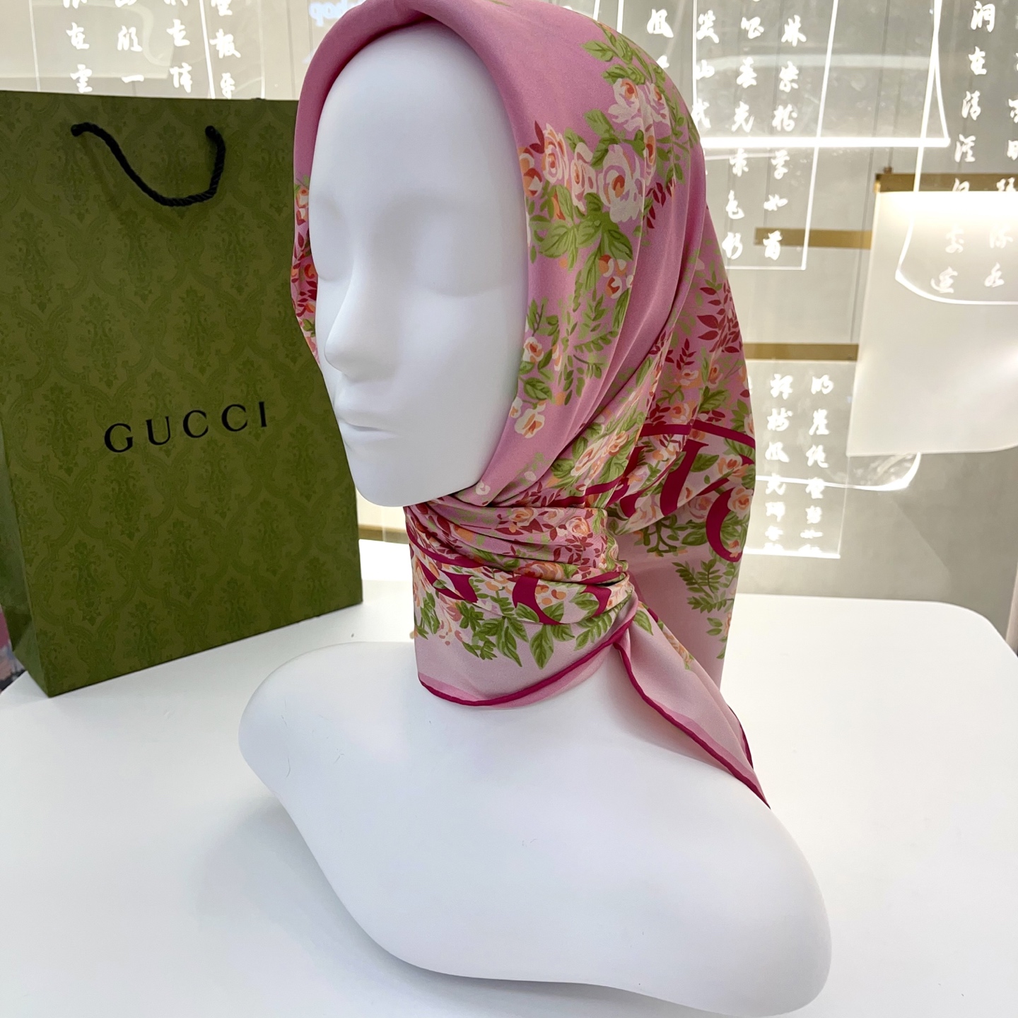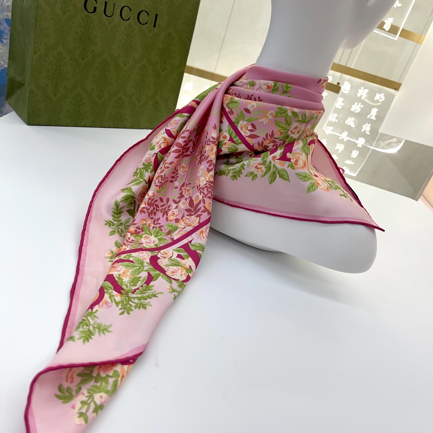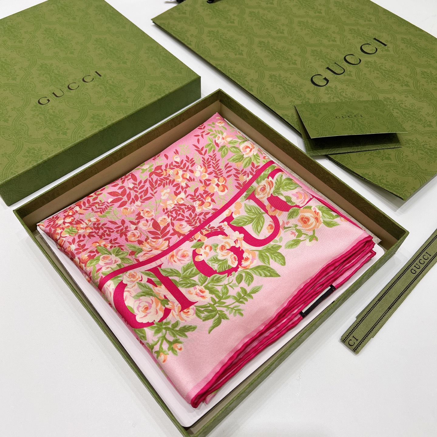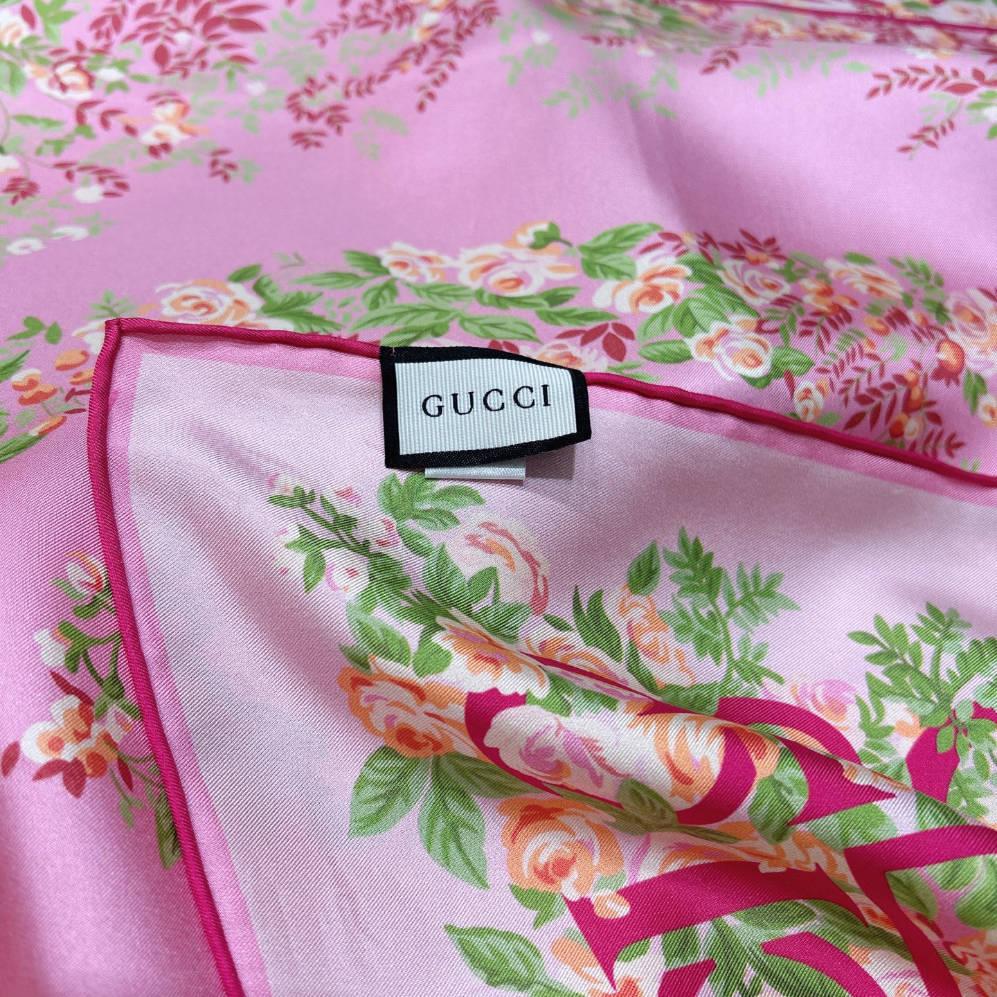 In the Early Spring Collection, a variety of soft, smooth accessories beautifully showcase floral patterns and delicate pastel colors, radiating a romantic vibe. This square scarf is crafted from high-quality silk, adorned with the iconic Gucci interlocking GG floral print all over, adding an elegant and timeless touch to your ensemble.