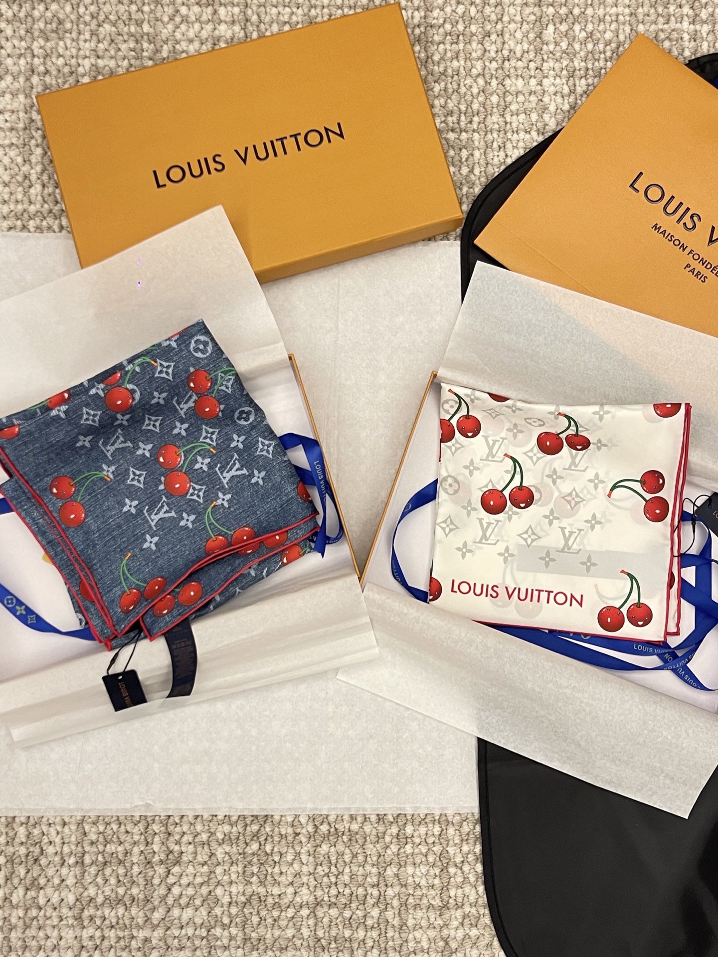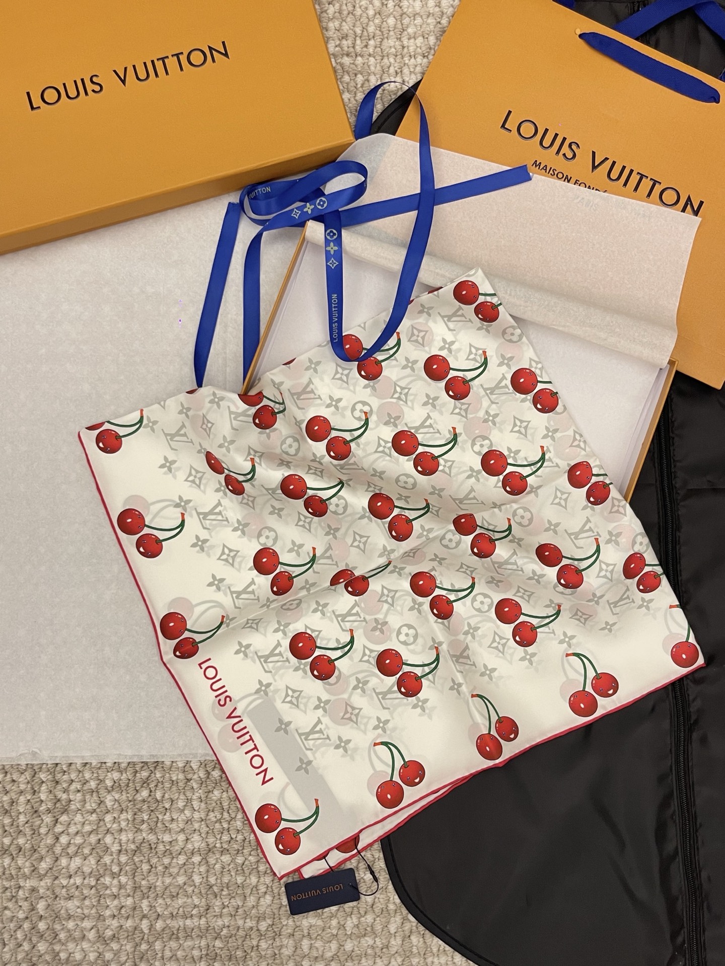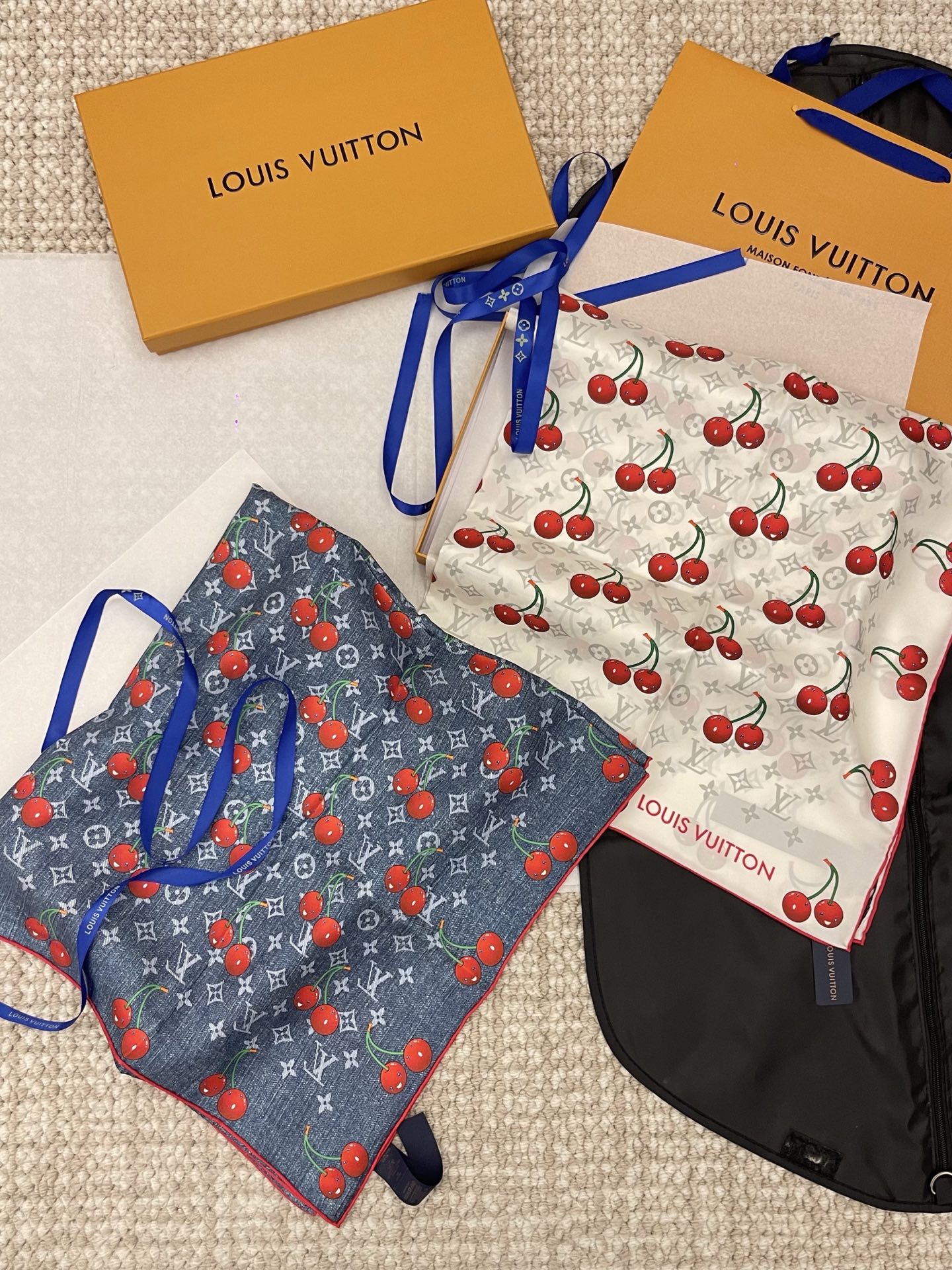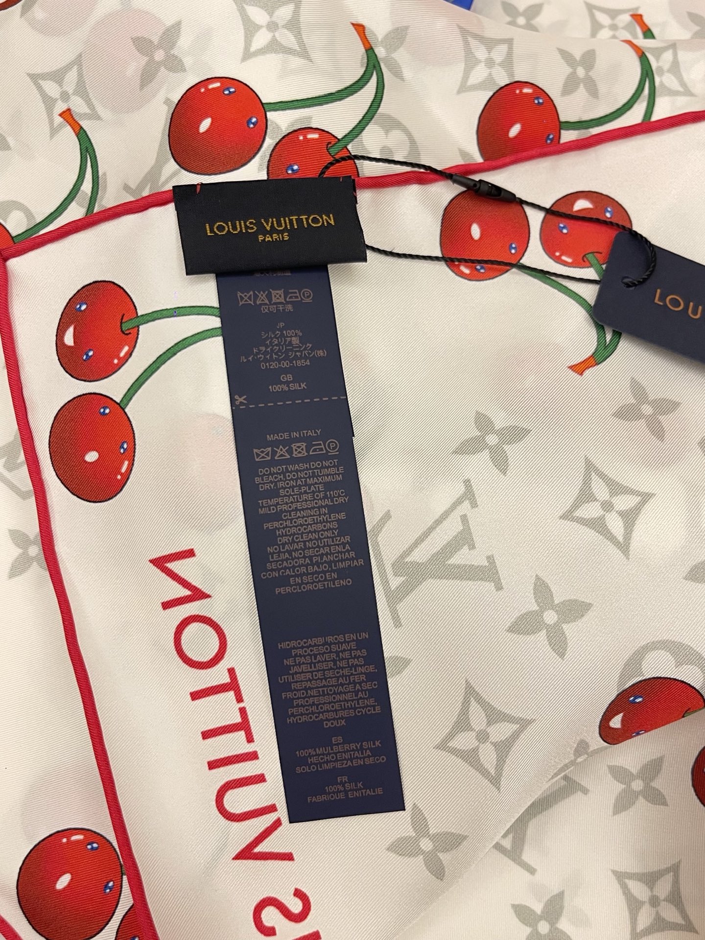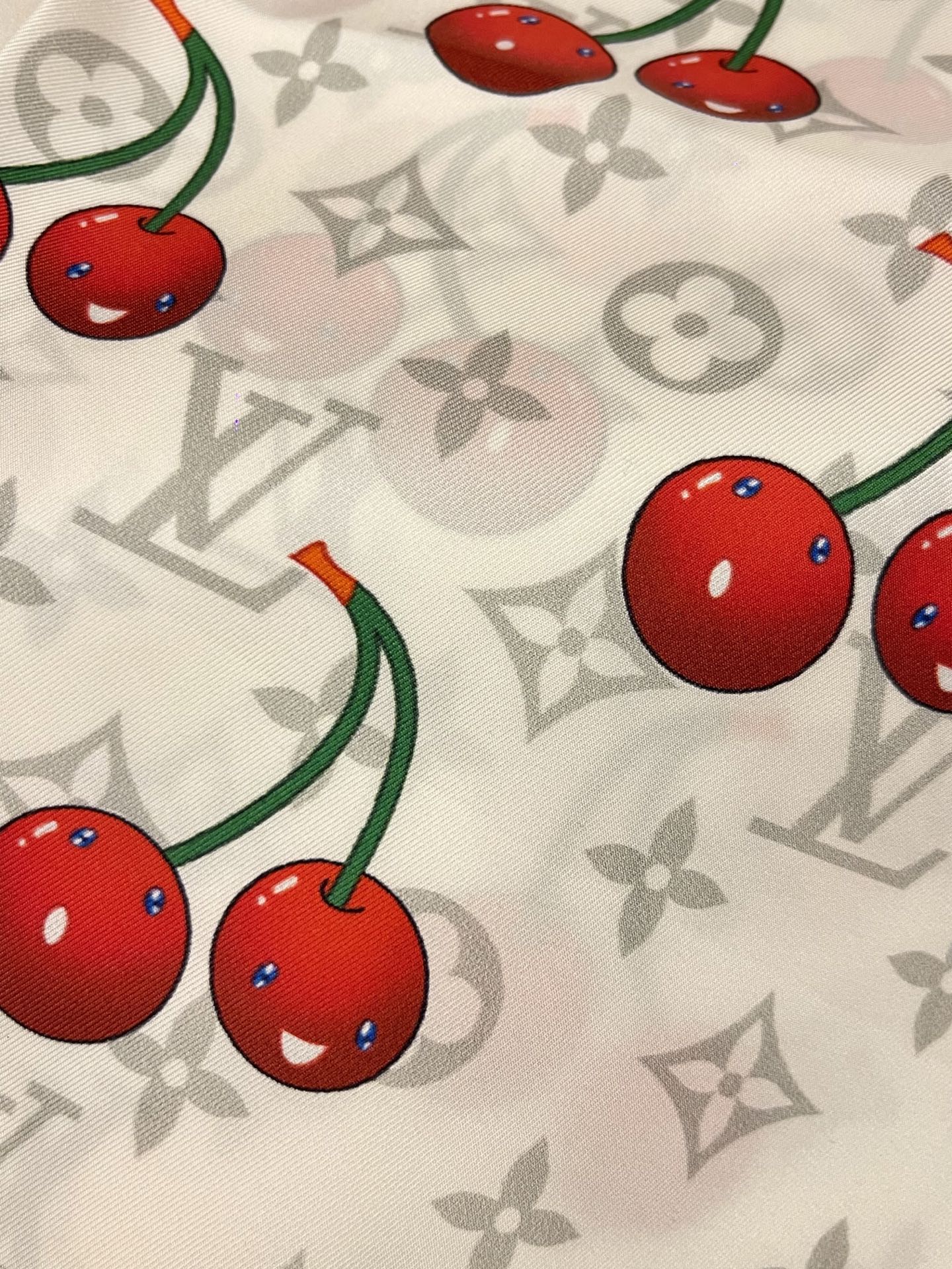 he all-silk LV x TM Monogram Cerise square offers a light-hearted artistic update of a classic House signature. Created for the re-edition of the Louis Vuitton x Murakami collection, it features the renowned Japanese artist’s colorful, whimsical cherries against a subtle Monogram background. With its upbeat summery style, it adds a vibrant, eye-catching accent to any outfit, and goes perfectly with the other creations in the collection.