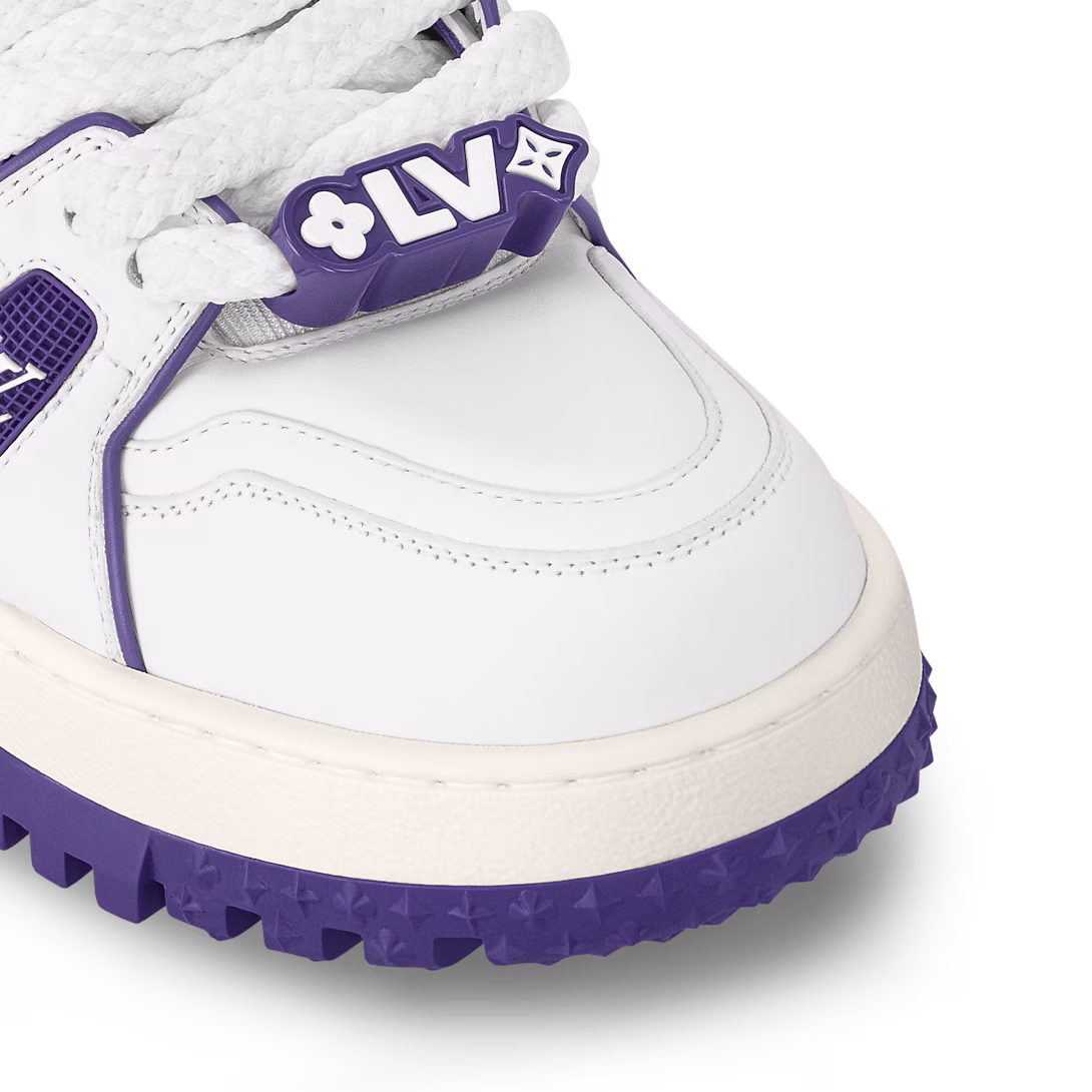 Now available for women, the LV Trainer Maxi sneaker is an oversized version of the LV Trainer sneaker originally designed by Virgil Abloh. Notable for its exaggerated, padded tongue and chunky outsole, this model comes in calf leather with rubber logos. It is finished with thick textile laces embellished with Louis Vuitton signature beads.