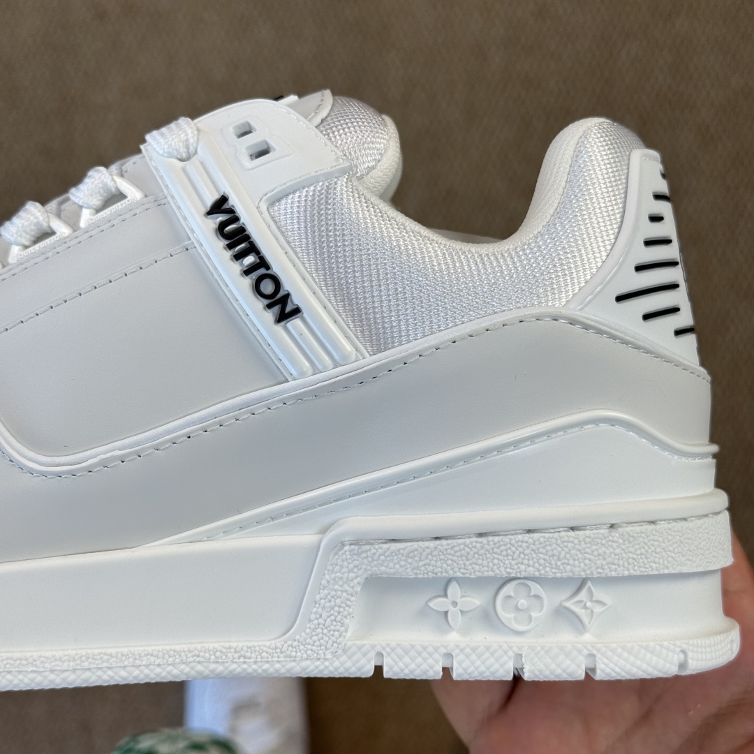 This exclusive edition of the LV Trainer sneaker celebrates the collaboration between Pharrell Williams and Nigo for the Louis Vuitton Fall-Winter 2025 men's show. The upper, in smooth calf leather, is embellished with a tag featuring the designers' initials in studs, while the back of the sneaker is embossed with their profiles. Rubber LV Initials and Vuitton signatures complete this striking design.
