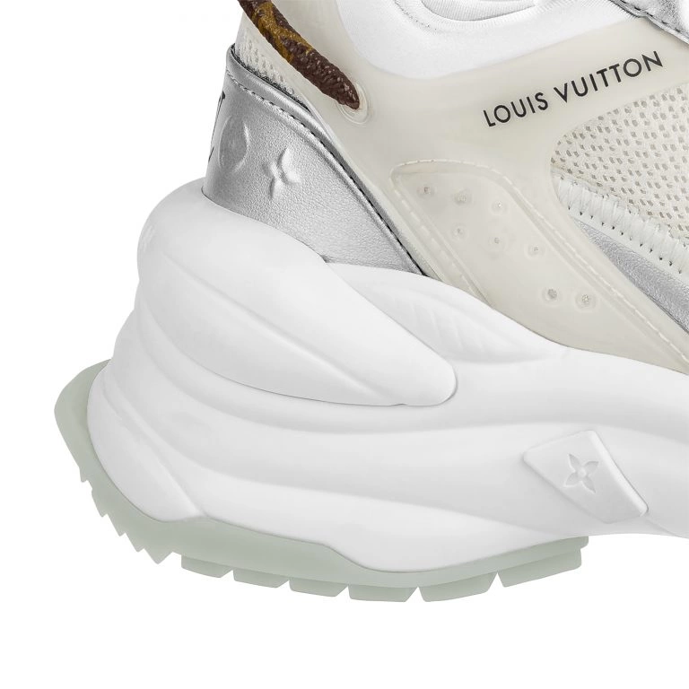 Inspired by racewear, the Run 55 sneaker is characterized by its lifted rubber outsole, which offers optimum comfort and bounce. On this version, which is crafted from a mix of materials including technical mesh, the sporty aesthetic is balanced by metallic gold leather trim. This model is notable for its many signature details, including a Monogram-canvas strap at the back.
