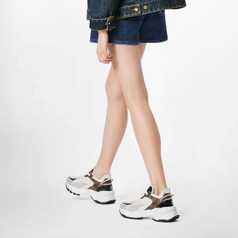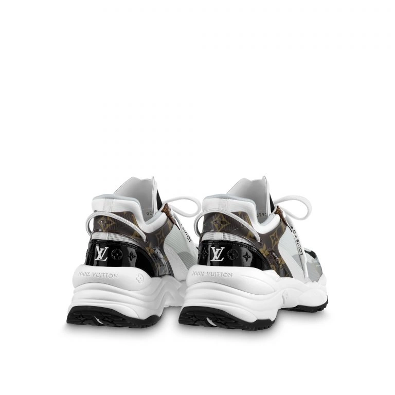 The Run 55 sneaker comes in a mix of technical materials, which are overlaid on the elaborately constructed upper. Monogram-canvas trim complements this design, which is notable for its numerous signature details, including the LV Circle logo on the tongue. It is finished with a lifted rubber outsole for optimum bounce and comfort.