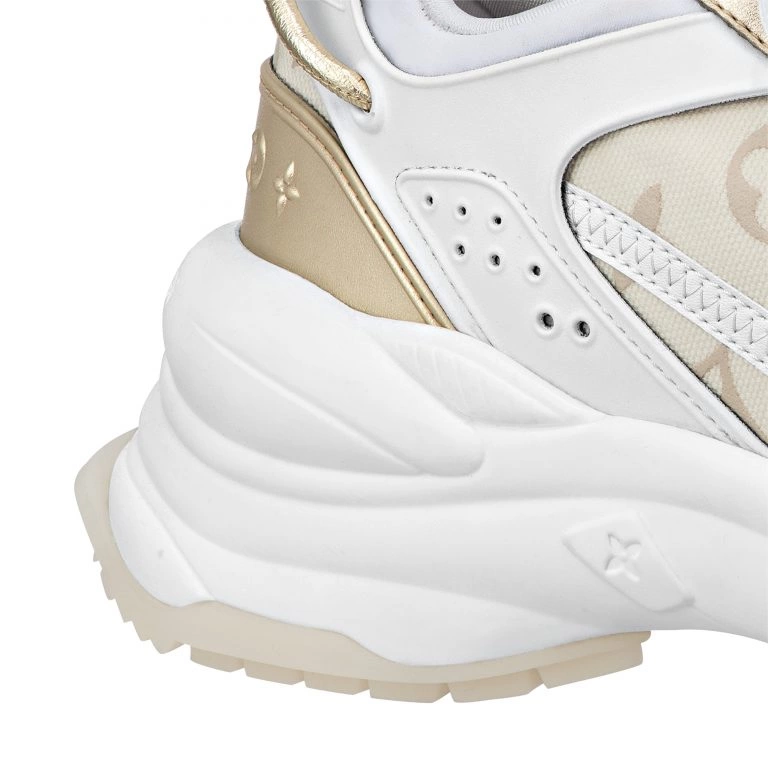 The Run 55 sneaker is reinterpreted this season in a summery version in Monogram denim canvas. Its elaborately constructed upper also features lycra, calf leather and metallic lambskin, notably on the gold-tone spoiler at the back. This model is characterized by its numerous signatures and its lifted rubber outsole, which provides optimum comfort.